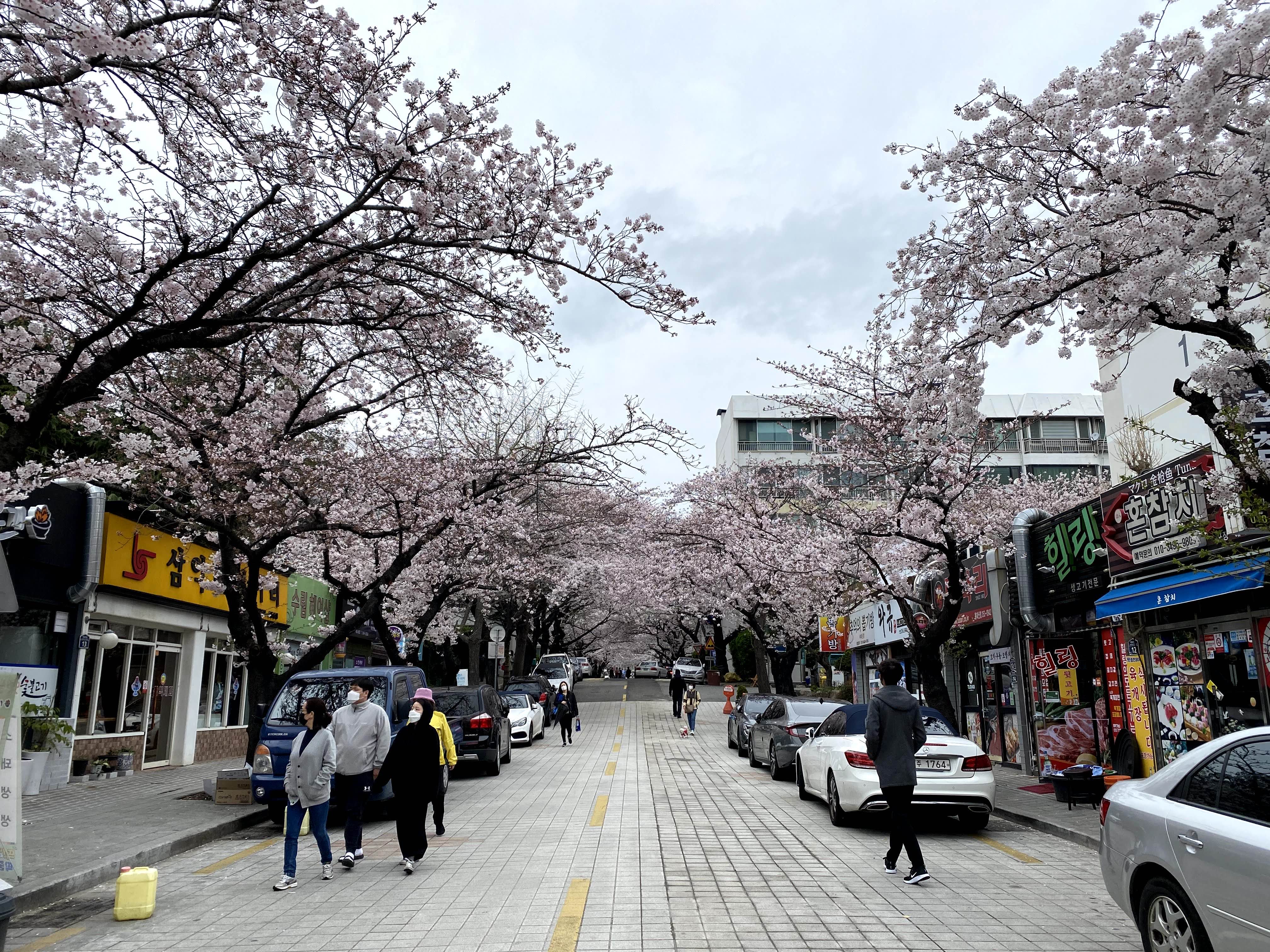 햇볕이 쨍쨍한 맑은 날이면, 파란 하늘과 대조되는 벚꽃이 더 예쁠 것 같다.