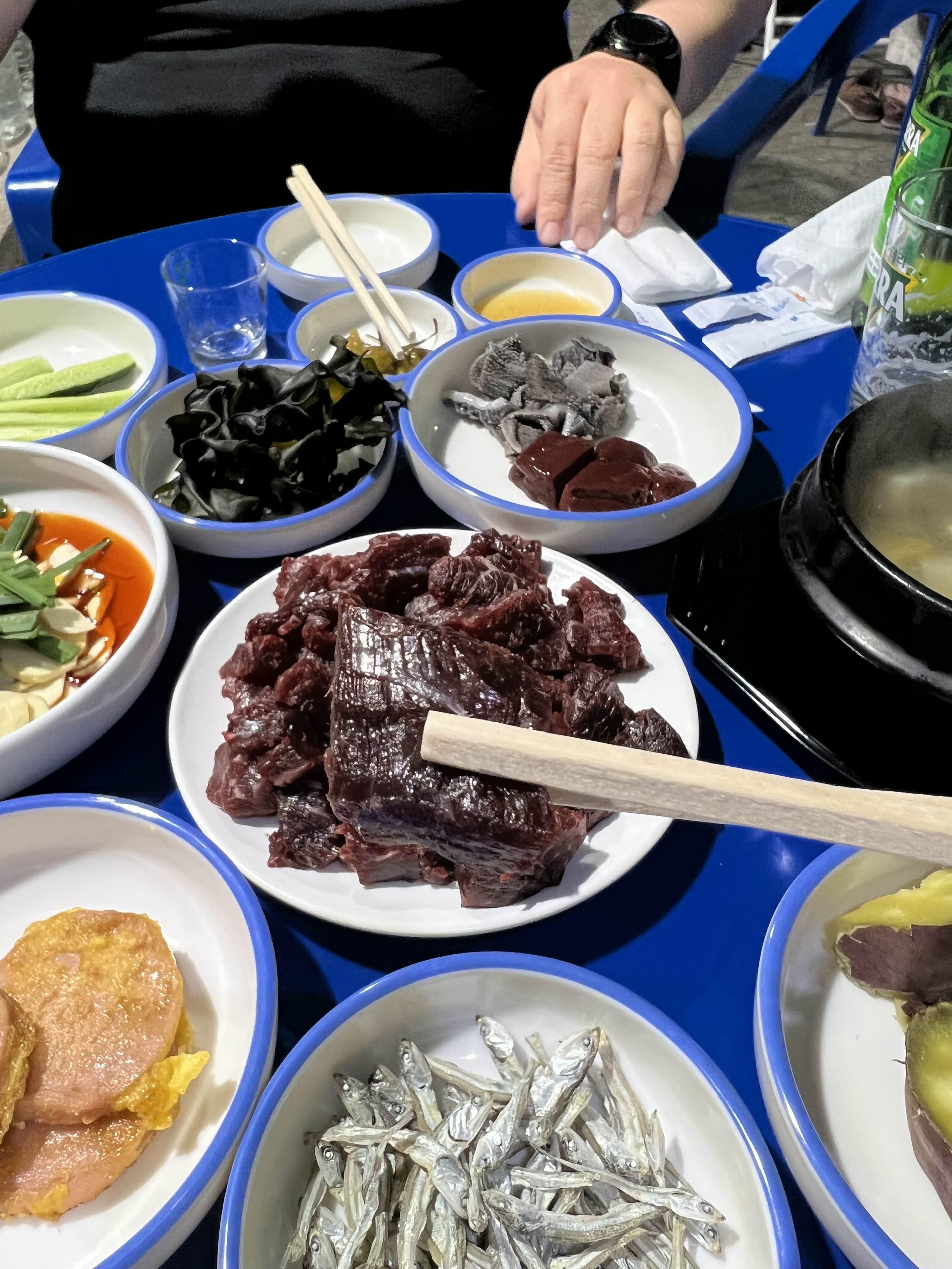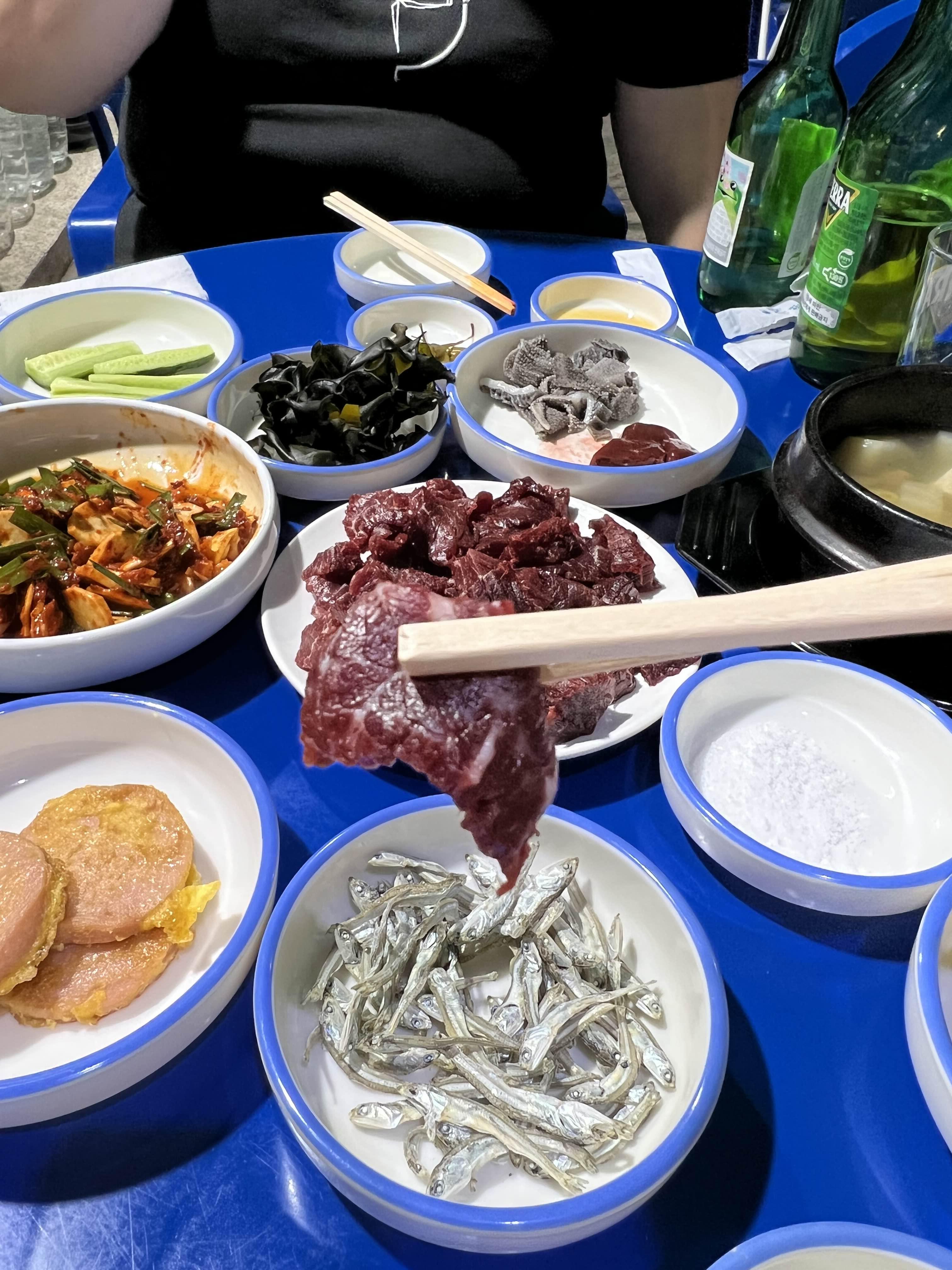 30여분의 기다림 끝에 앉을 수 있었다. 세명이서 생고기 큰 사이즈로 하나 주문하니 기본 안주를 깔아준다. 쇠고기뭇국은 목축임용으로 좋고, 마른멸치와 오이는 주전부리하기 좋다. 추억의 분홍소시지도 보인다.