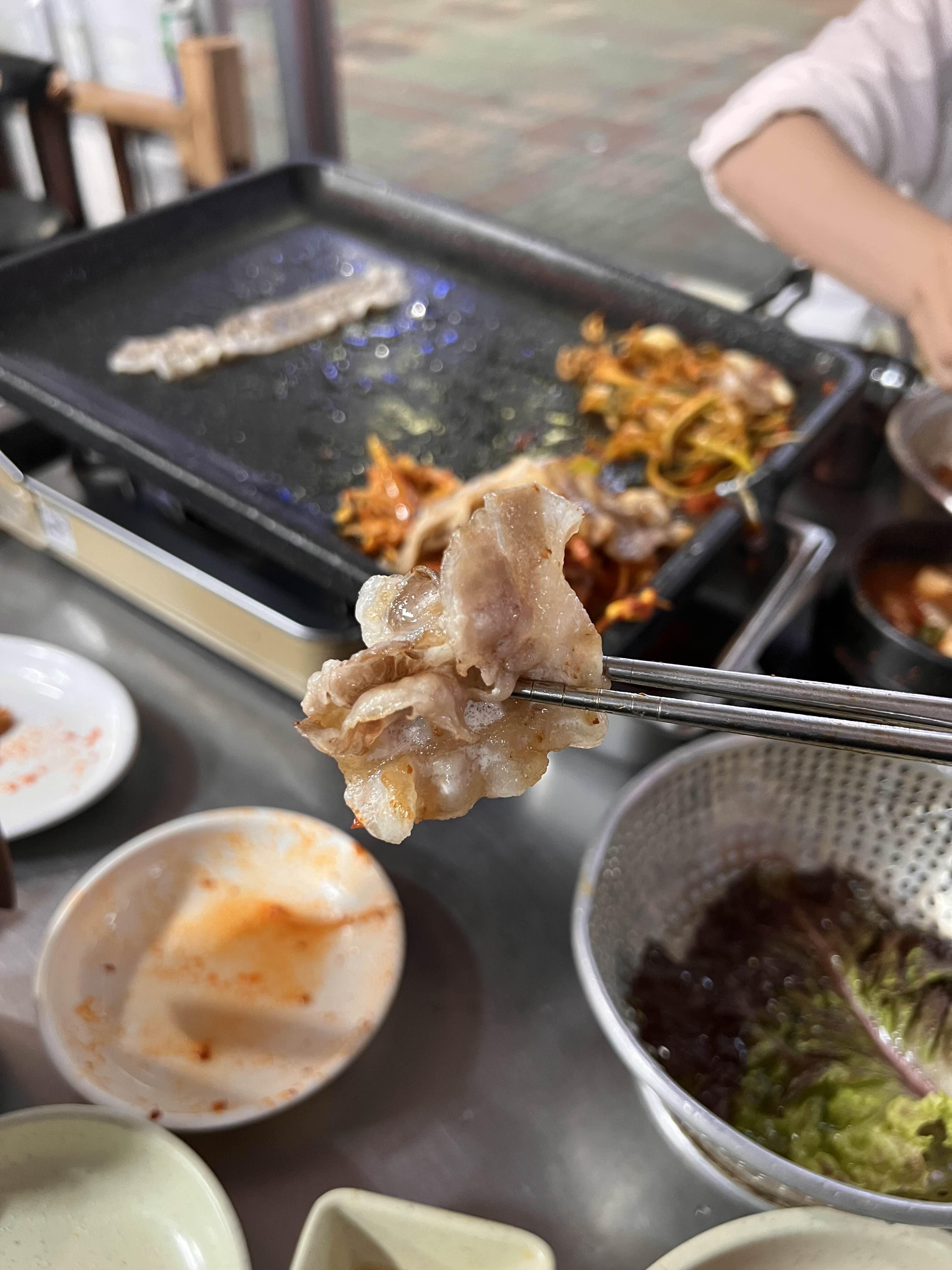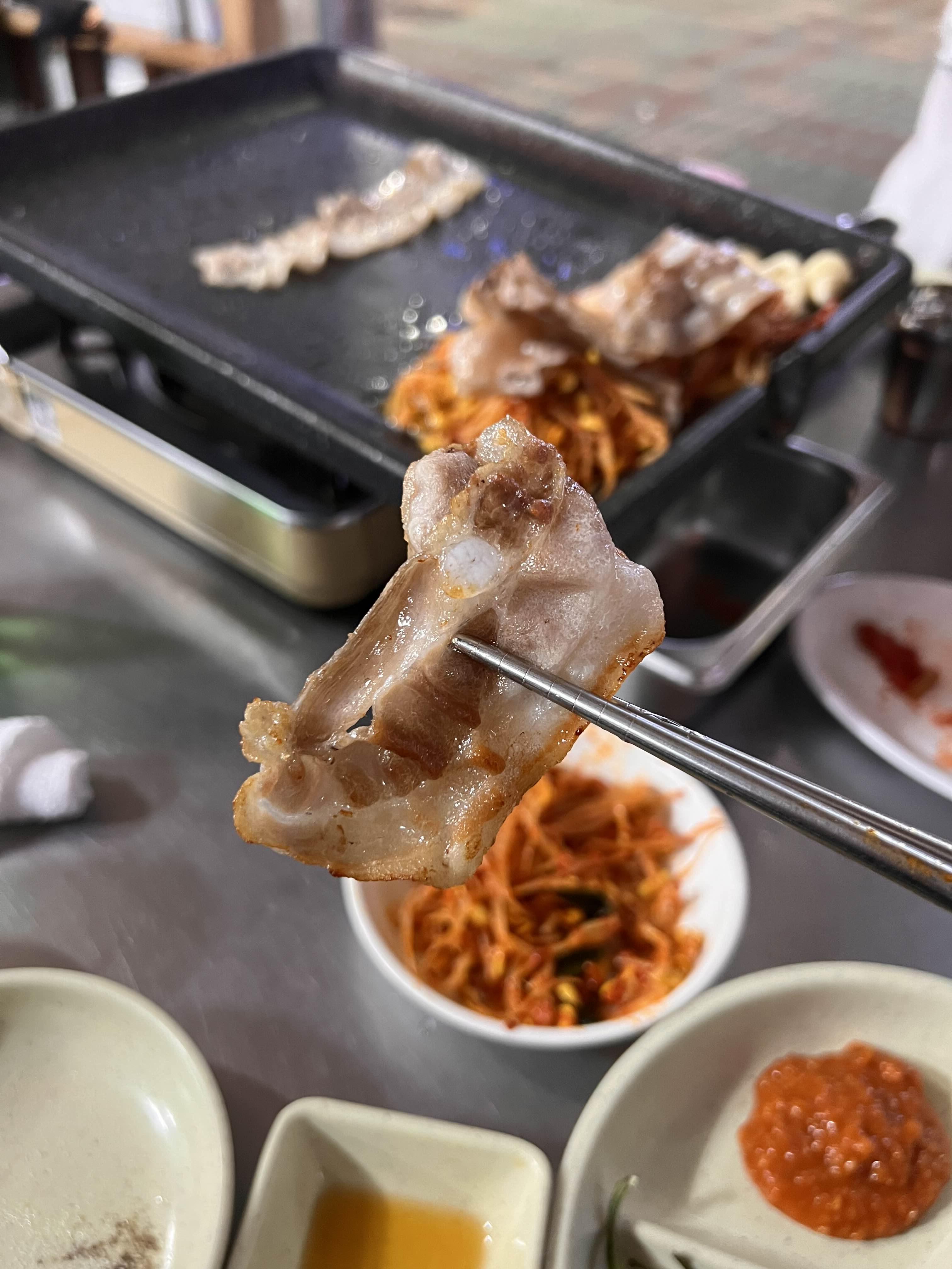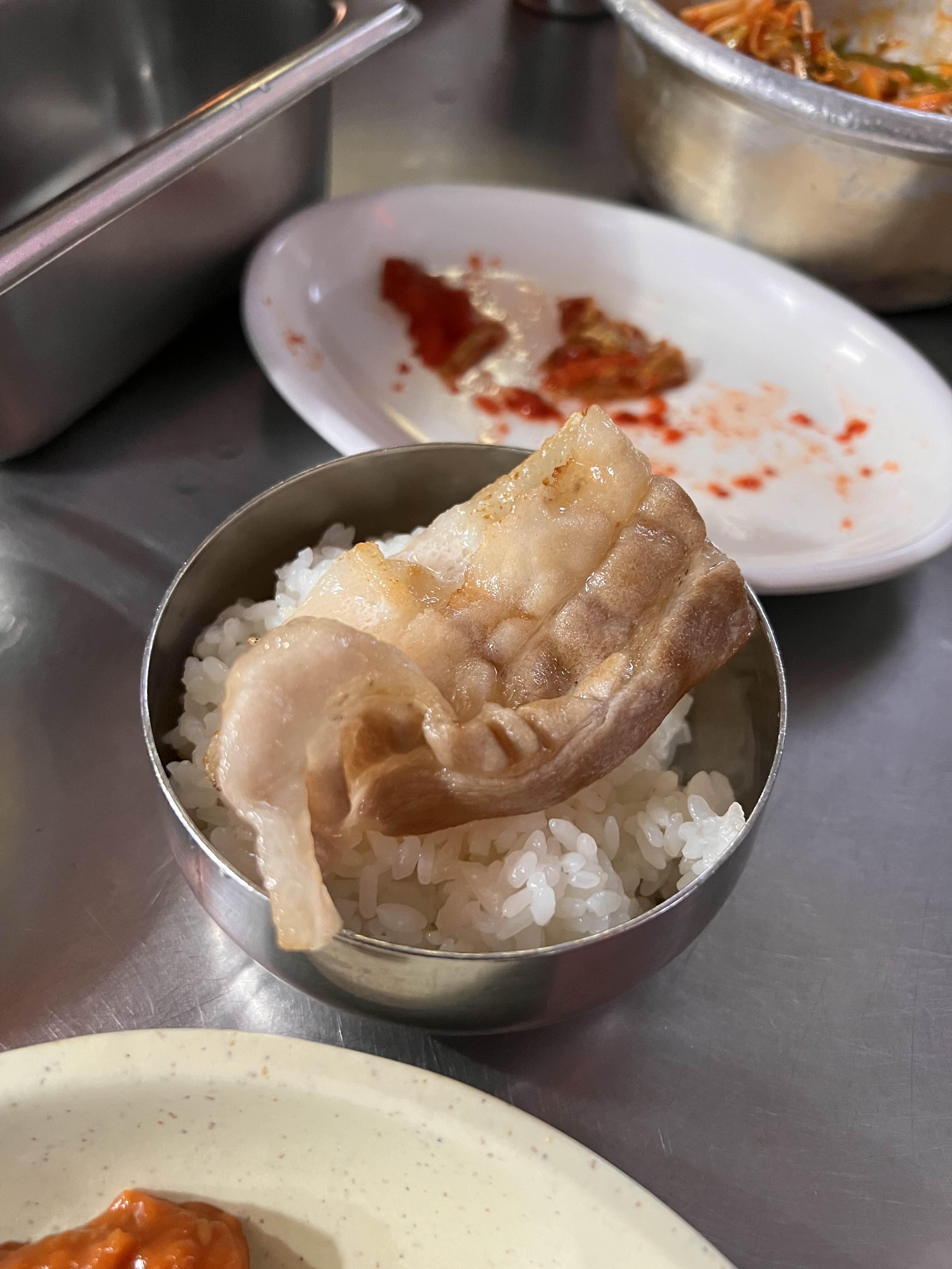 길쭉한 대패삼겹살을 먹을 때 하얀 쌀밥이 빠지면 반칙. 비빔면을 주문해서 고기로 싸 먹어도 맛있을 것 같다.