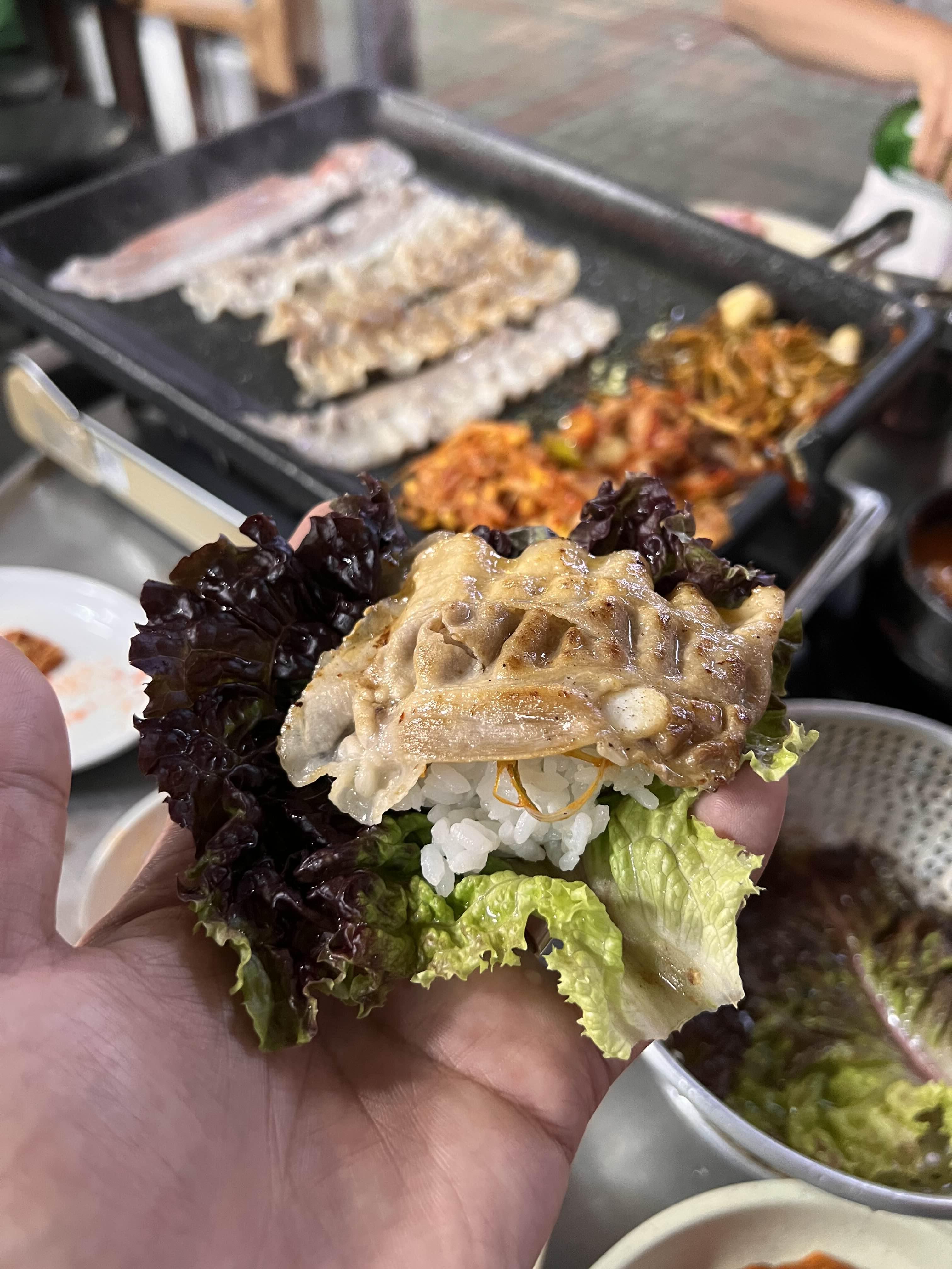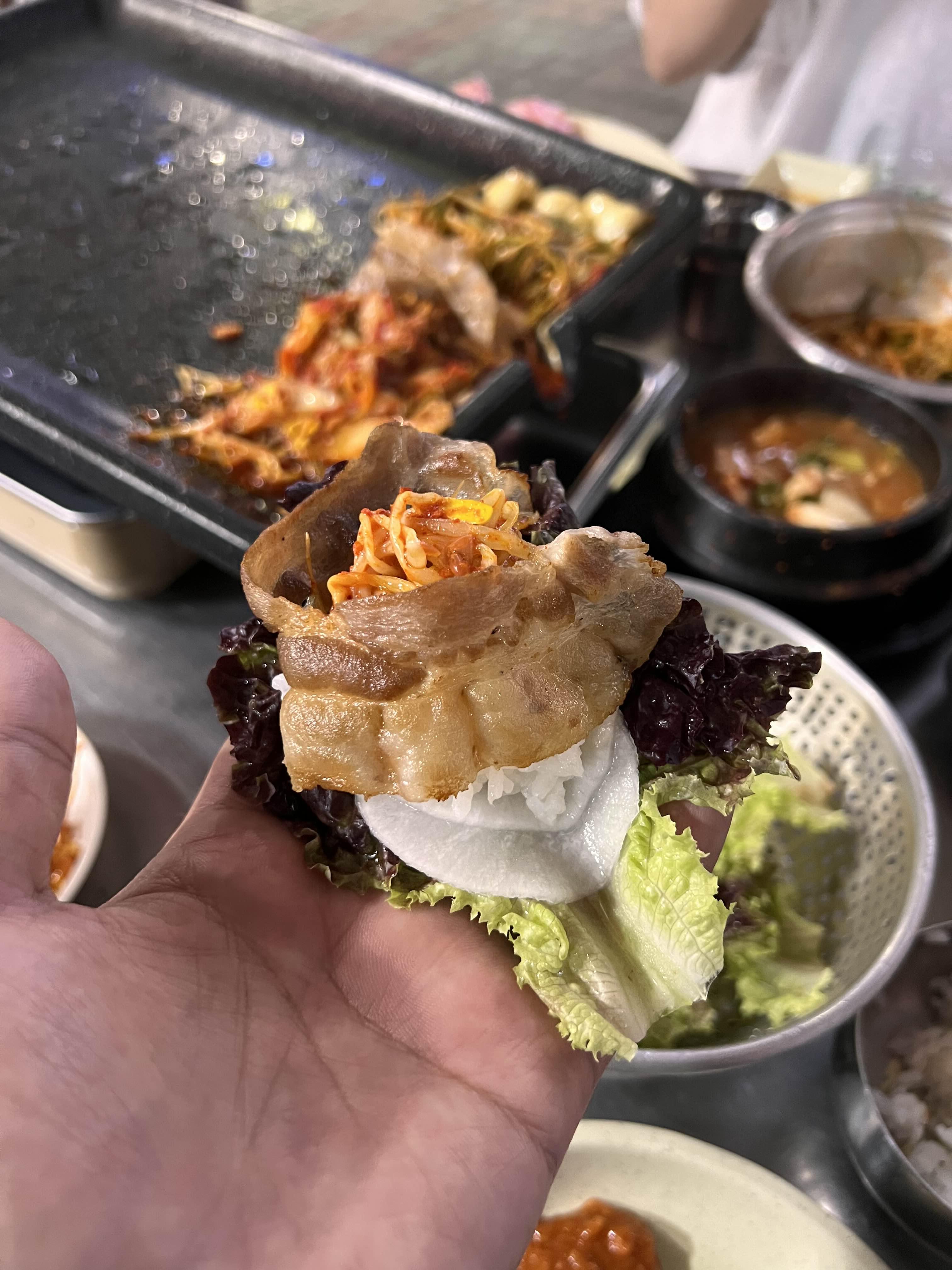대패삼겹살 위에 구운김치 하나 올리고 돌돌 말아서 셀프 김치삼겹살이로 먹어도 맛이 좋다.