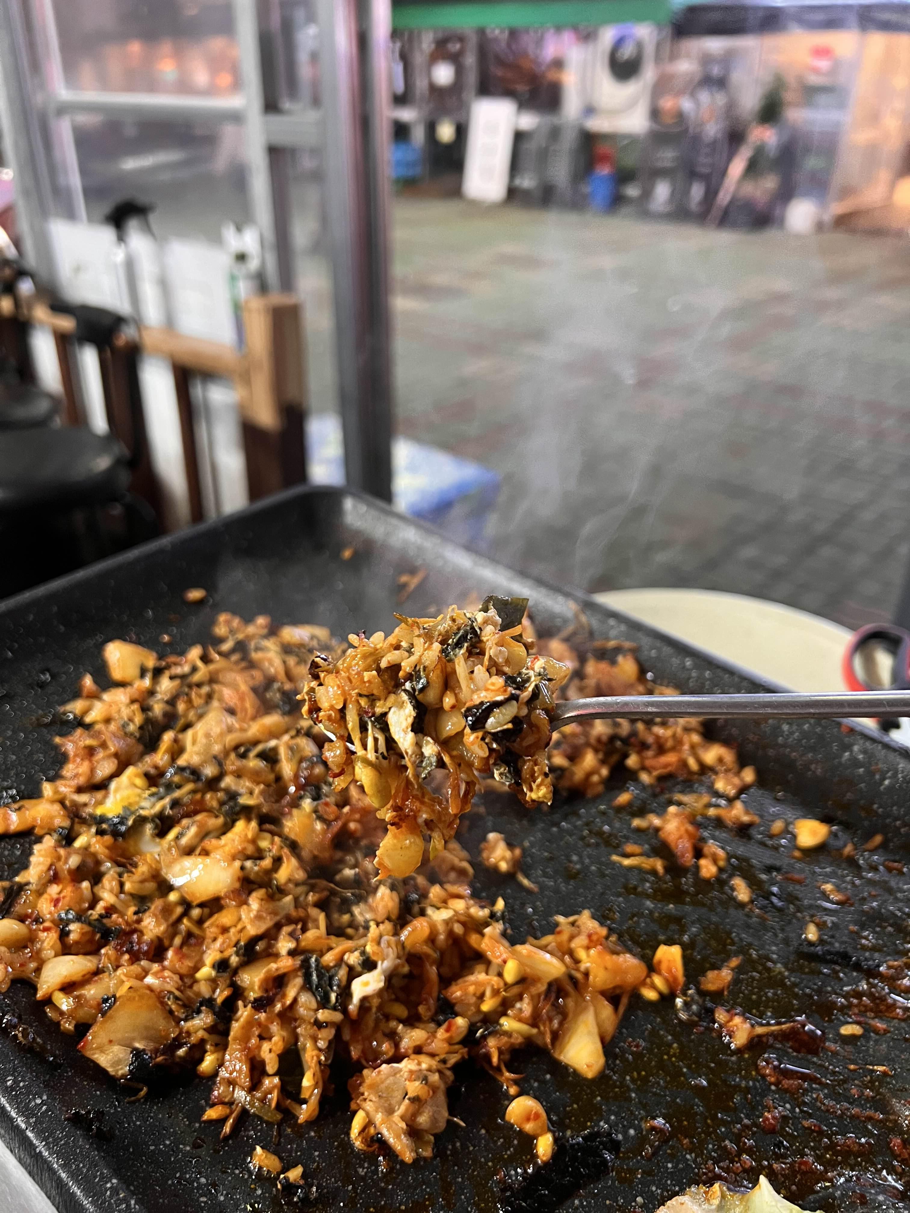 고기를 조금 남기고 콩나물, 신김치, 파절임을 잘게 자르며 구워준다. 그리고 공깃밥 하나 투하.