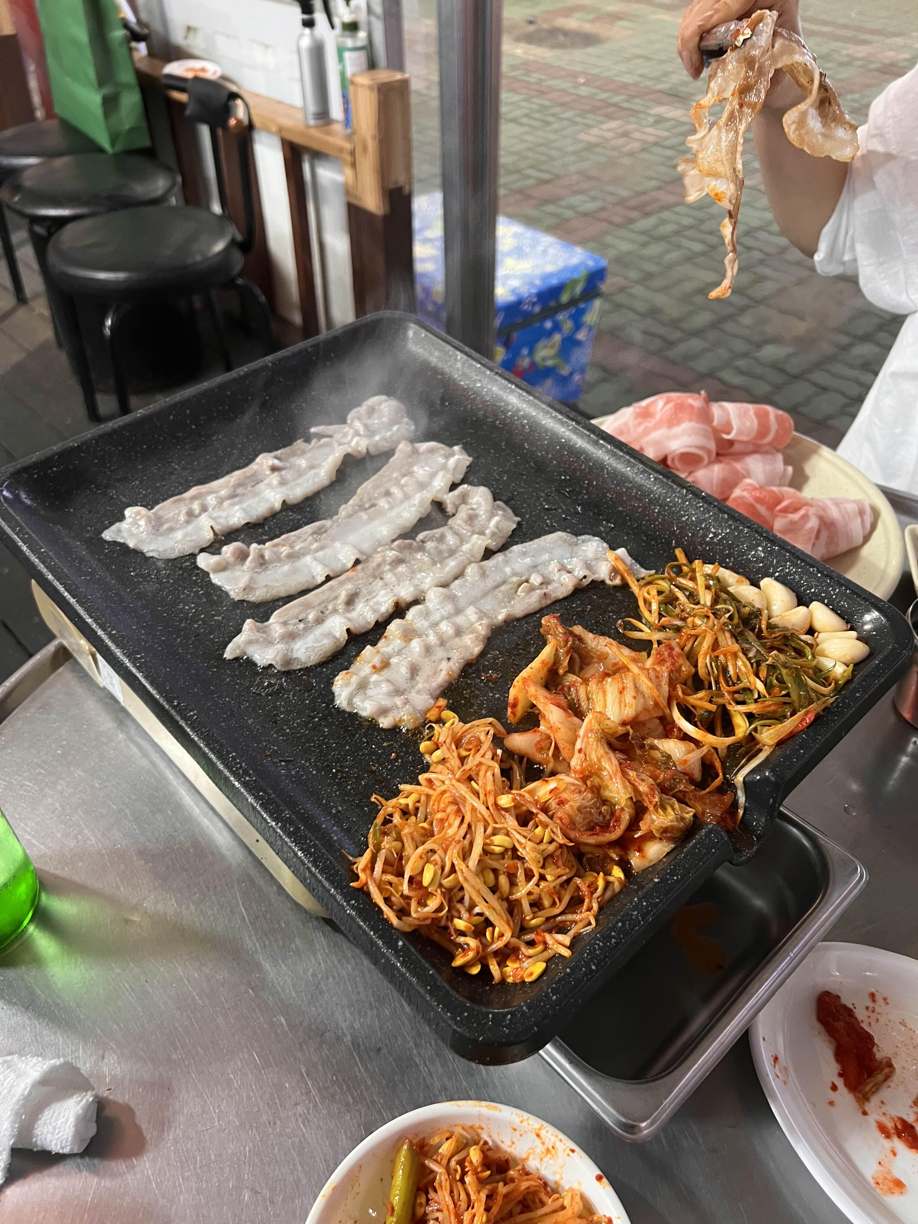 고기와 함께 김치, 콩나물, 파절이, 생마늘을 불판에 함께 올려 구워 먹어야지.