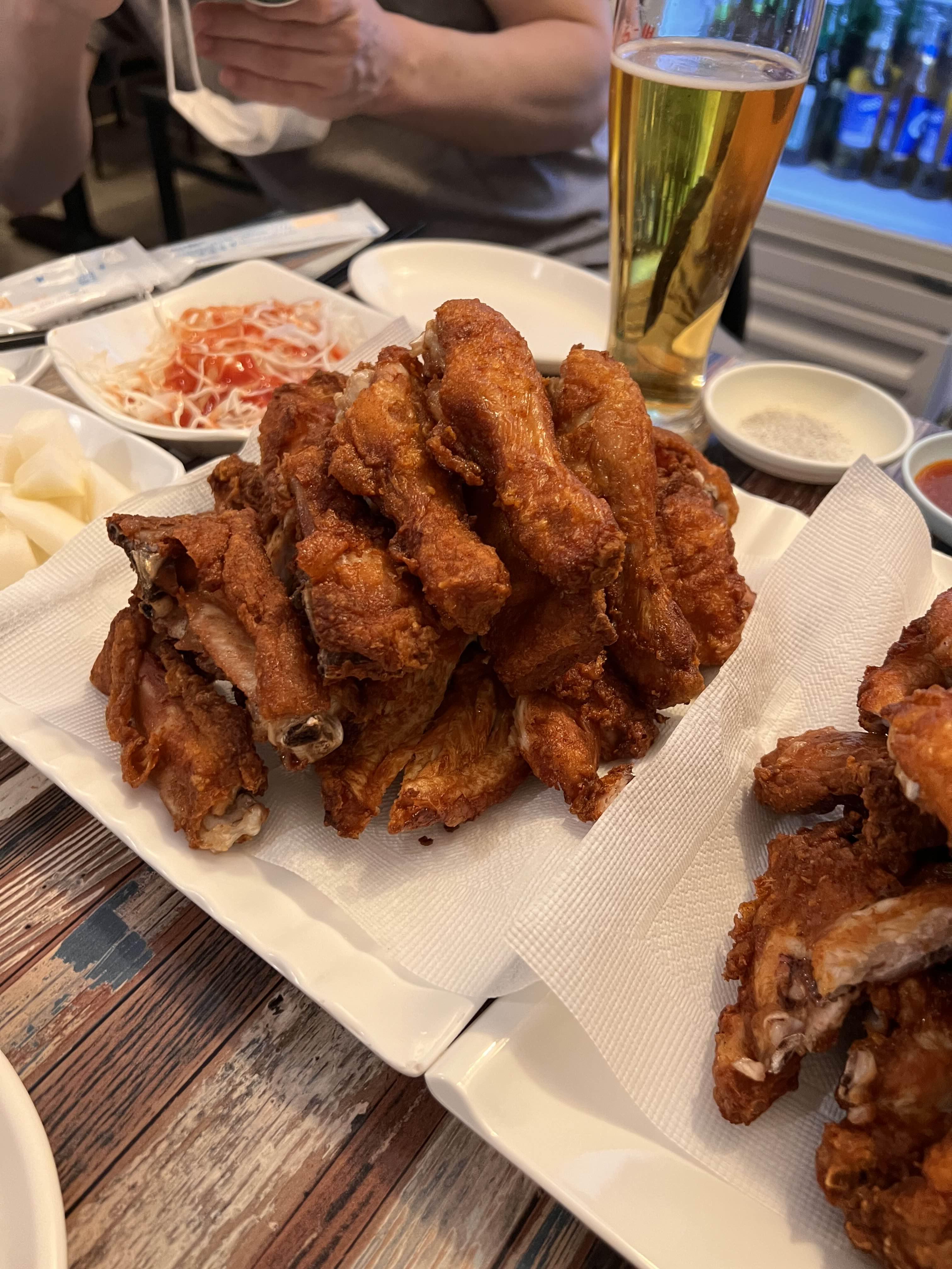 튀김 옷은 얇고 바싹하게 튀겨진 후라이드치킨.