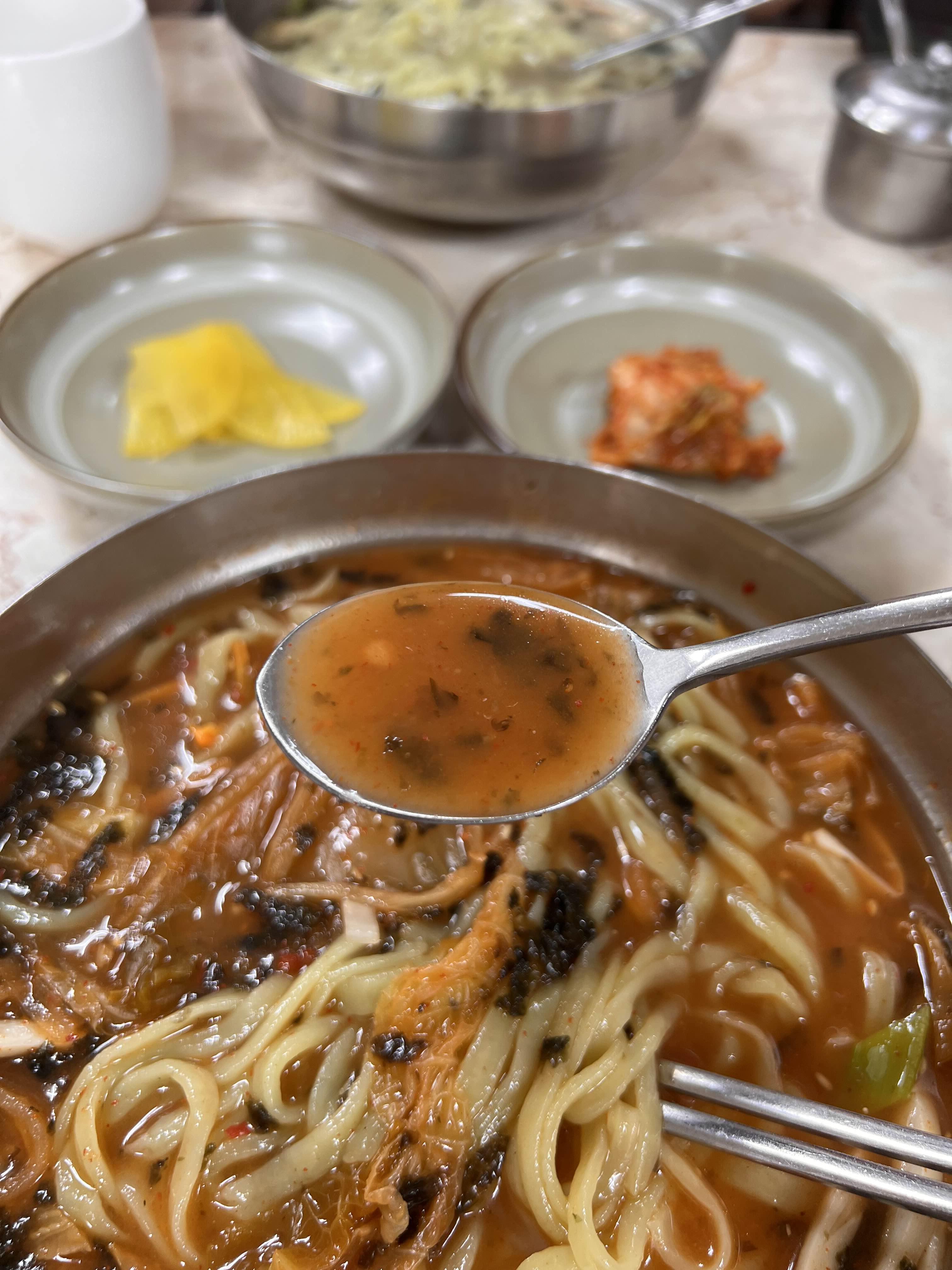 국물은 김칫국이다. 평소 즐기는 음식인 김치국밥에 밥 대신 칼국수를 말아 먹는 느낌인데 적당히 신김치로 끓인 국물이라 김치 자체도 국물도 신맛이 과하지 않다.