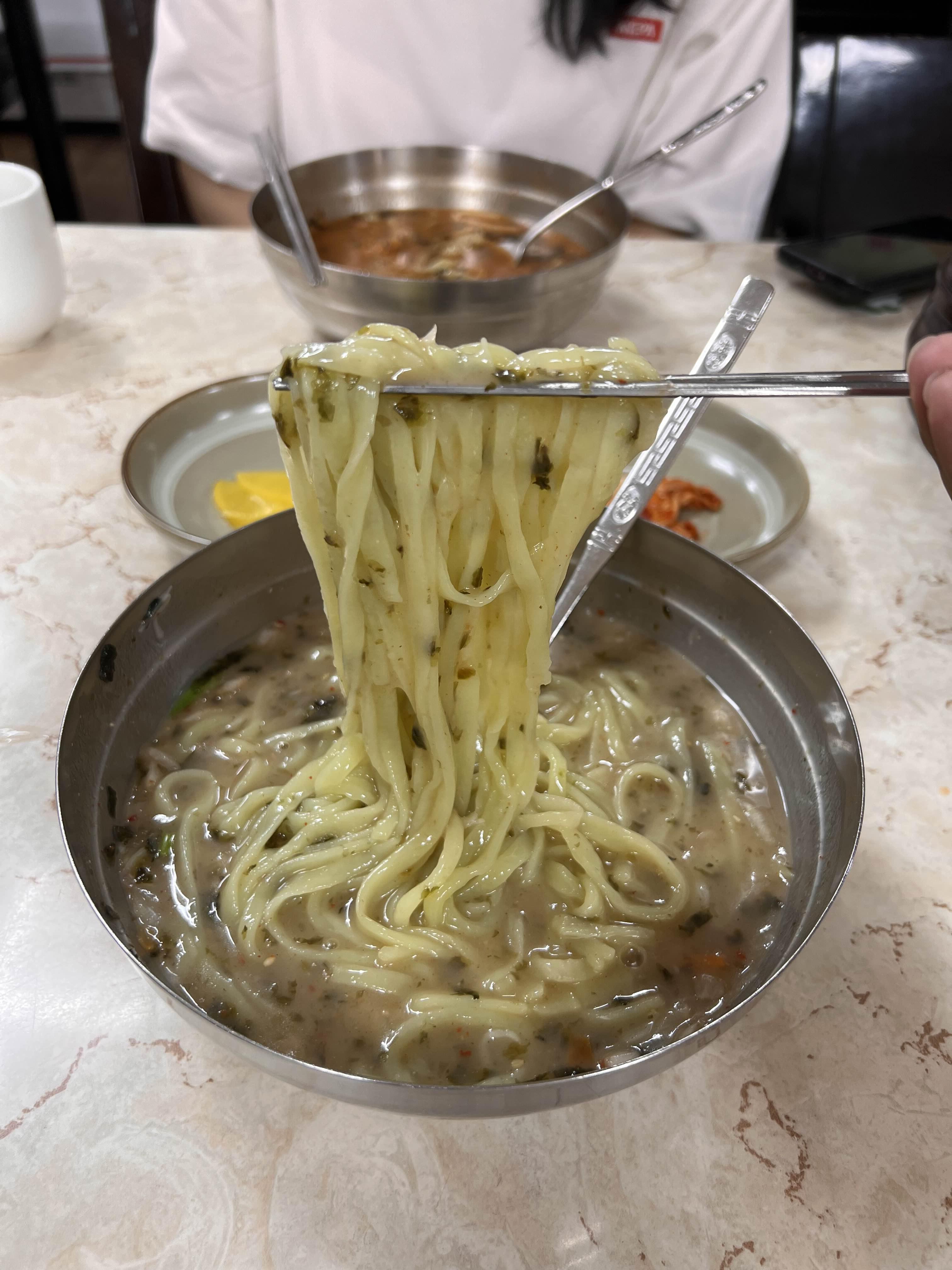 익은 김치와 칼국수의 궁합이 좋다. 면발은 쫄깃보다는 물떡처럼 쫀득하고 차지다.