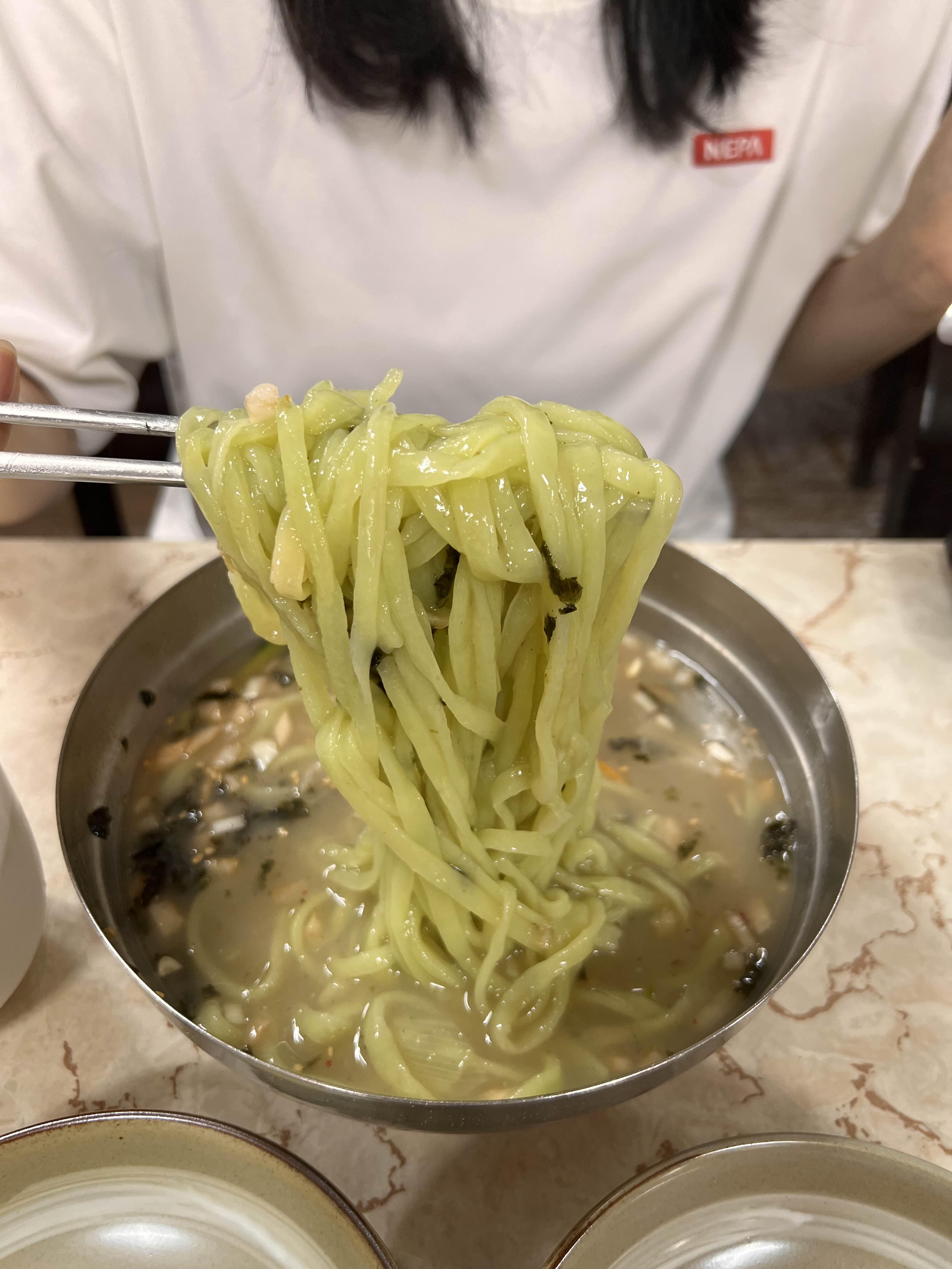 김치국물을 머금어 색이 오묘한 김치칼국수와 달리 푸른빛이 많이 더 많이 감돈다.