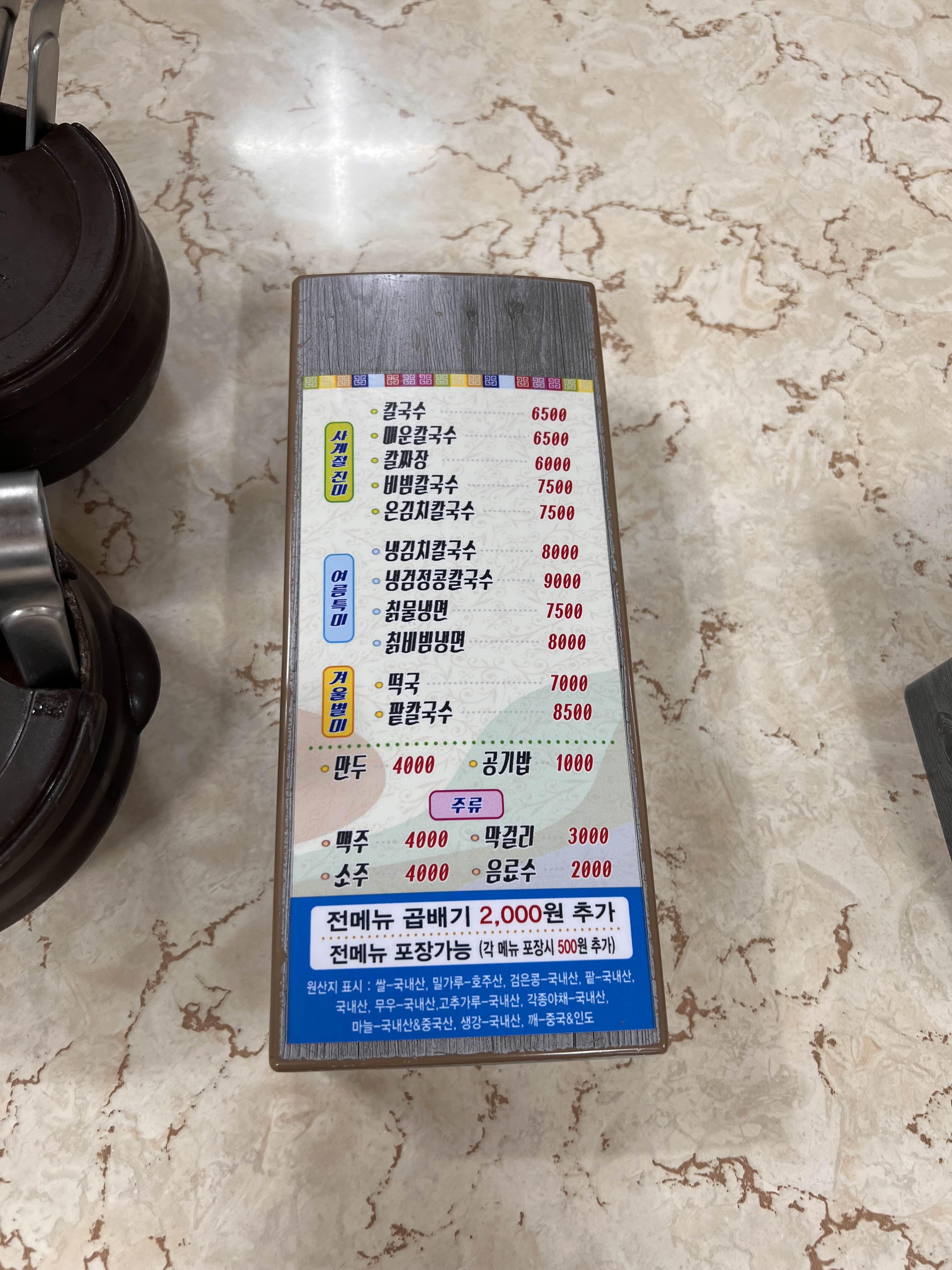 수저통 두껑에는 메뉴와 원산지표시가 되어 있다. 주방앞에 표시된 원산지표시는 김치도 표기되어 있었는데 국내산이었다.