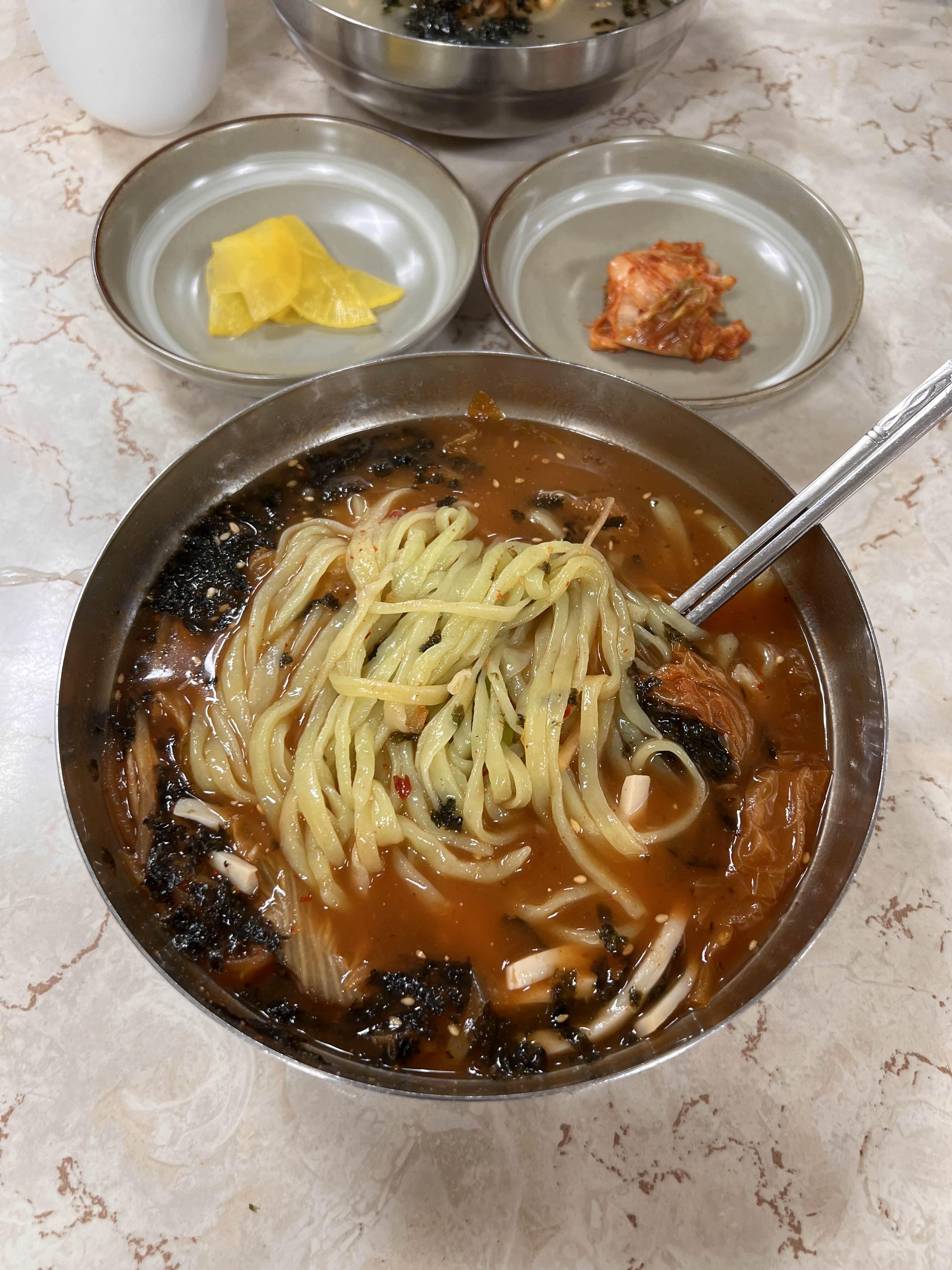 국물은 김칫국이다. 평소 즐기는 음식인 김치국밥에 밥 대신 칼국수를 말아 먹는 느낌인데 적당히 신김치로 끓인 국물이라 김치 자체도 국물도 신맛이 과하지 않다.