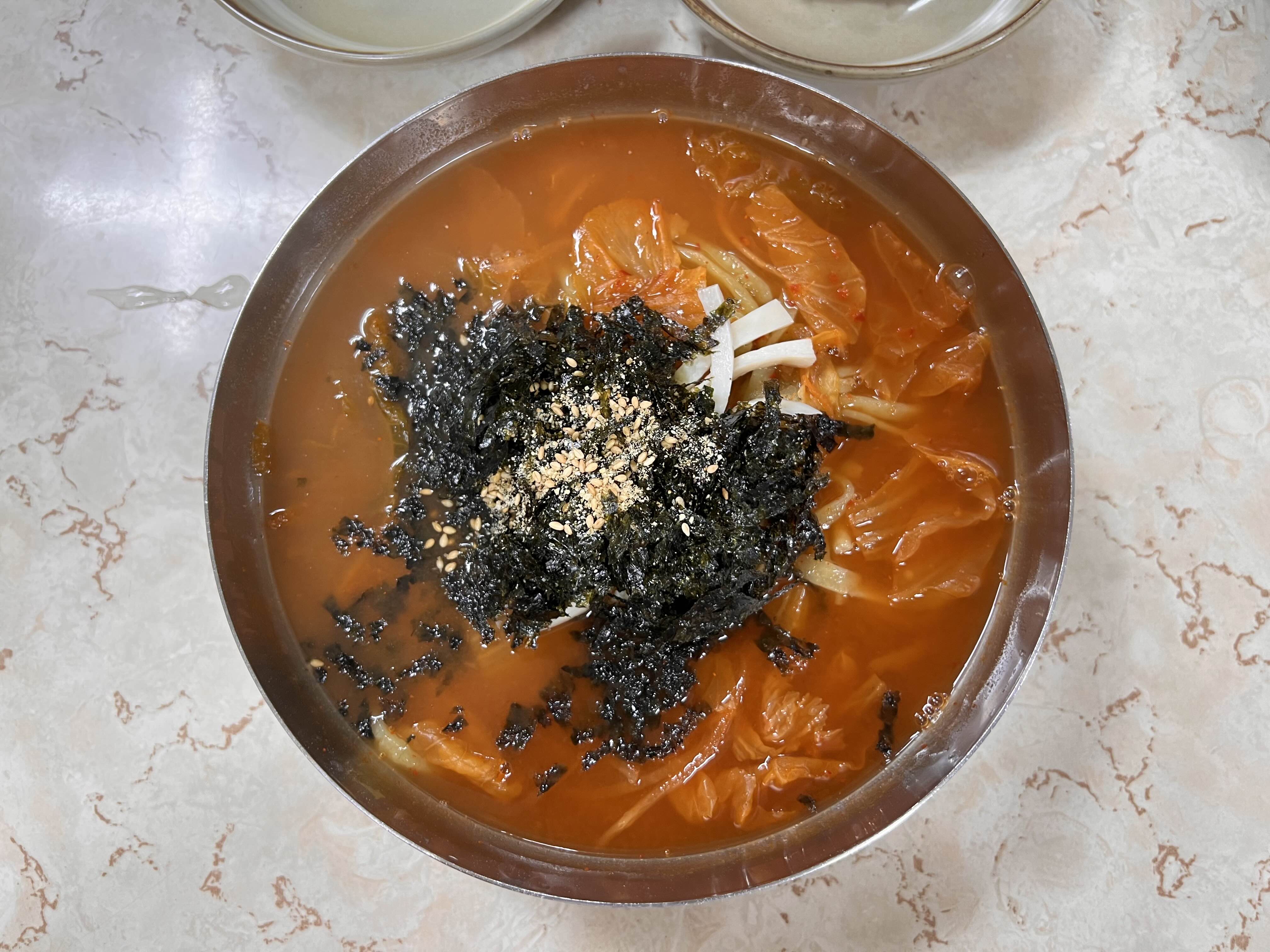 김치칼국수에 김가루와 깨소금을 뿌려준다. 뭔가 김치국밥스러운 비주얼이랄까.