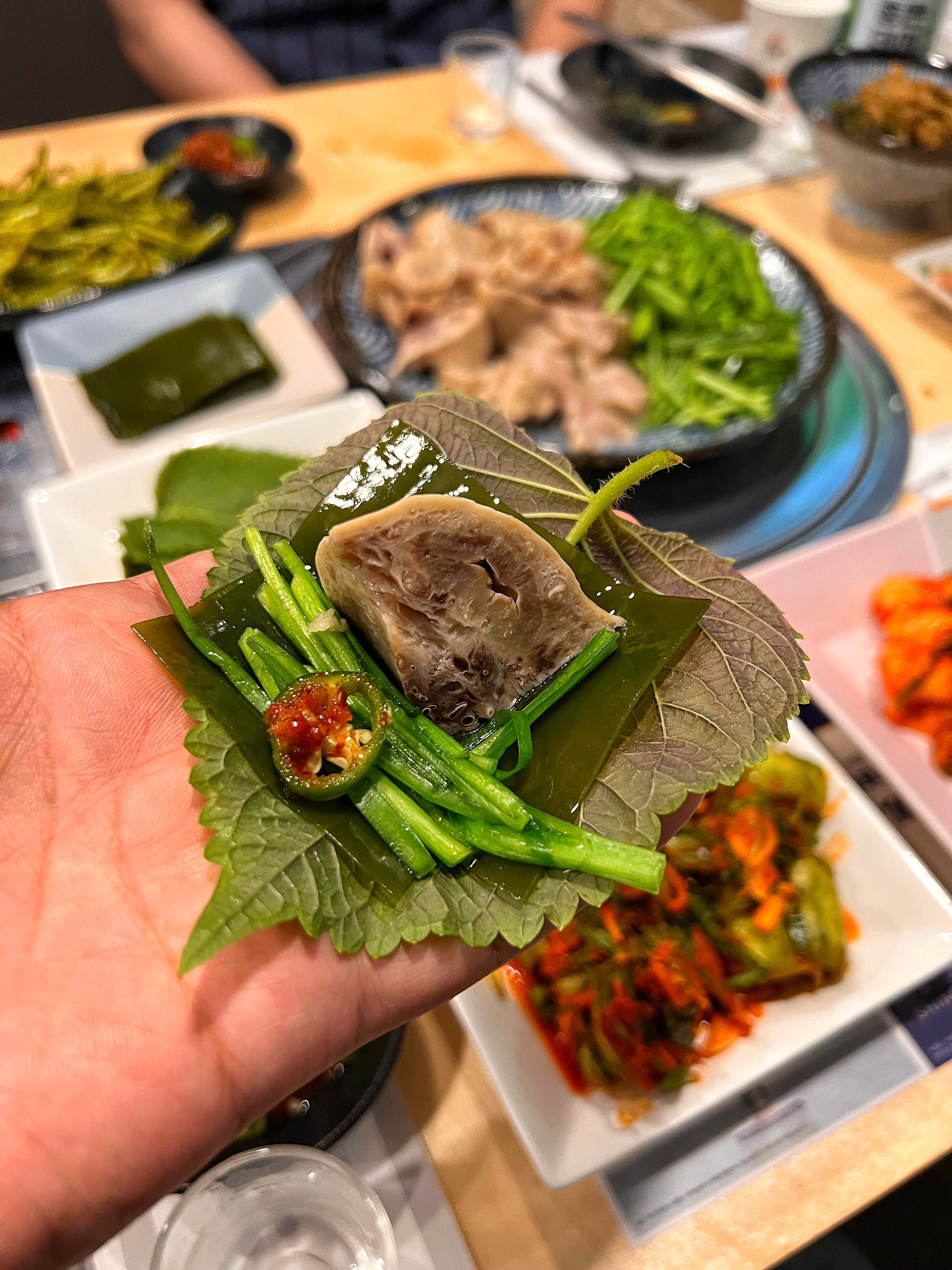 잡내 없이 잘 삶아서 그냥 먹어도 쫀득쫀득 맛있더라. 깻잎과 다시마 한 장씩 손에 깔고 부추와 청양고추지를 올려서 쌈 싸먹어도 맛이 좋다.