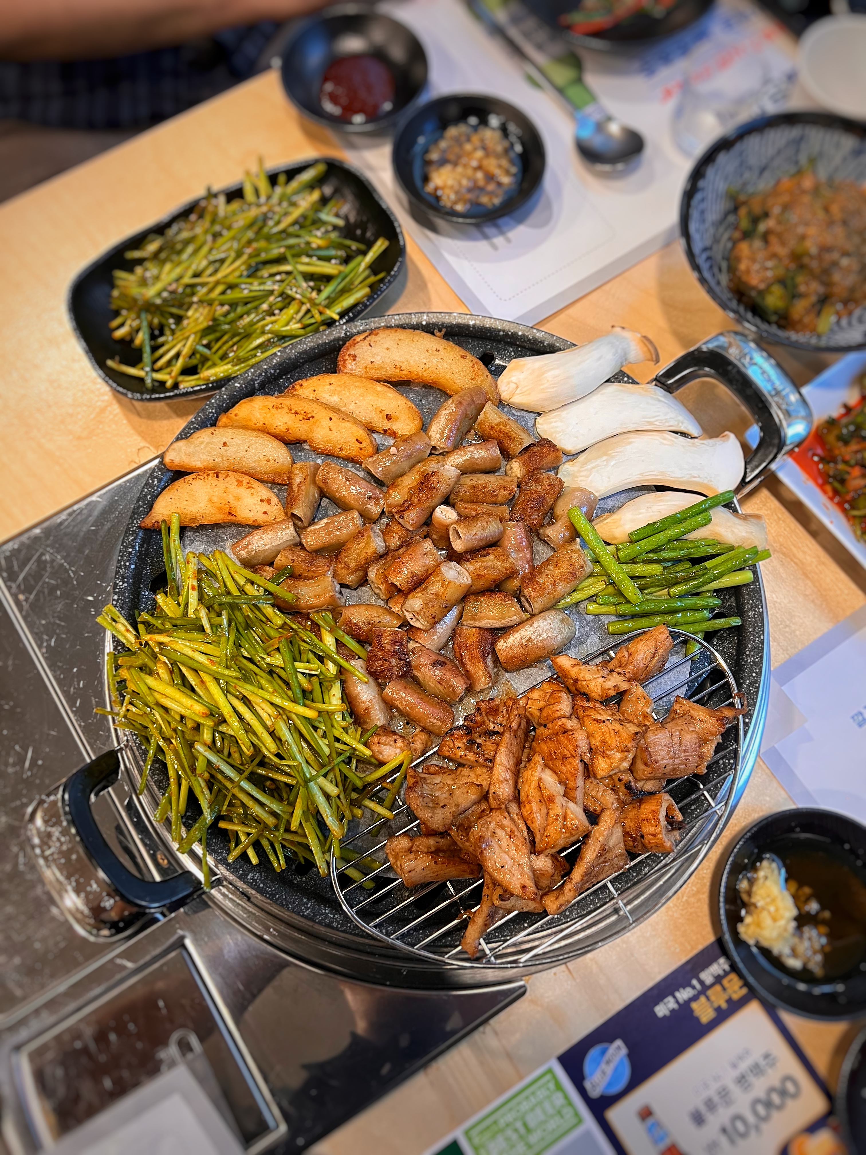곱창물래 시그니처 곱창구이. 곱창구이 한켠에도 부추가 수북하다. 곱창은 원물 기준으로 1인분 200그램인데 구웠을 때 아무래도 중량이 줄 수 밖에 없다. 아랫쪽에 있는 특양은 140g 기준이다.