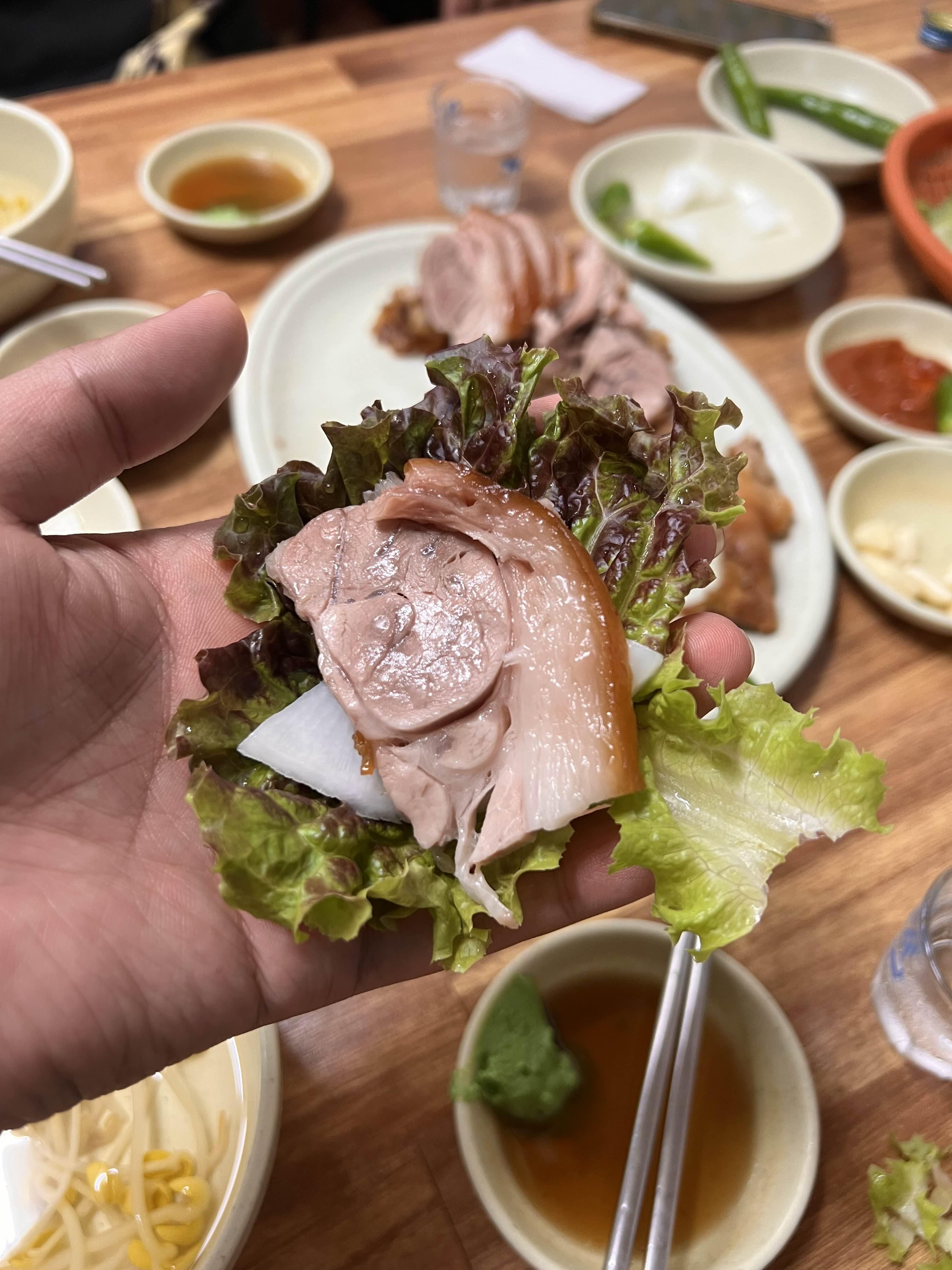 콩나물국이 1인당 한 그릇씩, 절임무, 마늘, 양파, 고추, 상추 그리고 족발. 이내 한 상이 차려진다.
