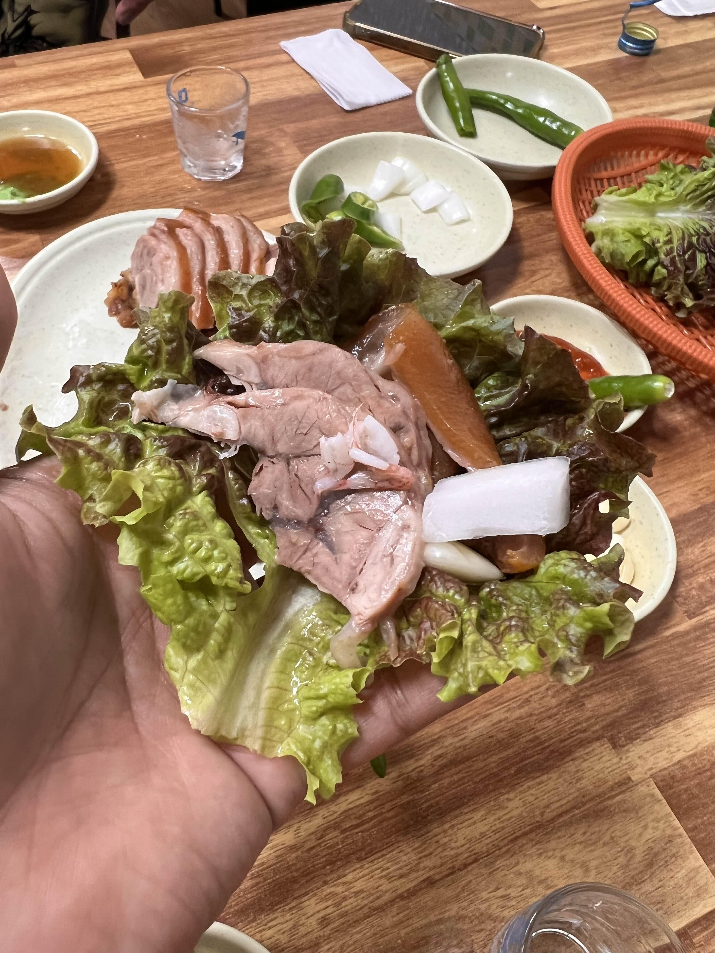이런저런 재료들을 상추 위에 올려 쌈으로 즐기는 맛도 빼 놓을 수 없다.