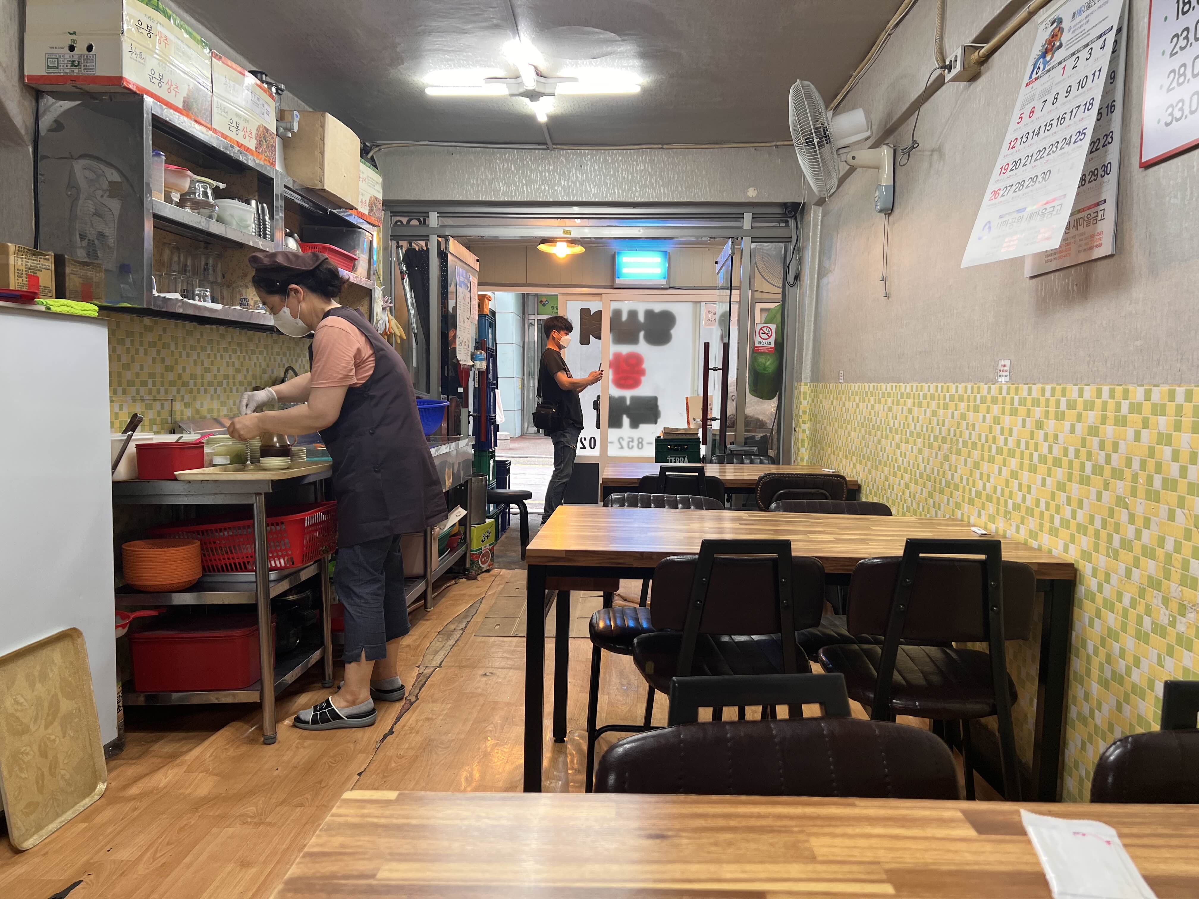 가게 입구에서 족발을 썰고 있다. 5시쯤 방문해서 손님이 많지는 않았지만, 포장손님은 꾸준하고, 이 날도 6시가 넘어가는 시점부터 만석이었다. 그리고는 웨이팅 시작.