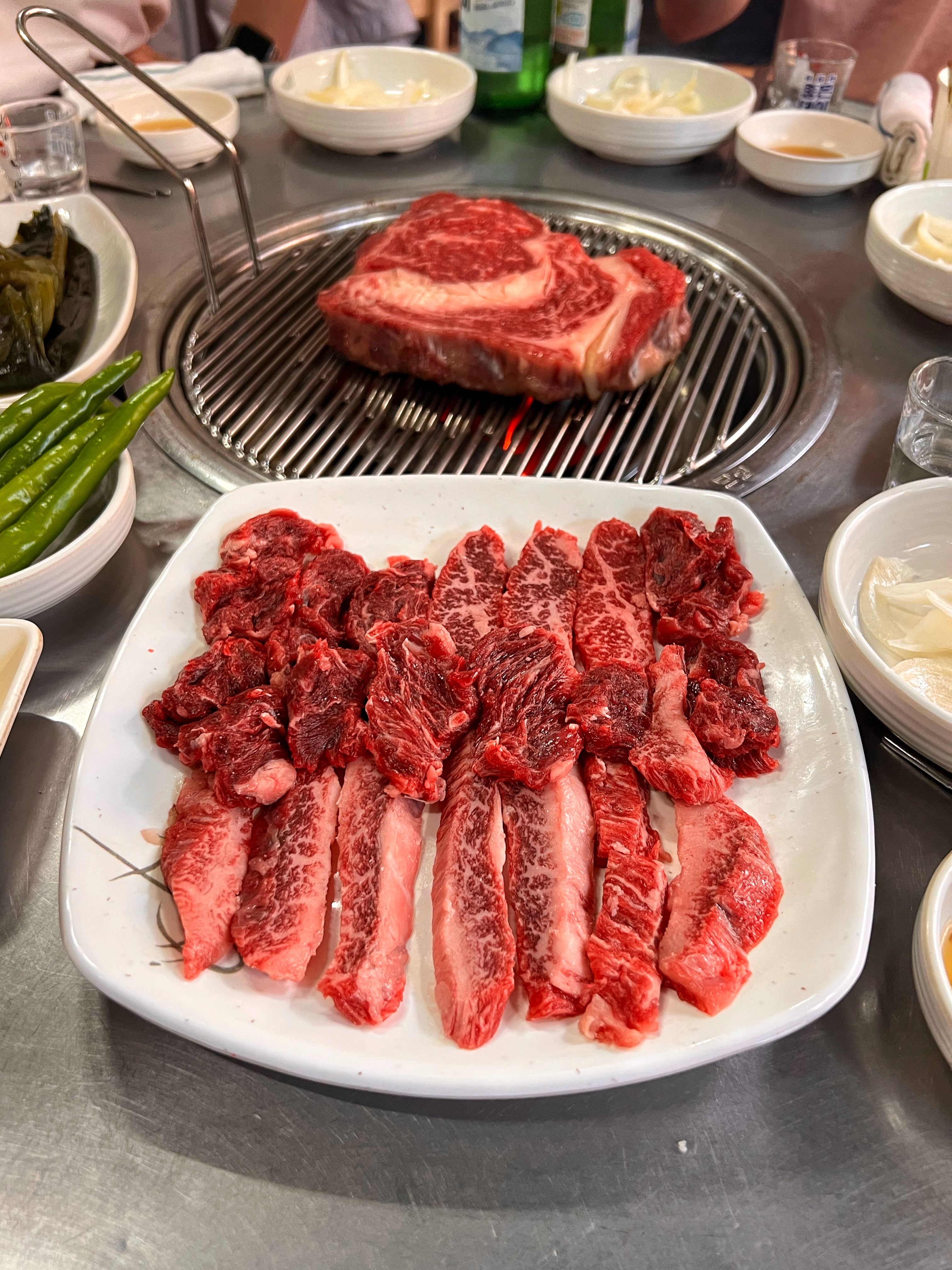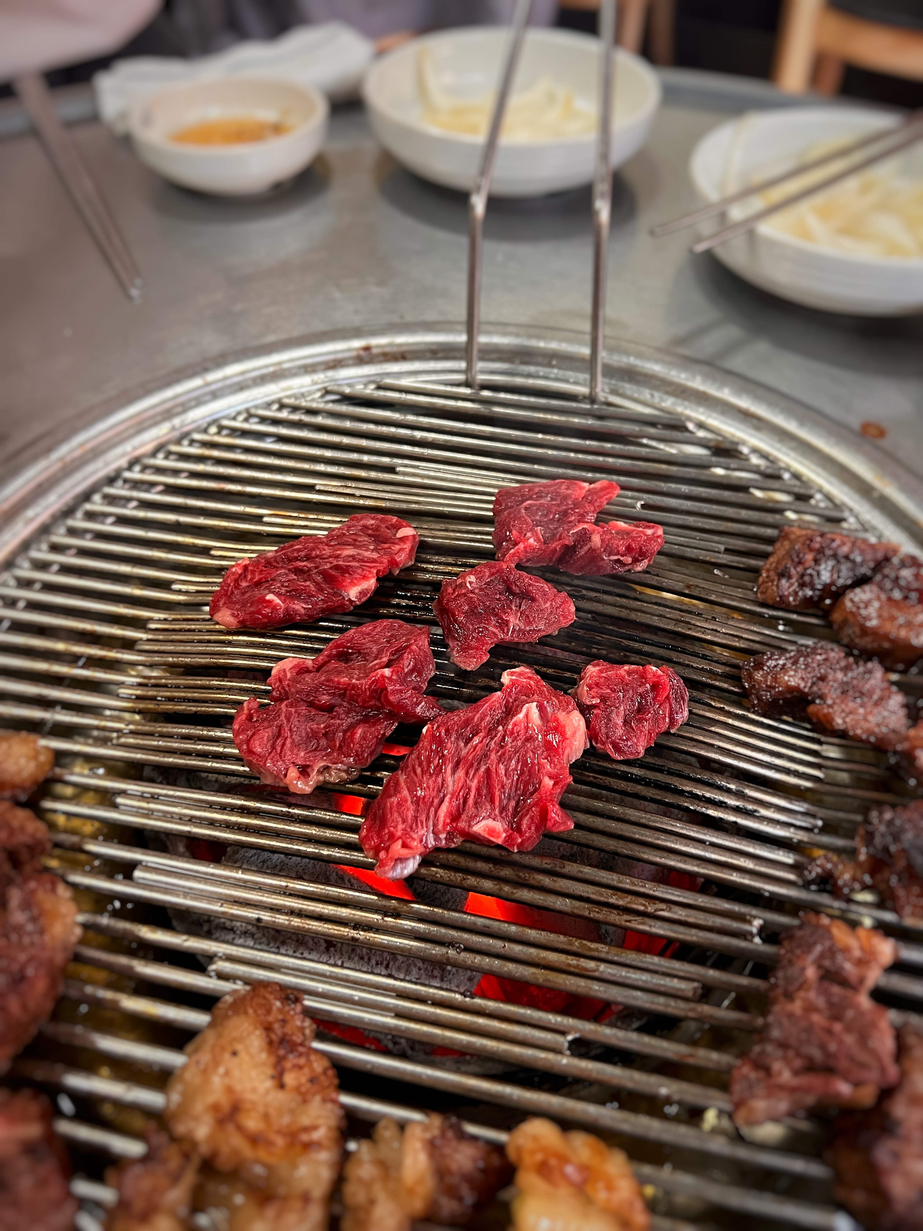 사장님이 고기 한면이 다 익으면 저절로 뒤집힌다는 농담을 하길래 구워주는가 했는데 구워주는 시스템은 아니었다. 그래서 한 면은 좀 많이 구워져버렸다.