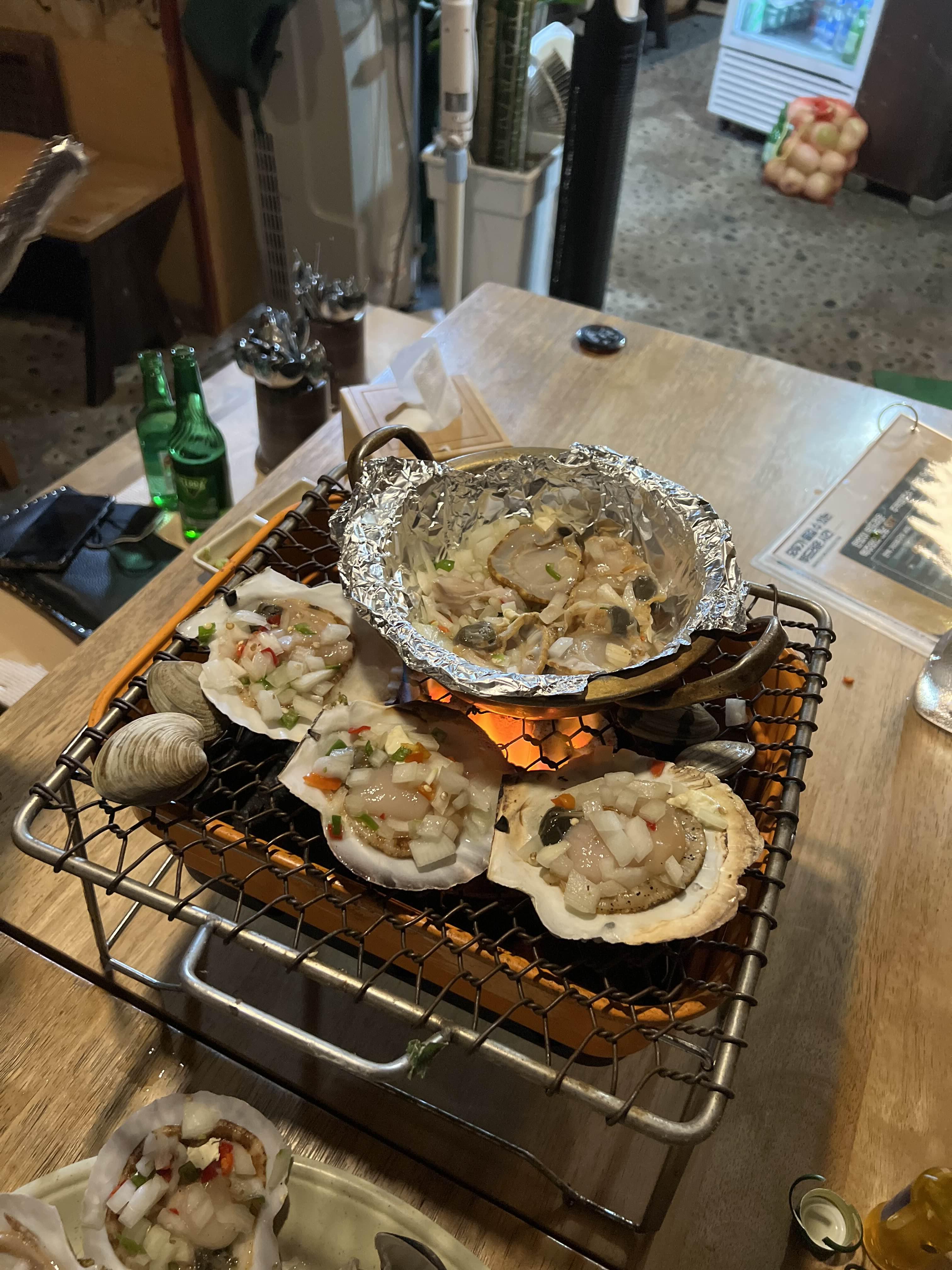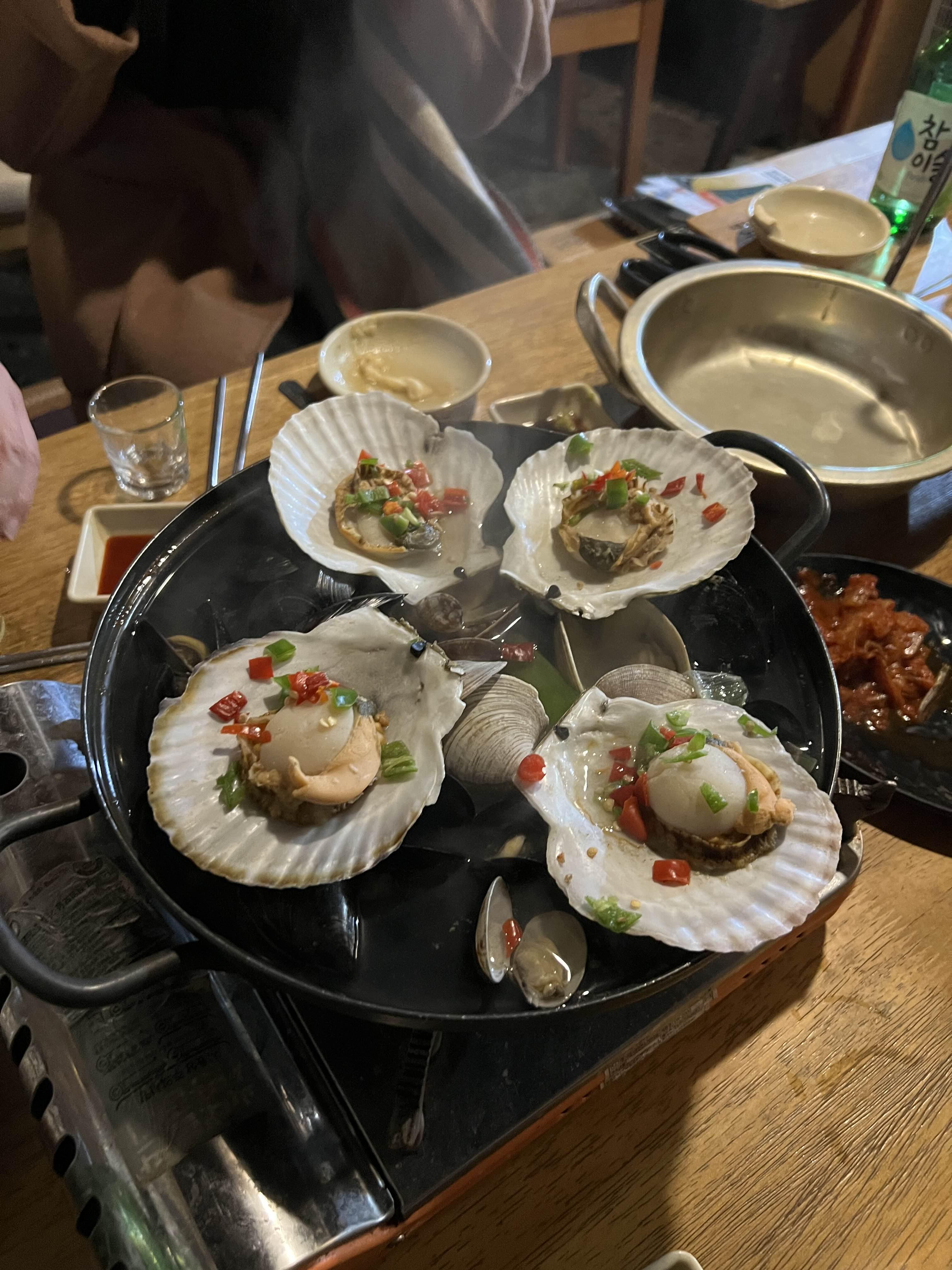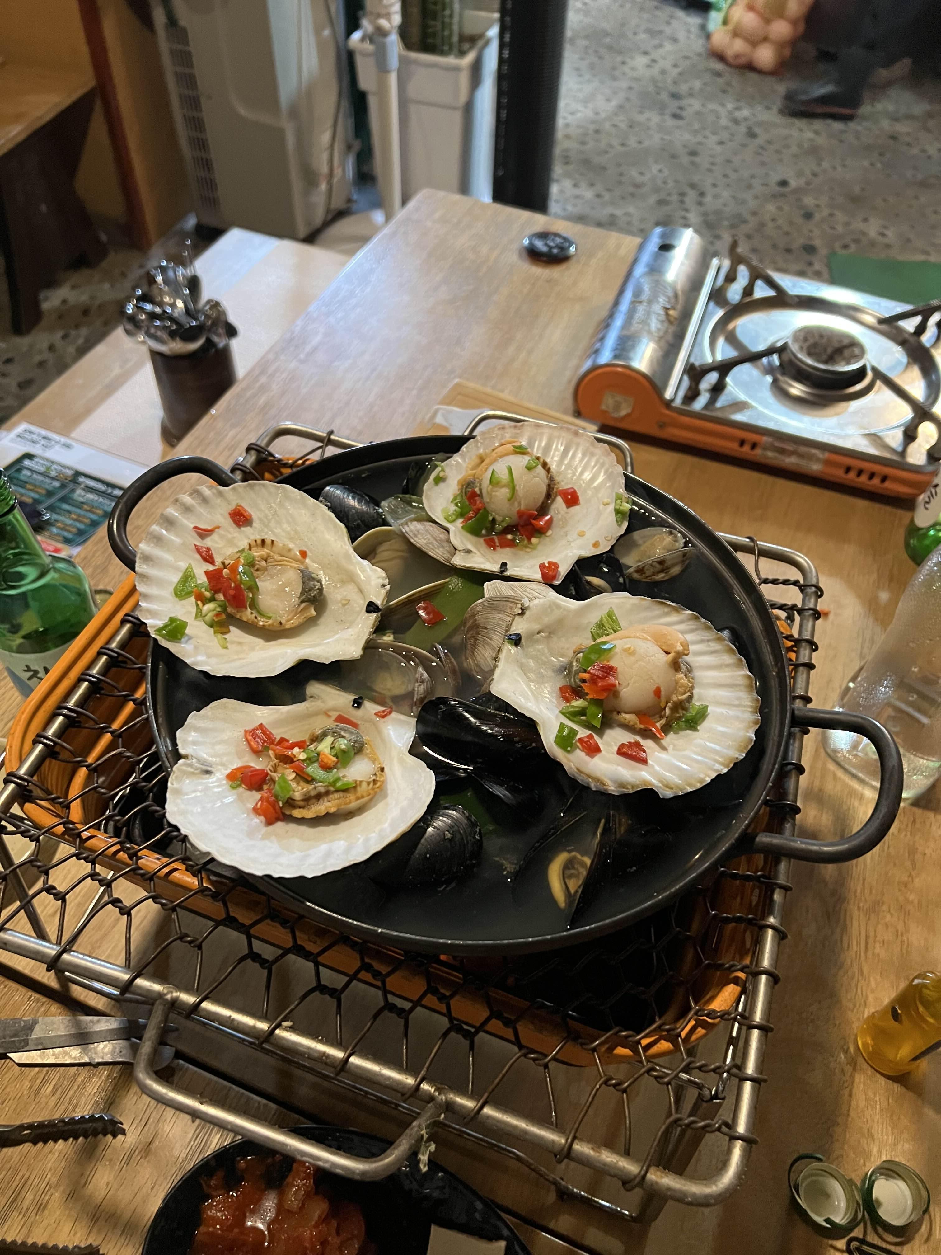 가리비를 어느정도 먹었을 때 조개탕이 나온다. 느낌 있게 불판 위에 조개탕을 올려서 먹으려고 했는데 가리비가 조금 남아서 별도로 내어준 버너에 올려줬다.