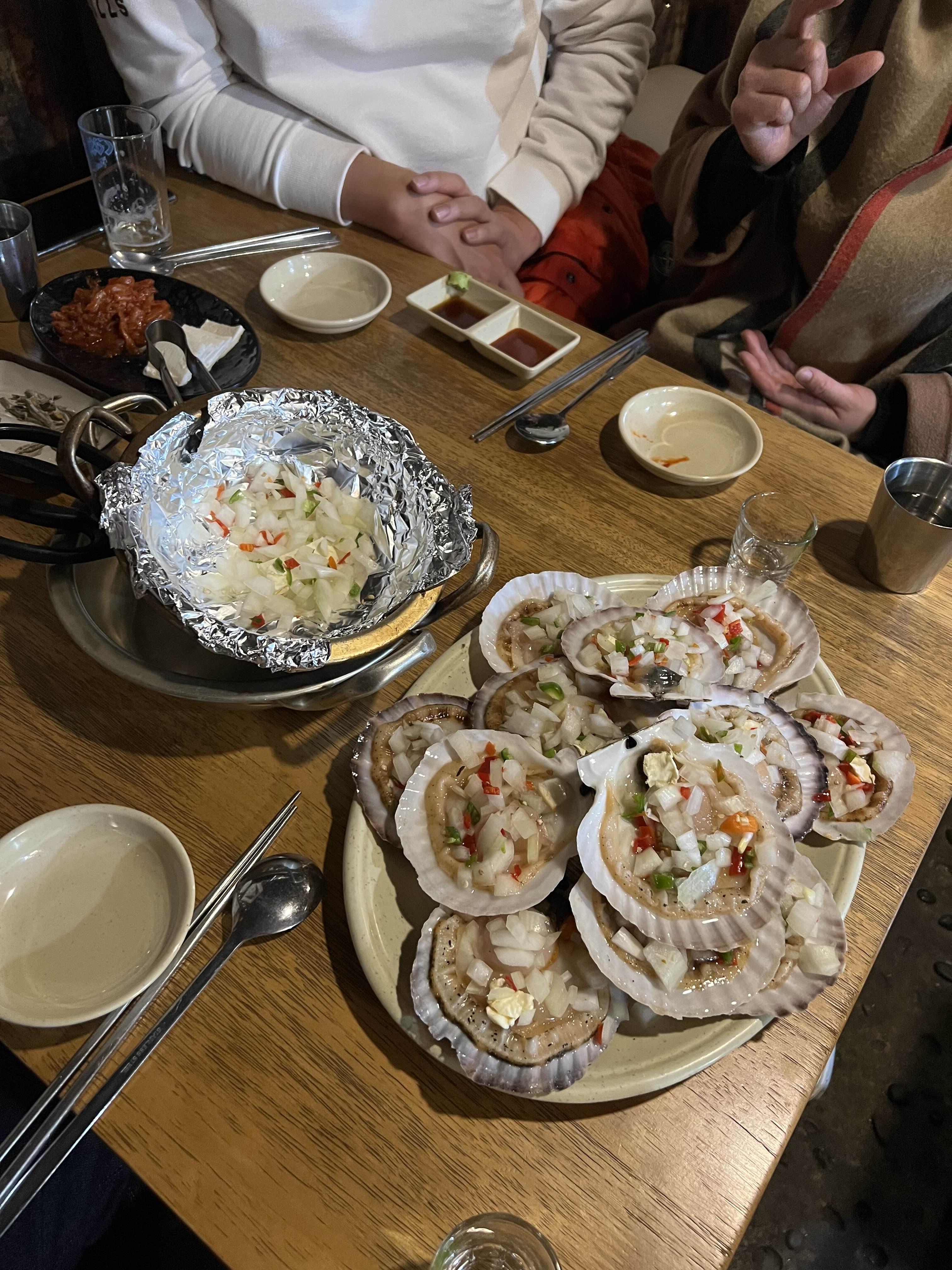 두부김치와 멸치를 안주로 소주한잔 기울이고 있으니 손질된 가리비와 야채가 든 양은냄비를 내어준다.