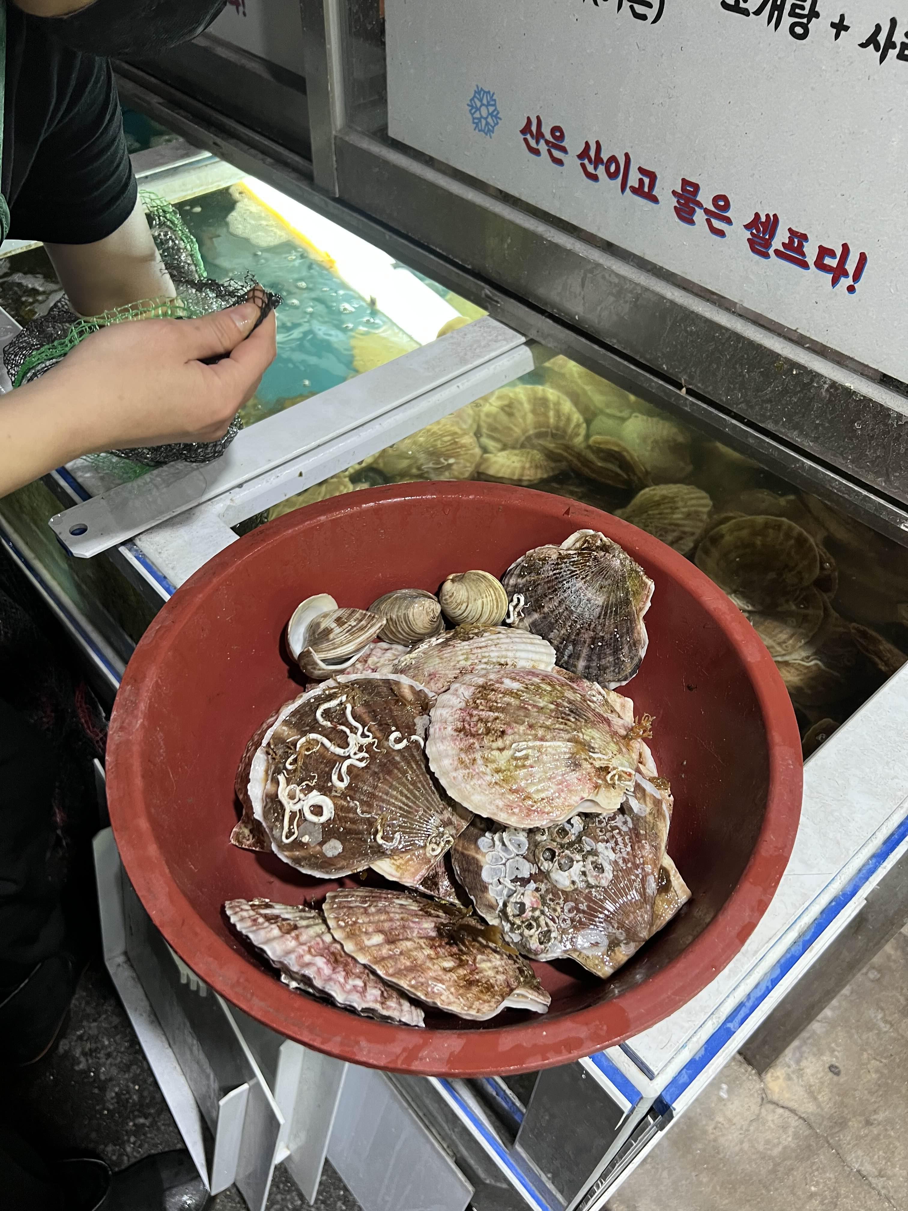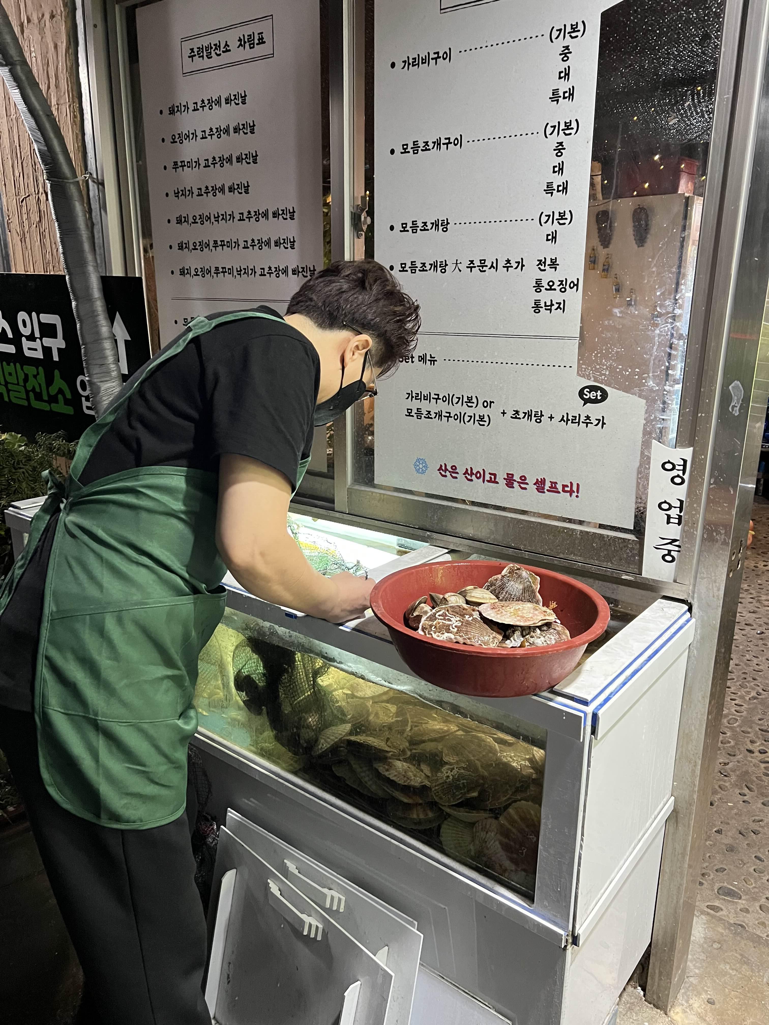 주력발전소 정문 옆에는 수조가 있더라. 가리비구이와 조개탕 세트를 주문하니 수조에서 가리비를 바로 건져낸다.