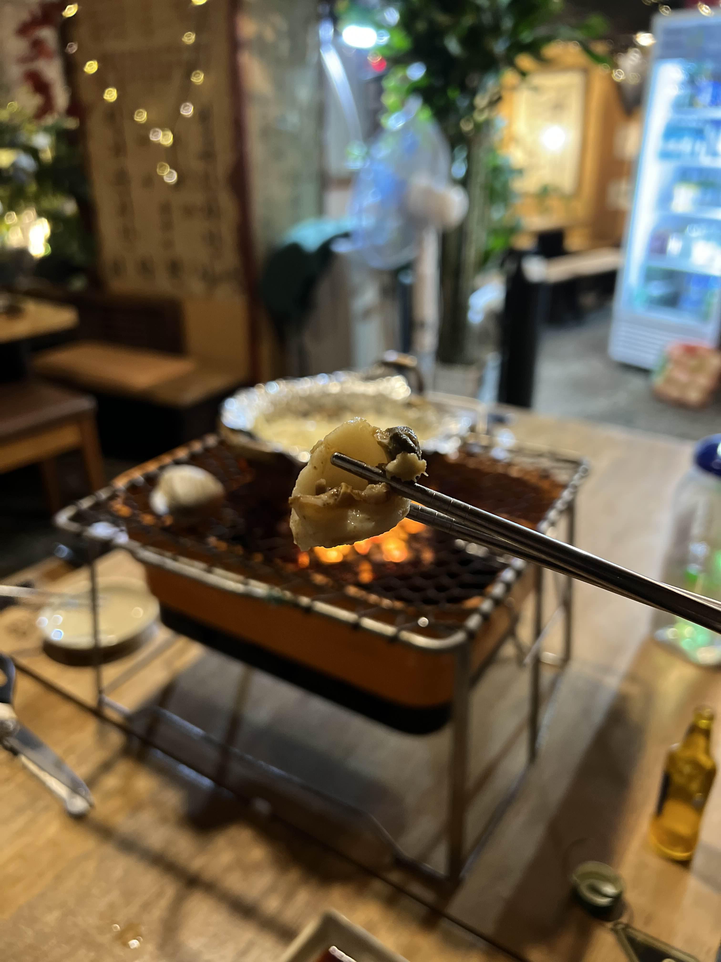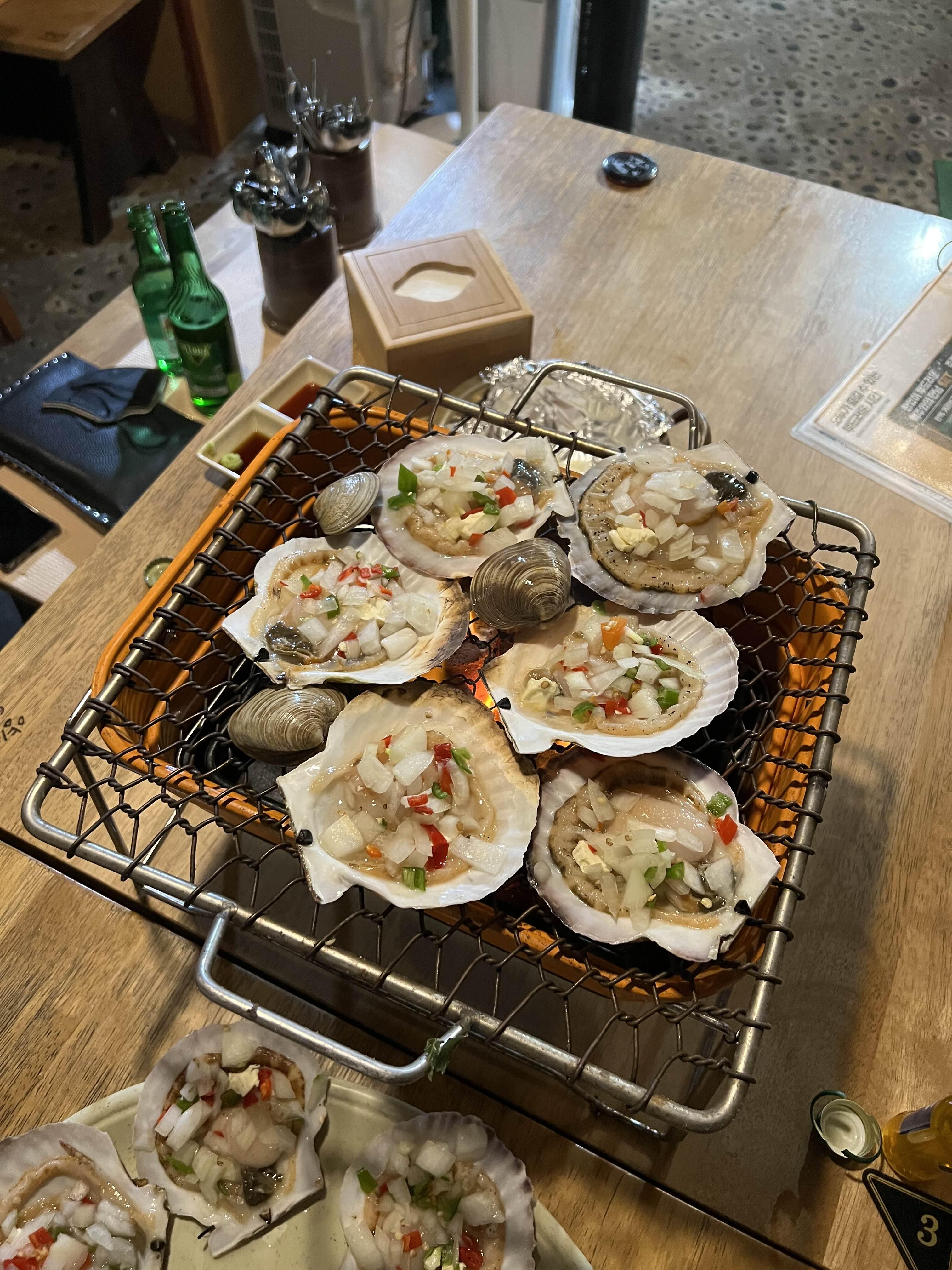 불판 위에 가리비를 올려주고 촉촉한 윤기를 유지하며 관자가 쪼그라들 때 뒤집어서 한번 더 구운 뒤 낼름 먹으면 된다.