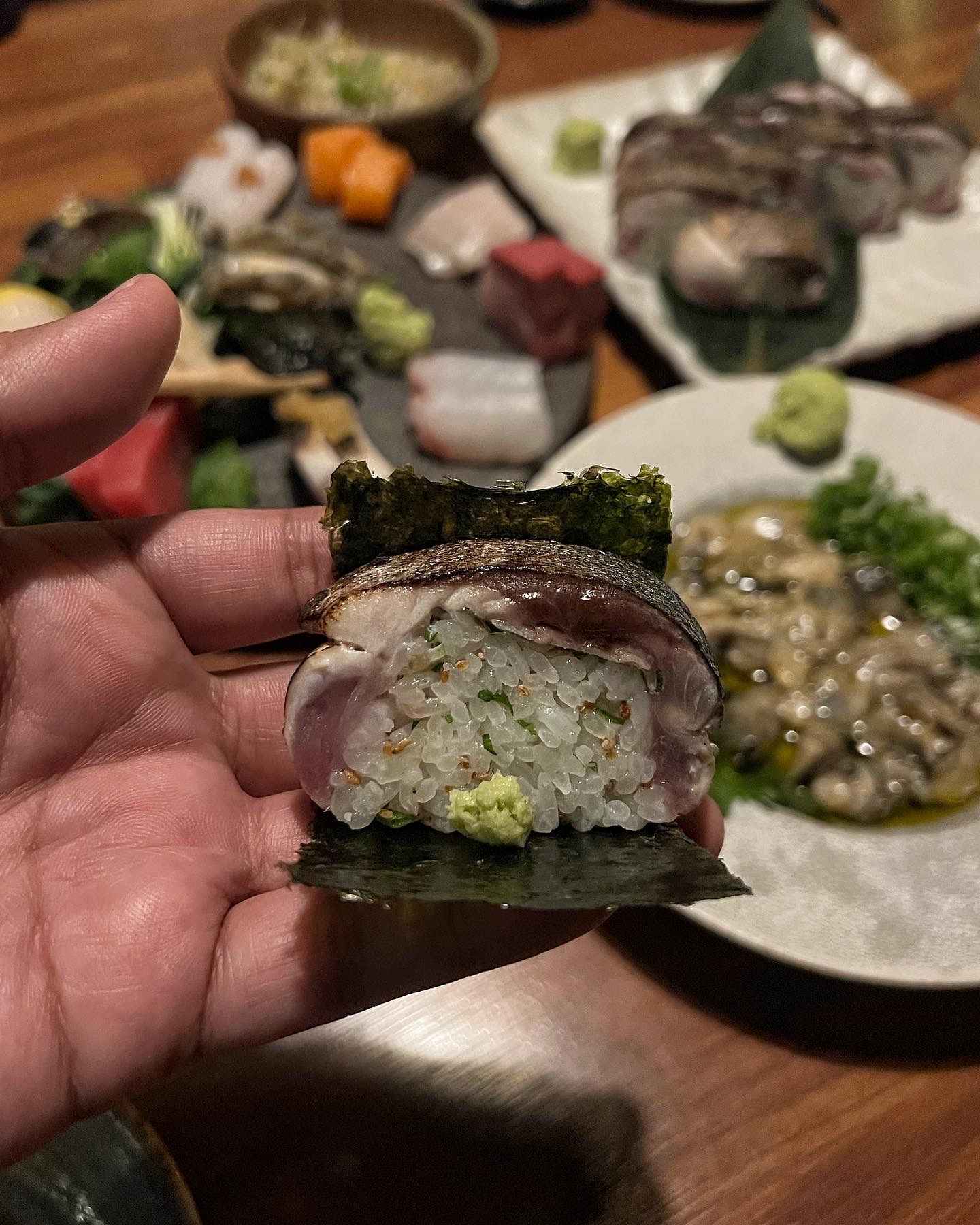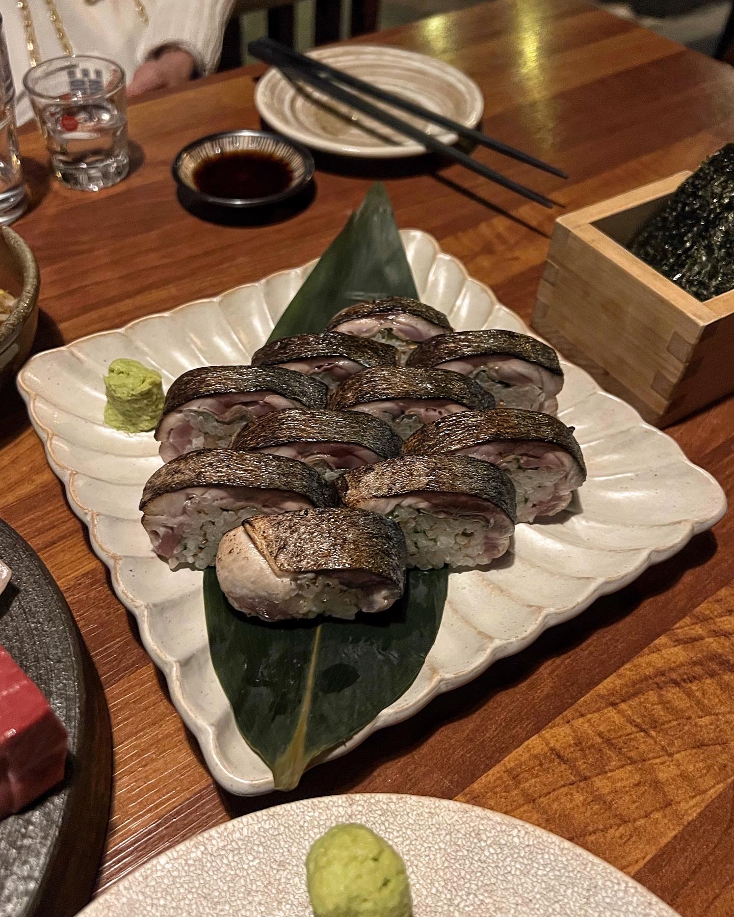 초밥 한 점 집어서 김 위에 올리고 와사비와 함께 싸서 먹어보자. 겉면을 익힌 고등어의 고소한 풍미와 달콤 새콤하게 간이 된 밥의 밸런스가 참 좋다.