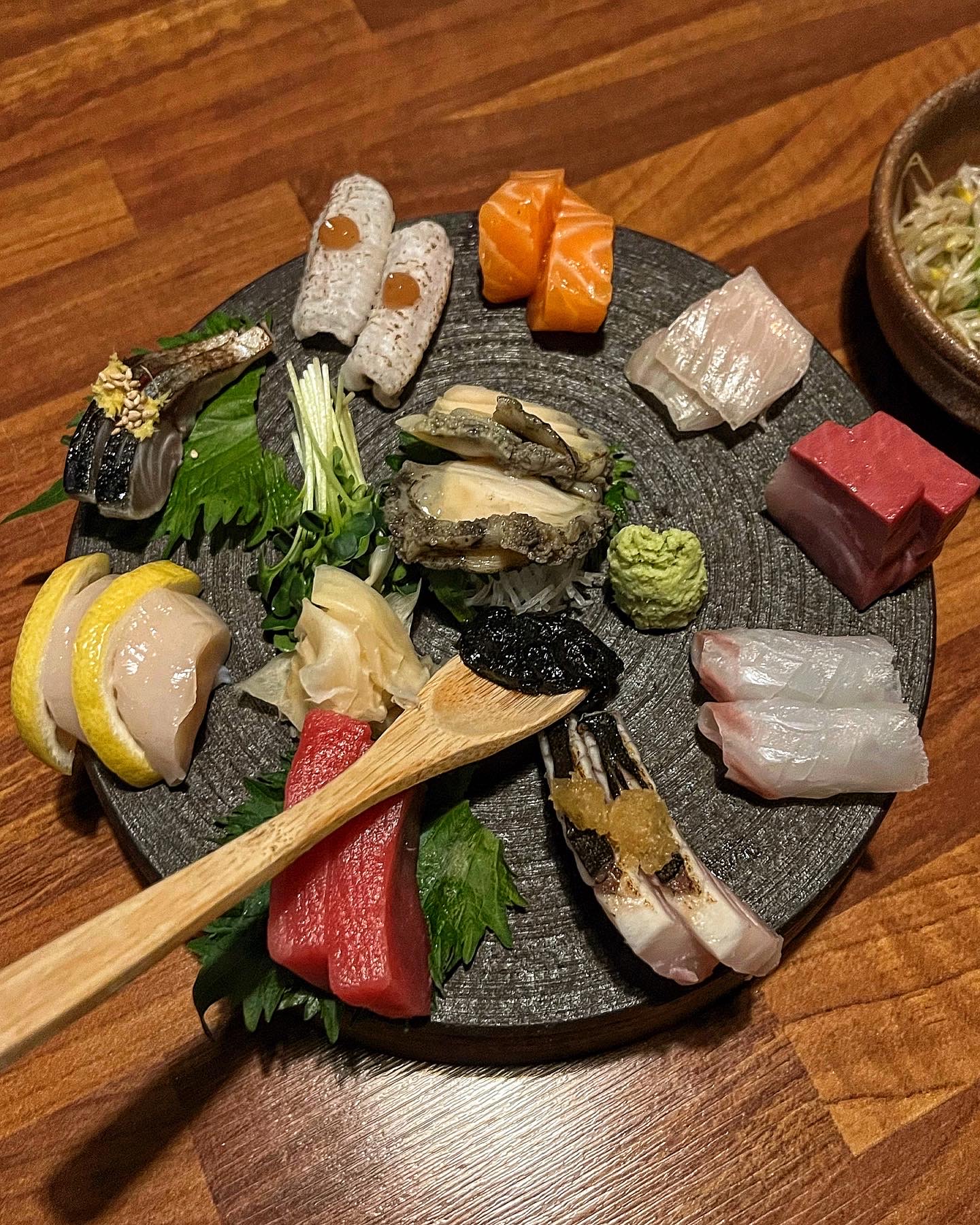 덴 사시미는 빨간 참치, 관자, 고등어초절임, 붕장어, 연어, 광어, 방어, 삼치, 10종을 2피스씩 접시에 담았다.