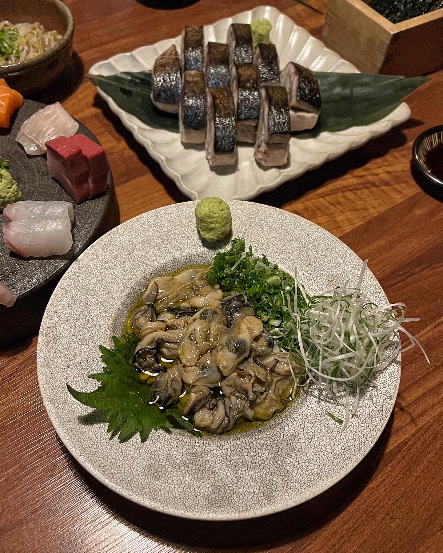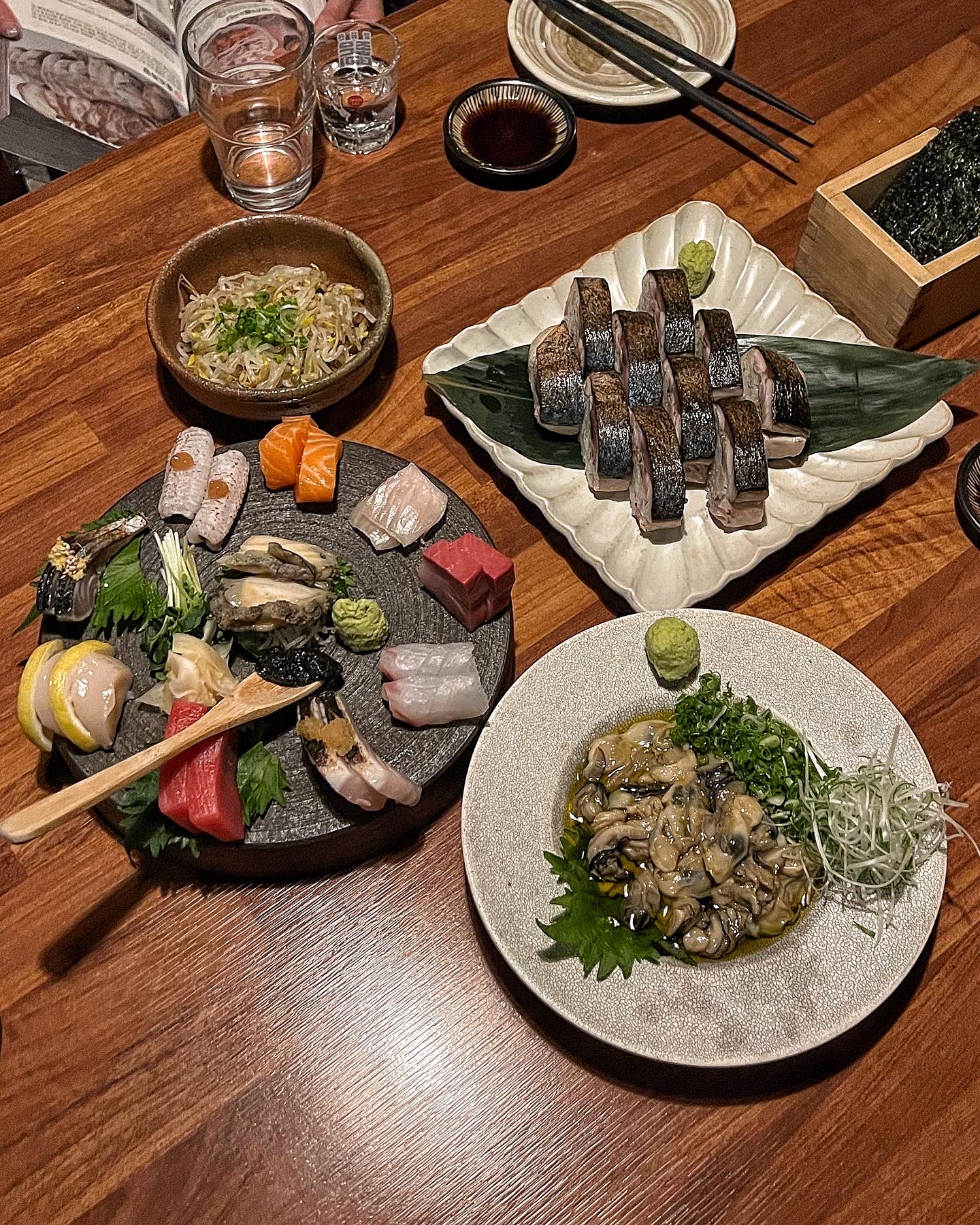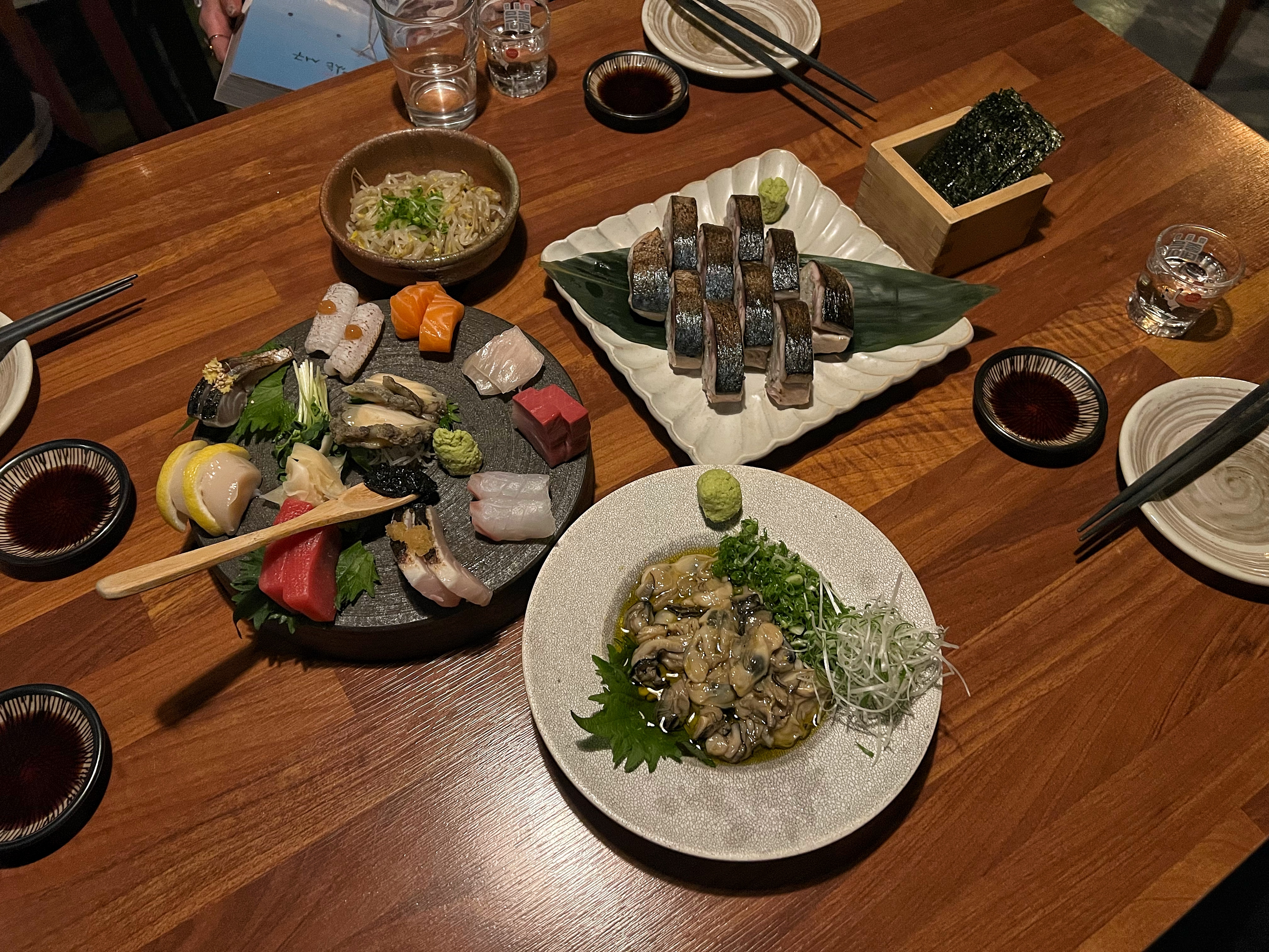 덴사시미와 굴올리브 세트와 고등어봉초밥을 주문했다. 덴사시미는 2인 기준으로 3만원. 여기에 굴올리브절임을 1만원에 추가할 수 있다. 고등어봉초밥은 2만 5천원이다.