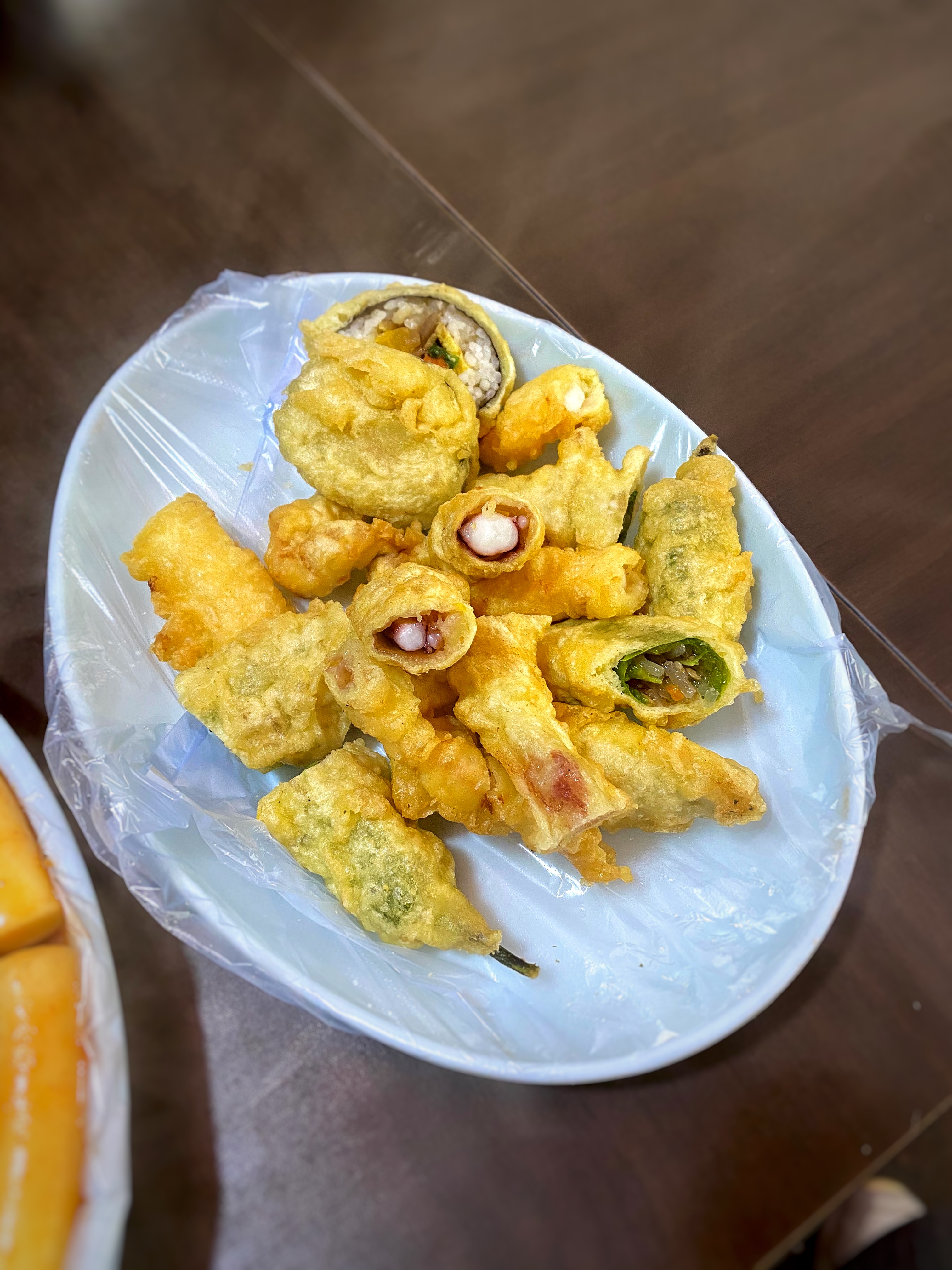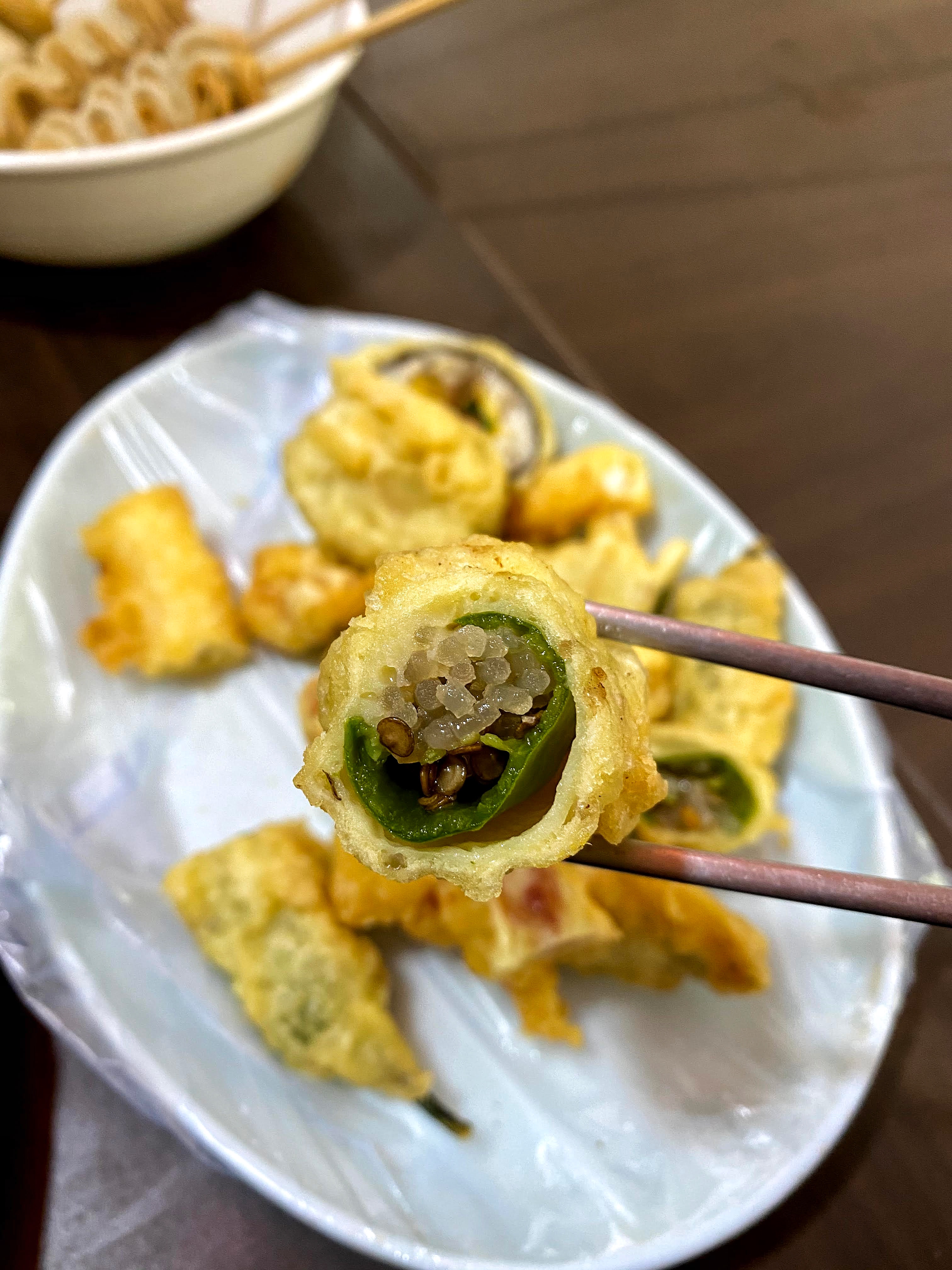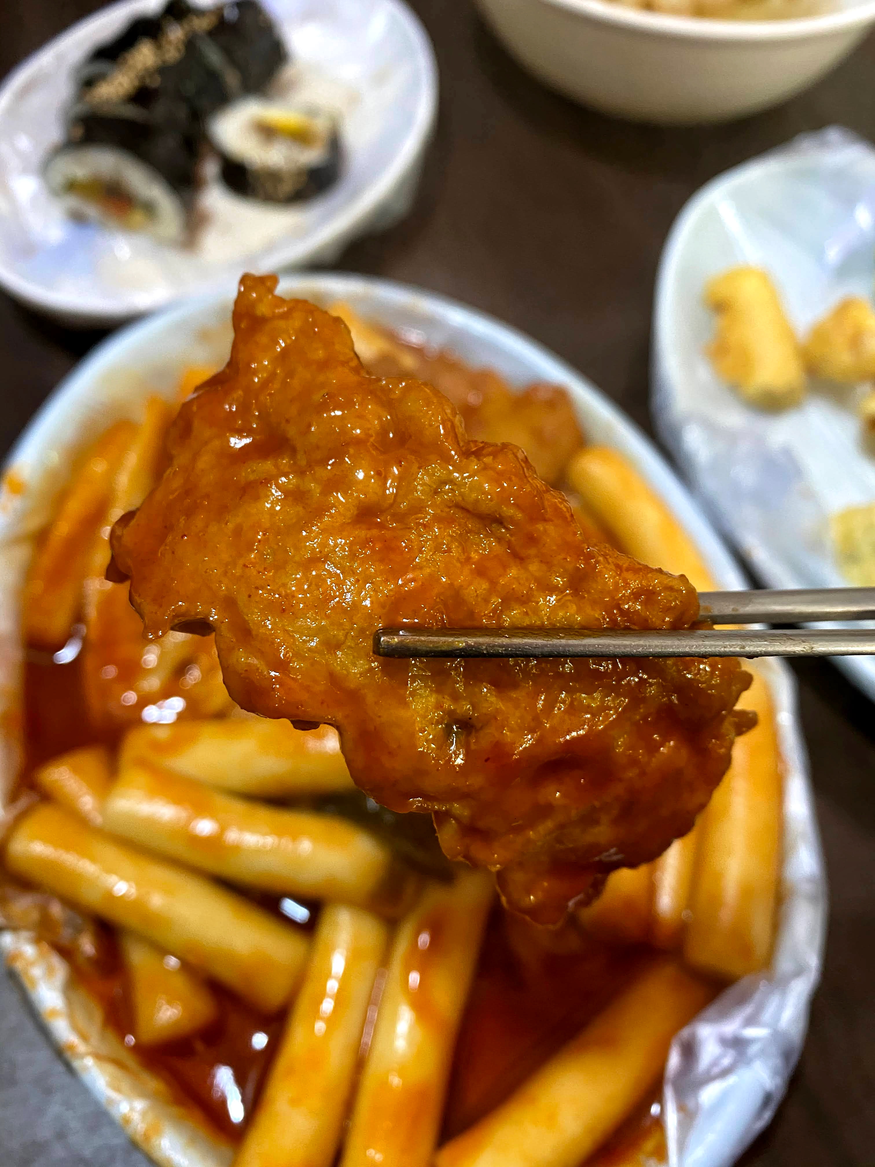 튀김은 오징어 튀김과 고추튀김이지. 당면이 들어간 고추튀김을 떡볶이소스에 찍어 먹는 게 간장보다 좋다.