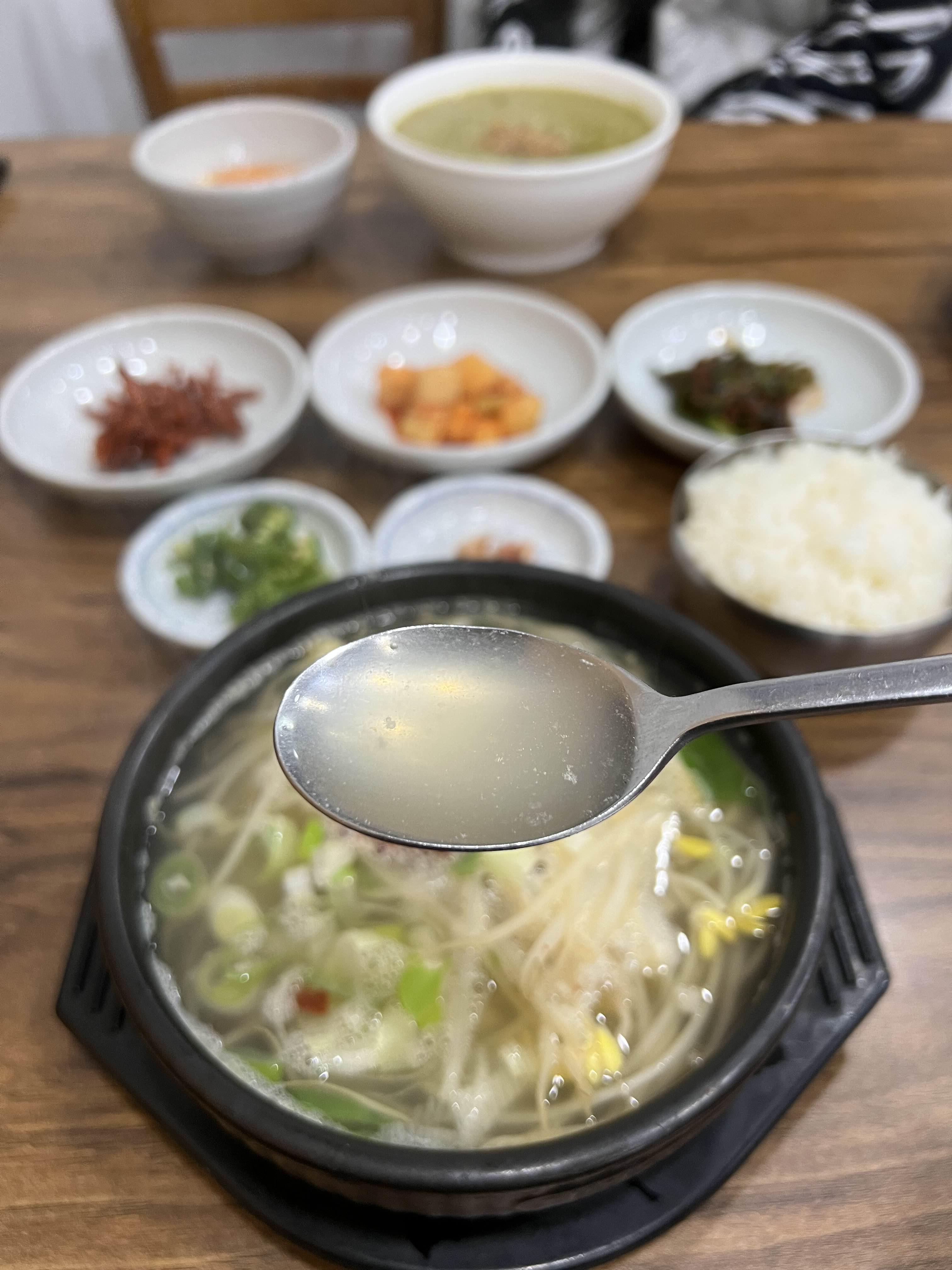 가운데 올려져있는 양념장을 풀기전에 국물 먼저 떠 먹어봤다. 뜨끈하면서 담백한 게 감칠맛이 은은한 조갯국