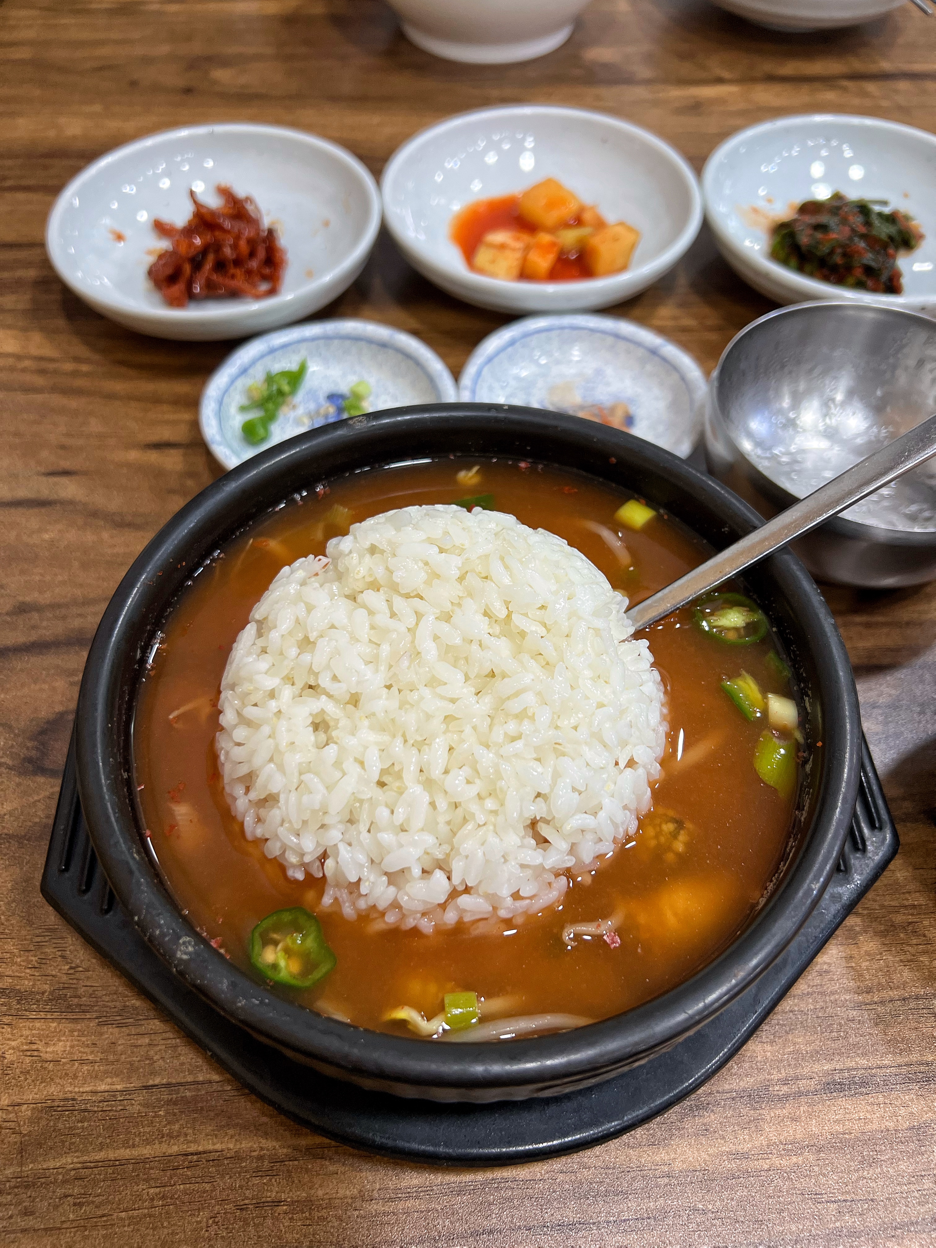 가운데 올려져있는 양념장을 풀기전에 국물 먼저 떠 먹어봤다. 뜨끈하면서 담백한 게 감칠맛이 은은한 조갯국