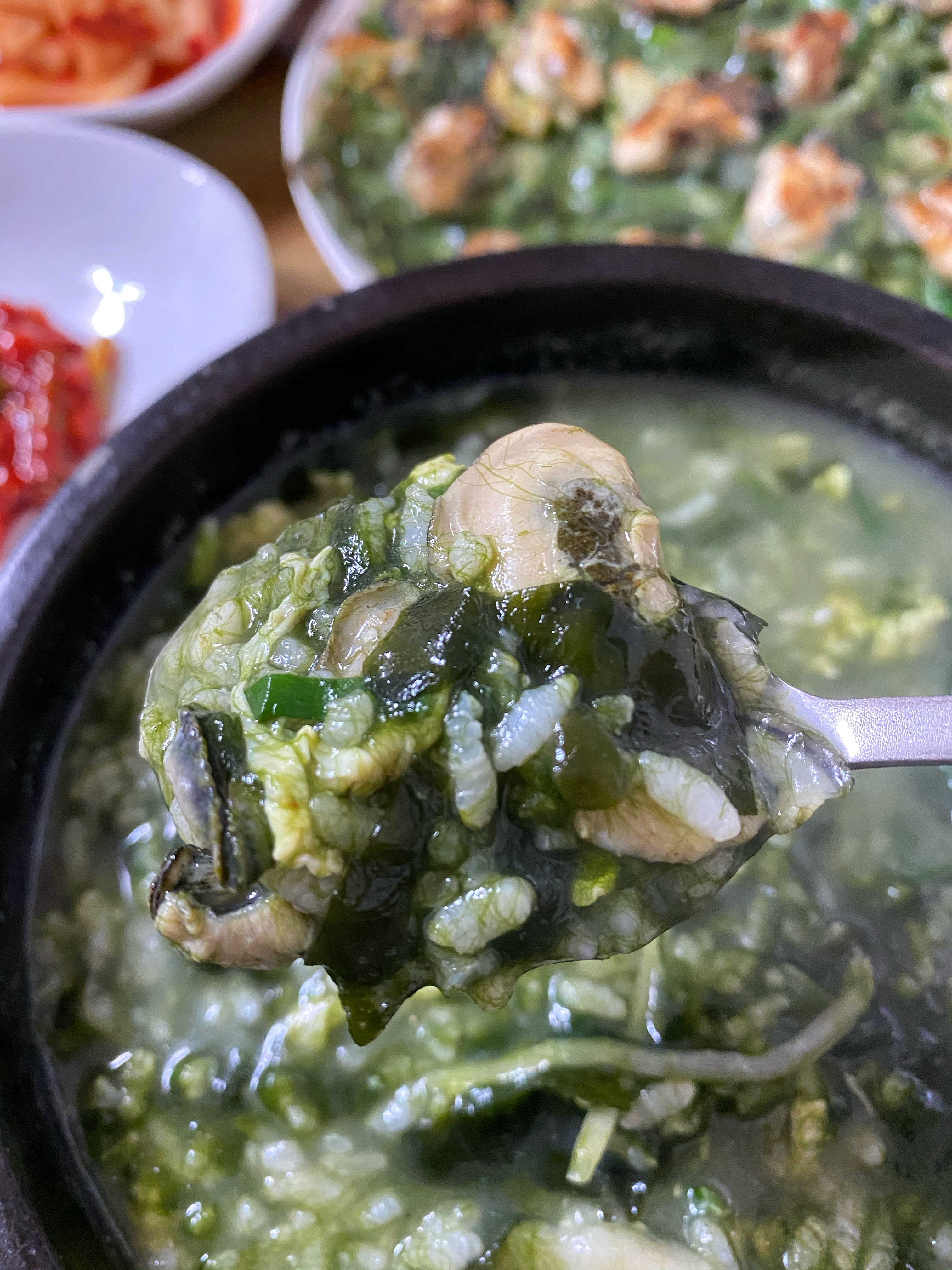이어서 등장한 매생이굴국밥. 일반 사이즈는 9,000원. 특 사이즈는 11,000원인데 특 사이즈의 뚝배기가 훨씬 크고 굴의 양도 많다.