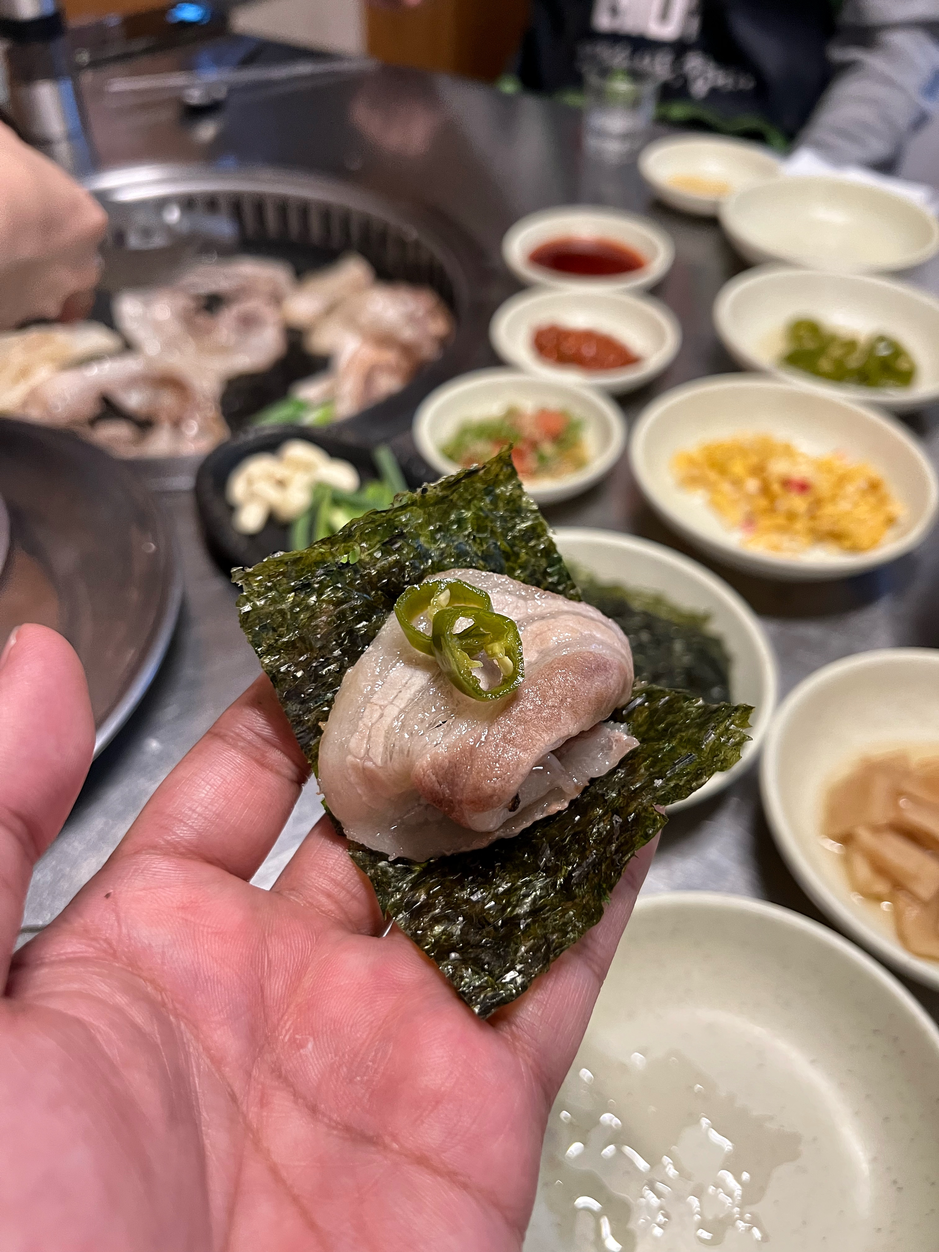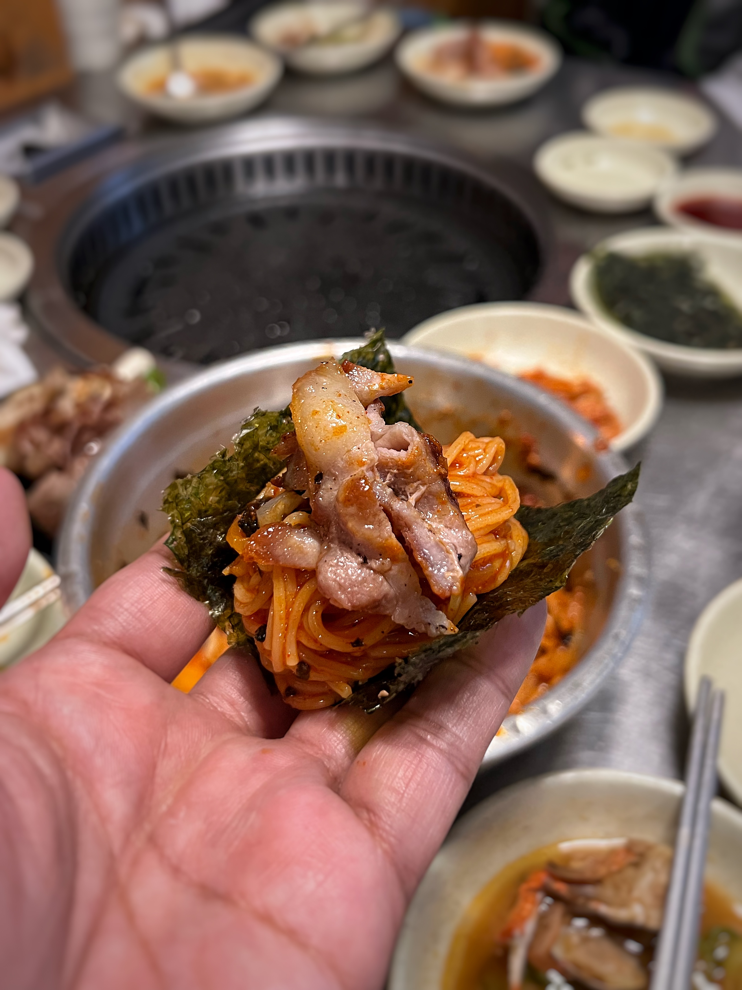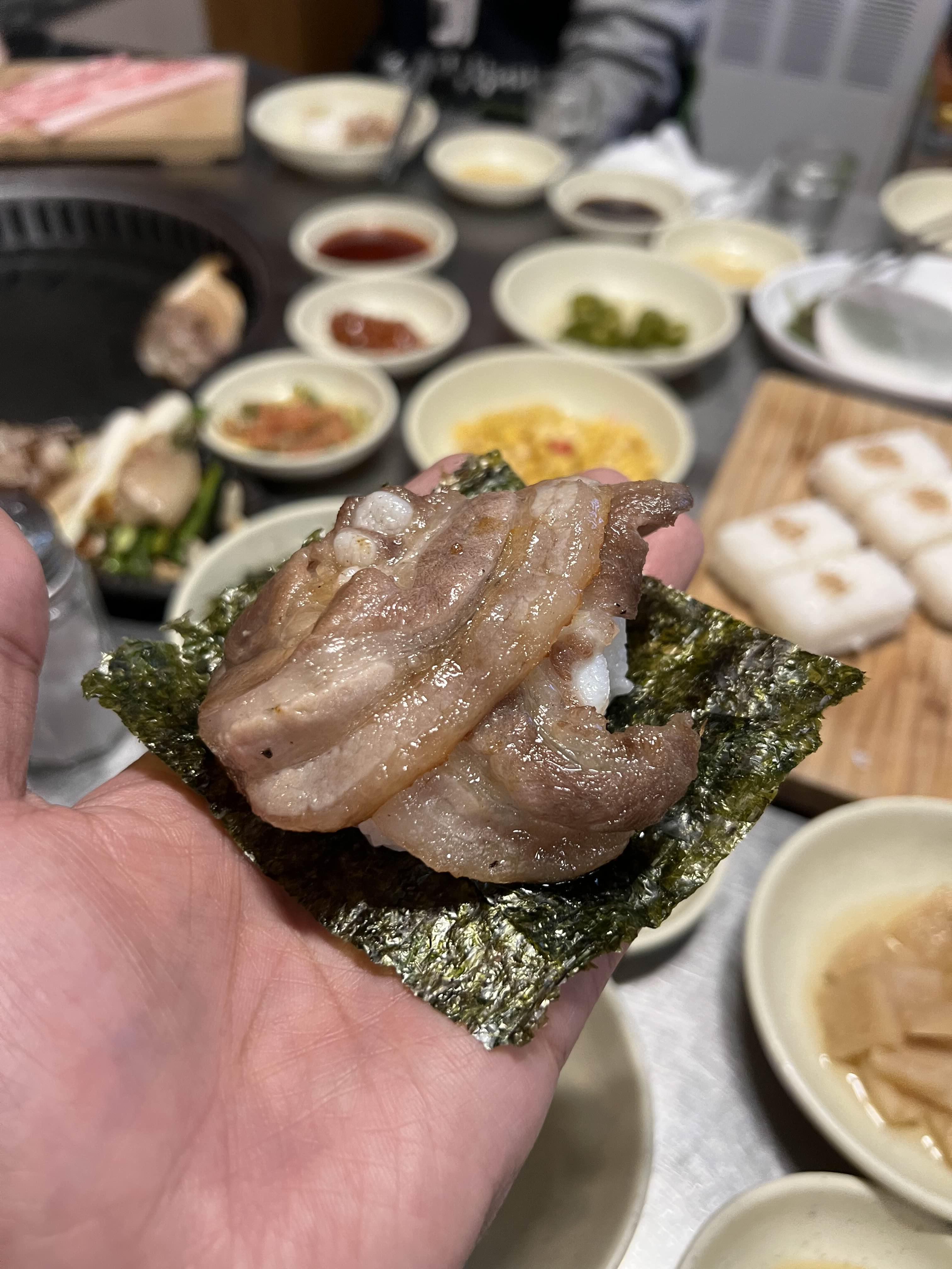 상추나 깻잎같은 쌈채소 대신 구운 김을 내어준다. 김에 뭔가를 싸서 먹을 때 밥이 없으니 뭔가 허전하다.
