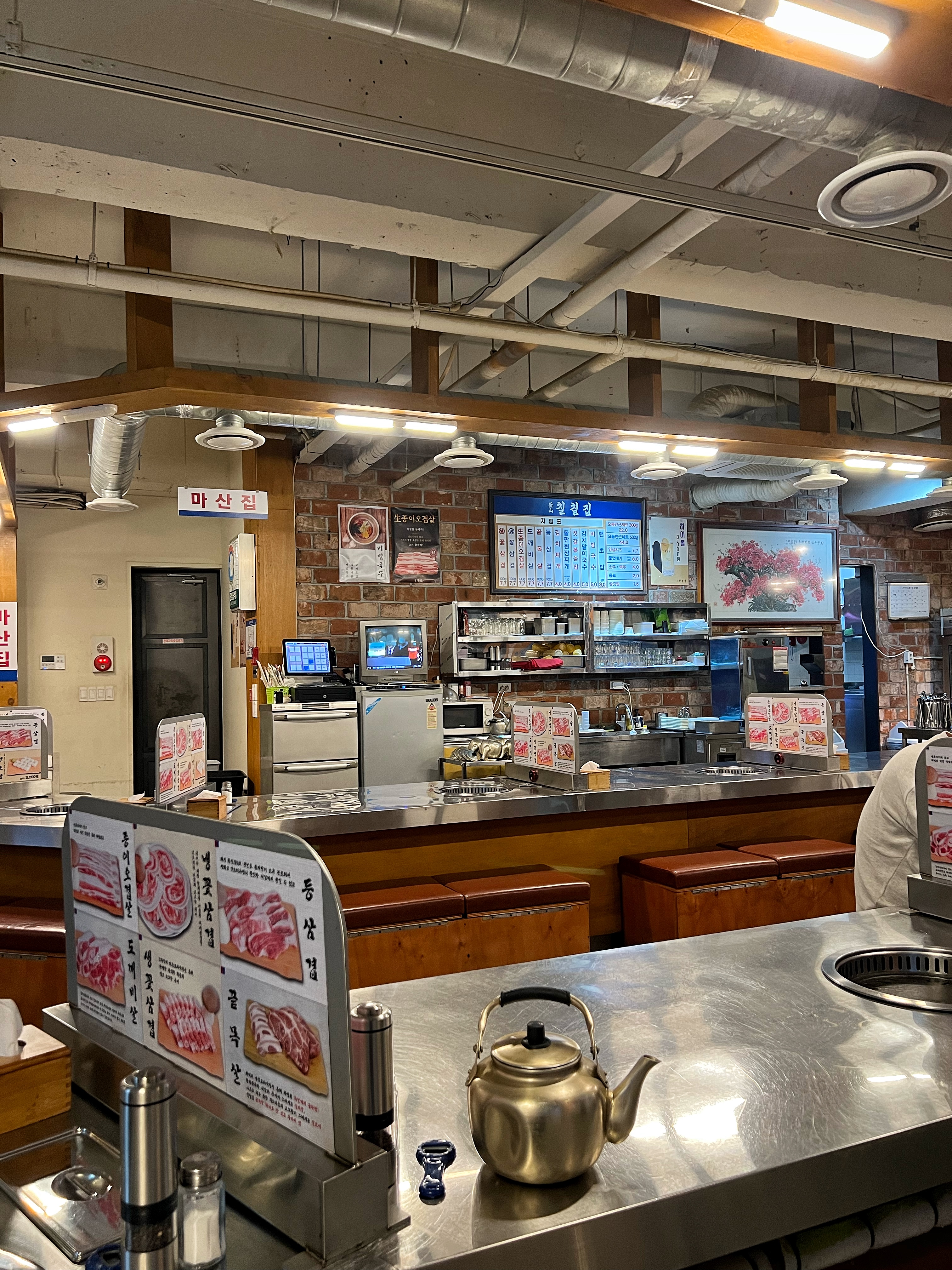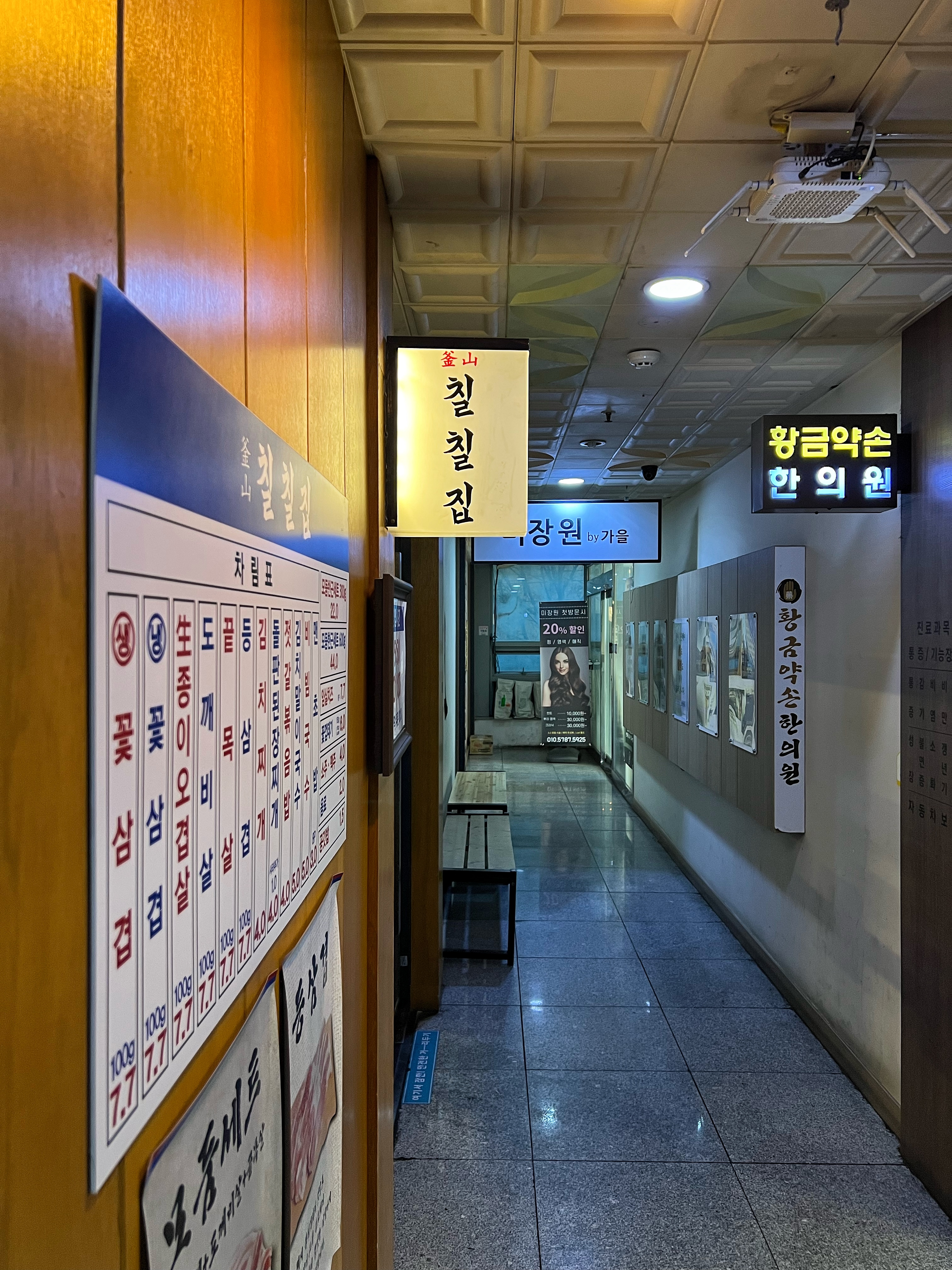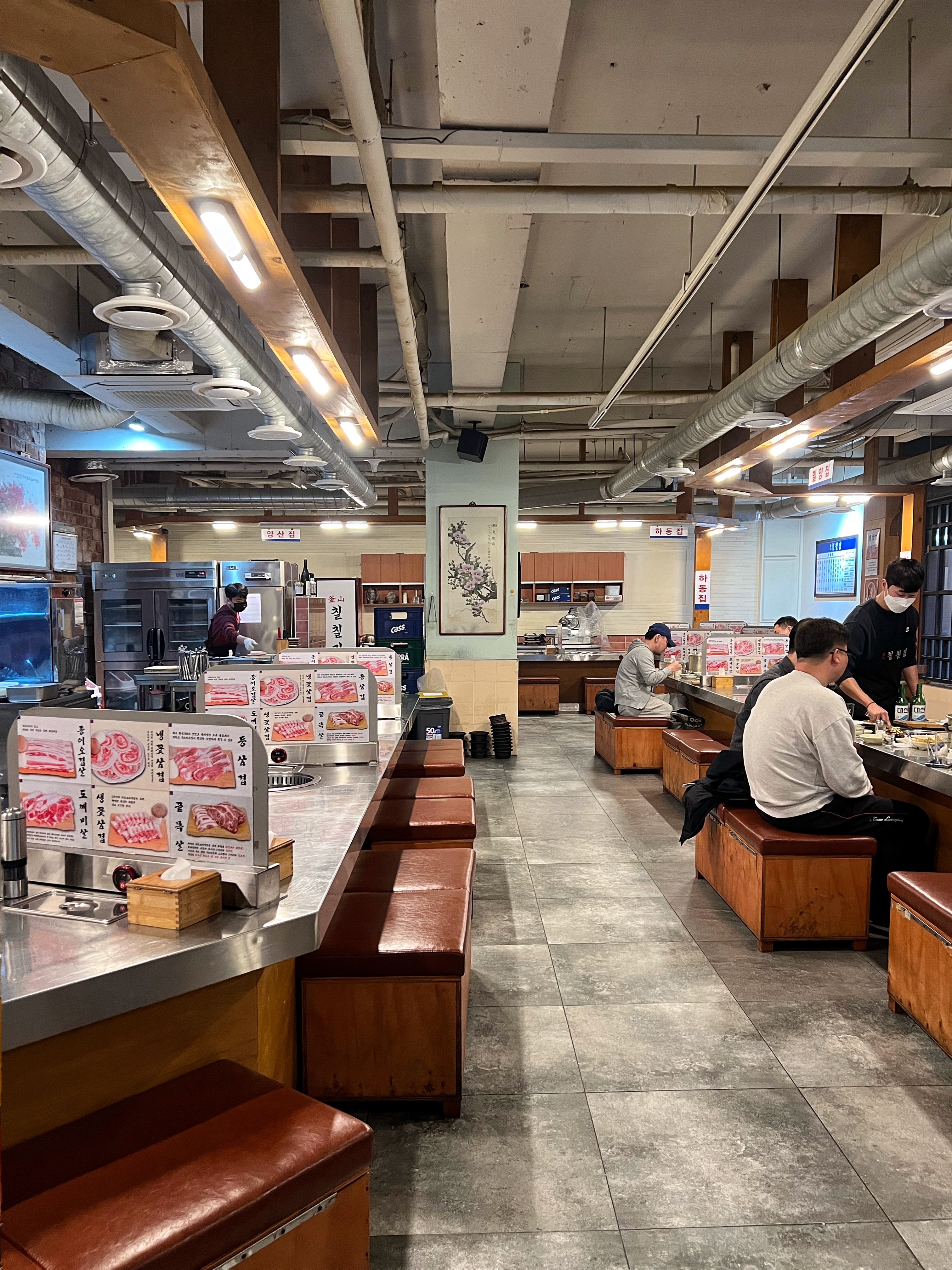 구조가 독특한데 코너집이라고 부르는 부산의 양곱창집이나 온천장의 온천포장센타처럼 화명집, 마산집 같은 팻말을 달아놨다.