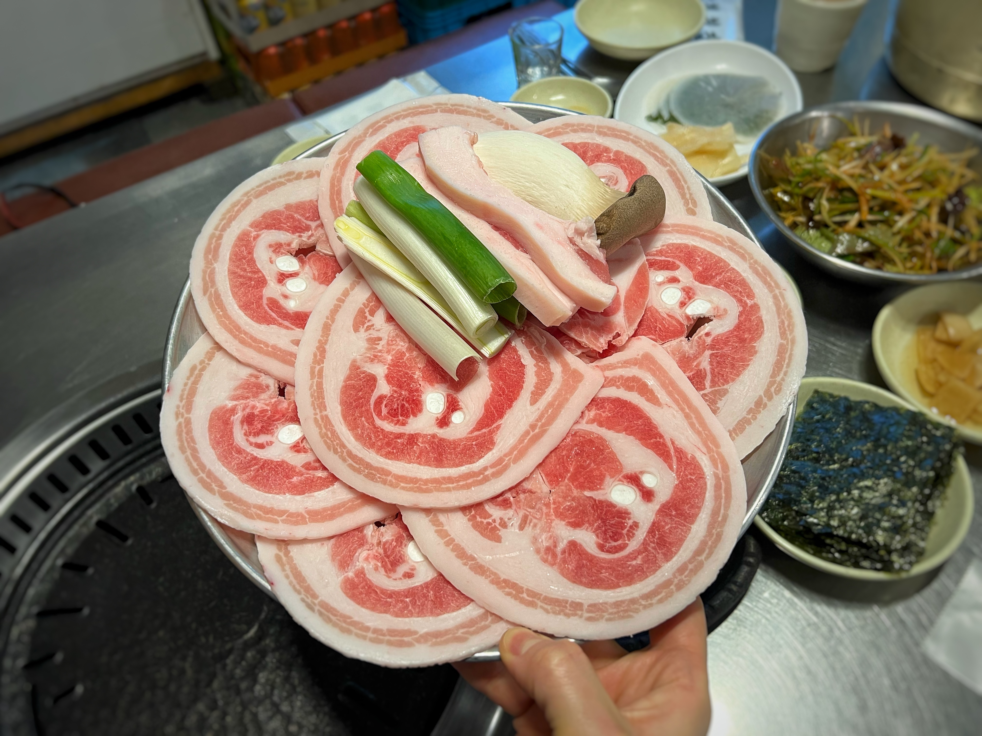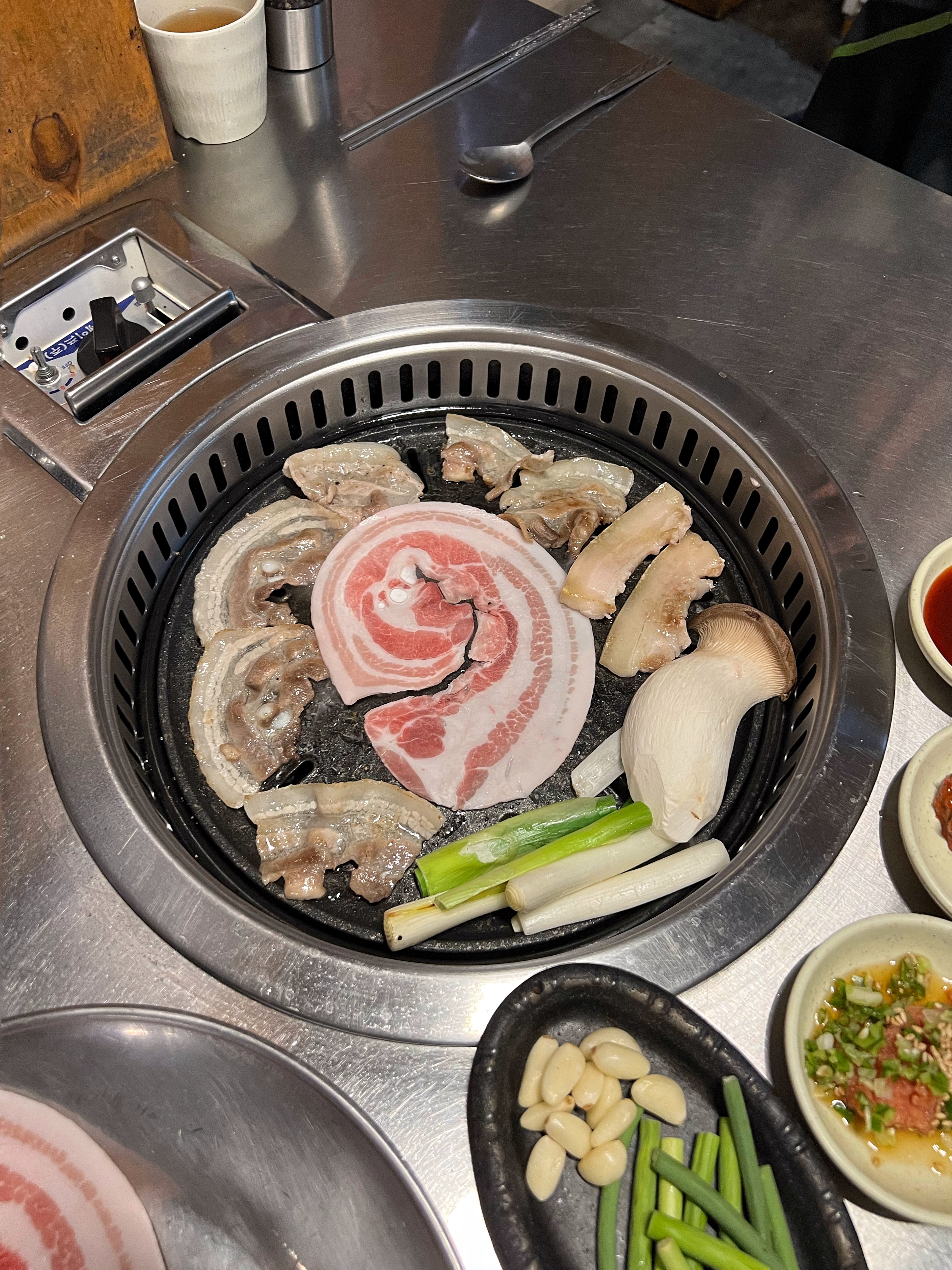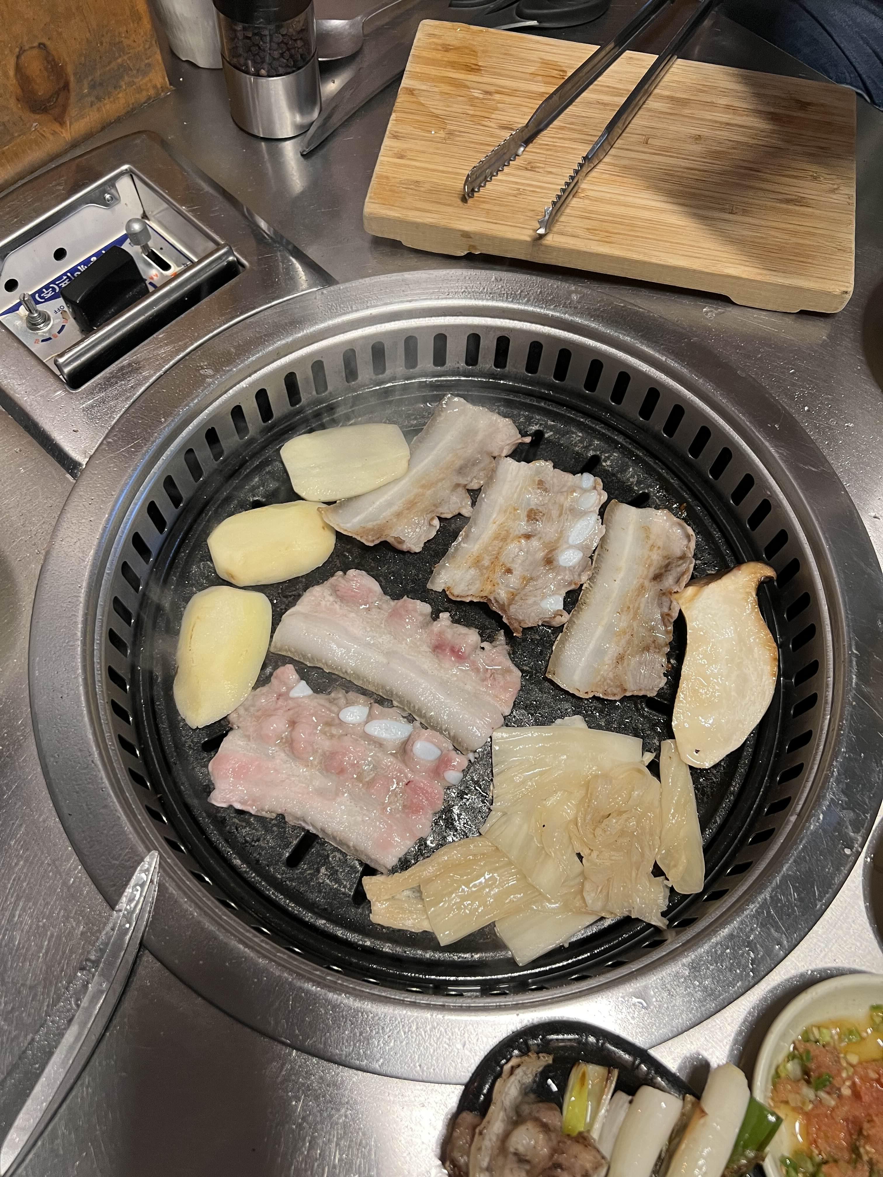 동글동글 말린 삼겹살을 달궈진 불판에 올리고 노릇하게 구워주니 고소한 냄새가 올라온다.
