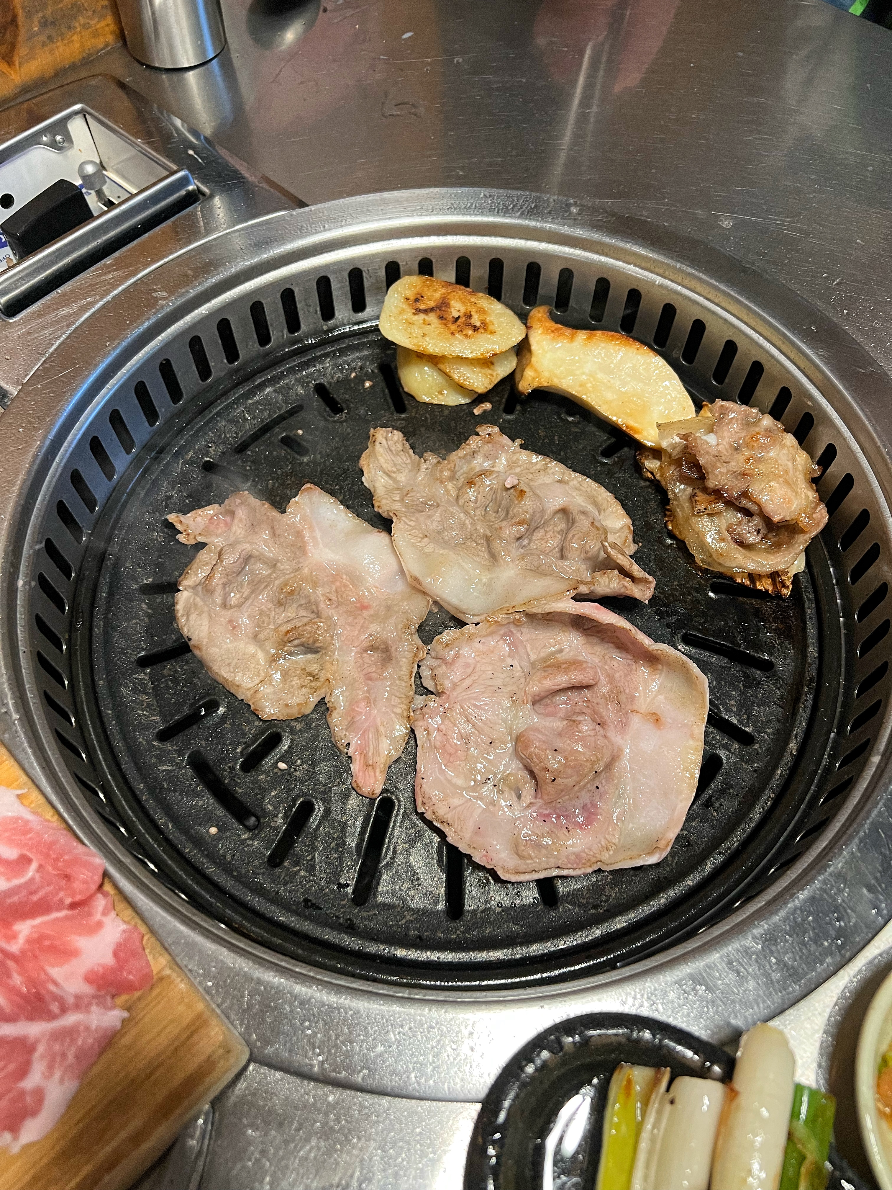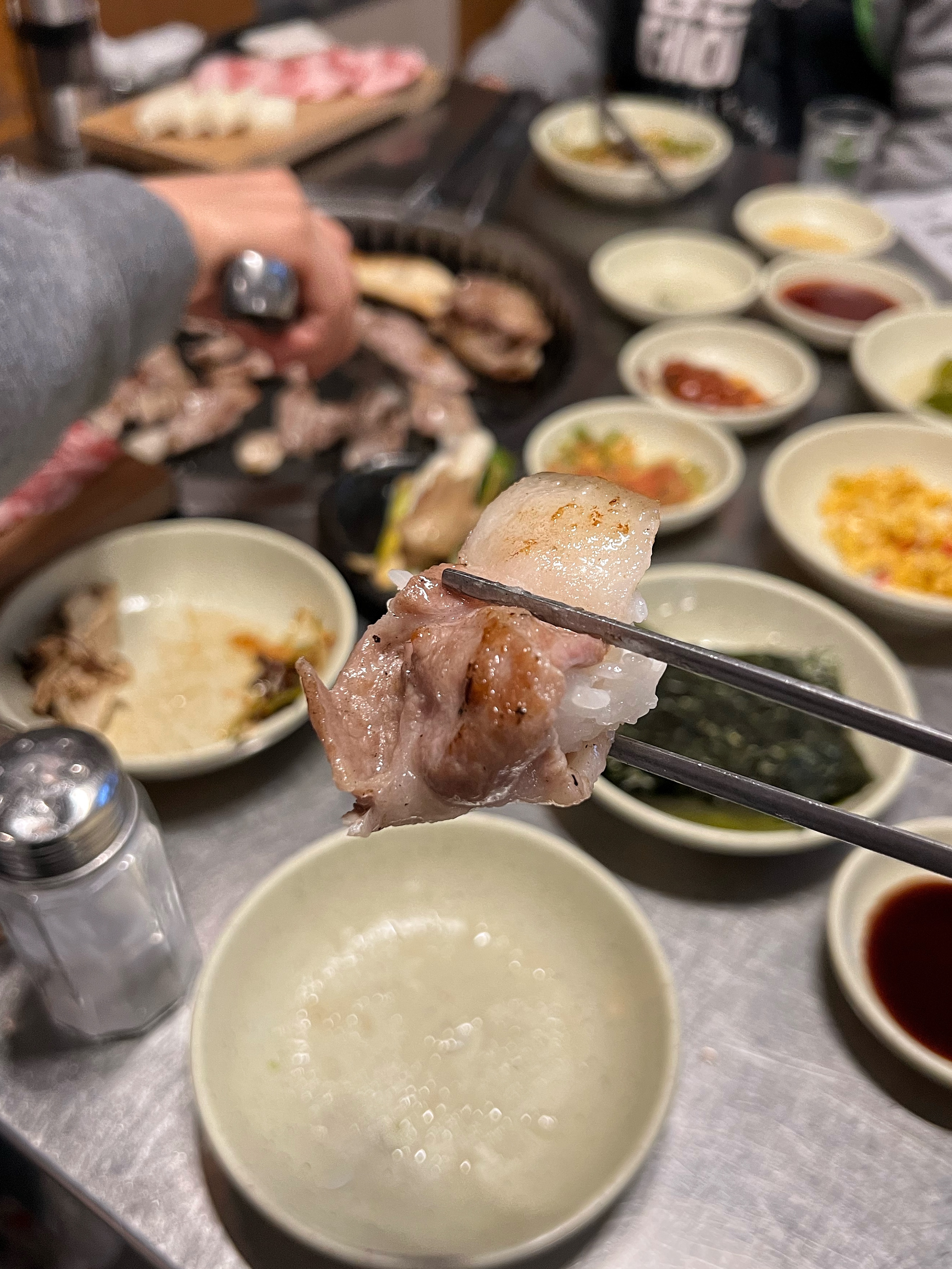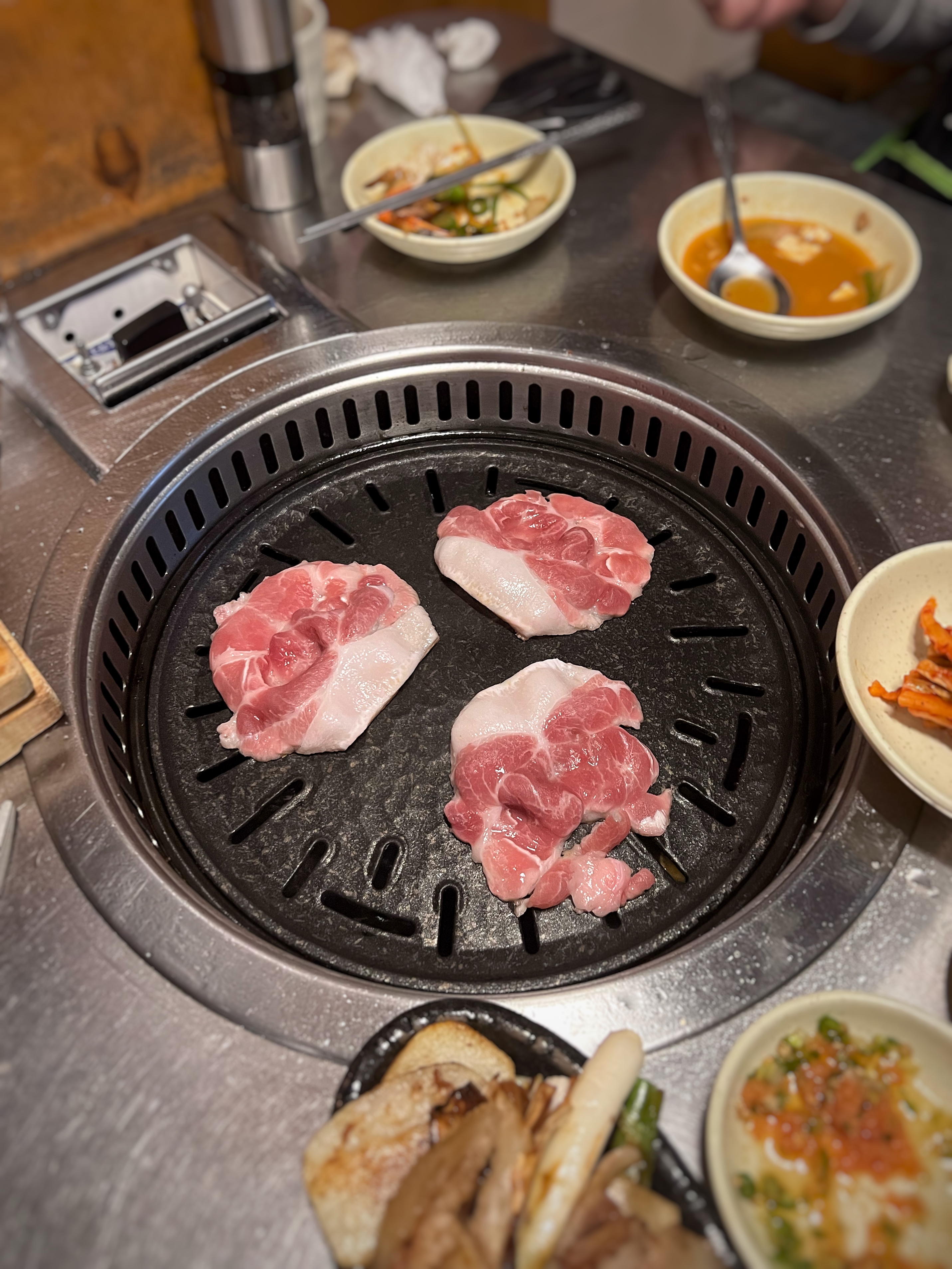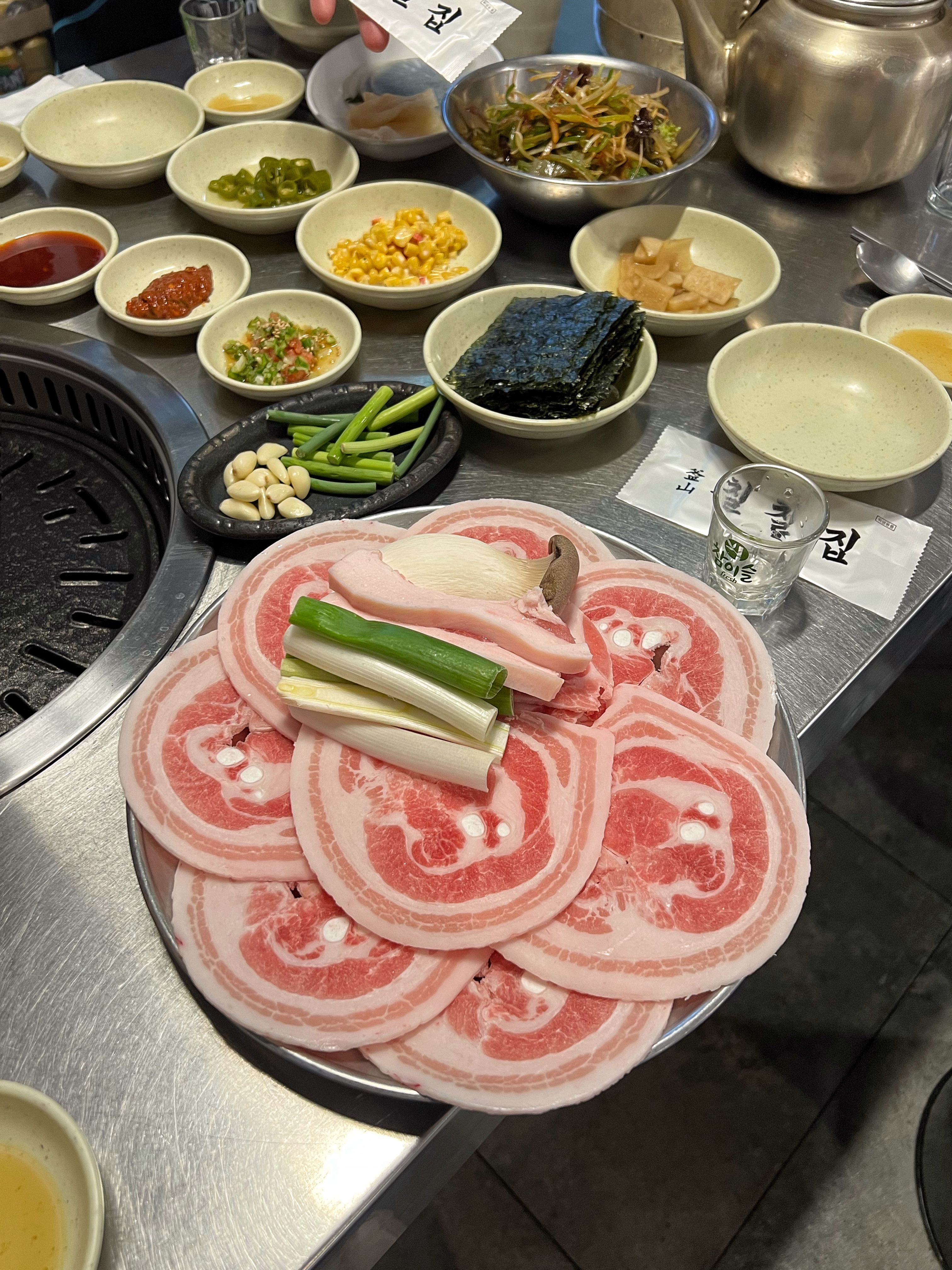 동글동글 말린 삼겹살을 달궈진 불판에 올리고 노릇하게 구워주니 고소한 냄새가 올라온다.