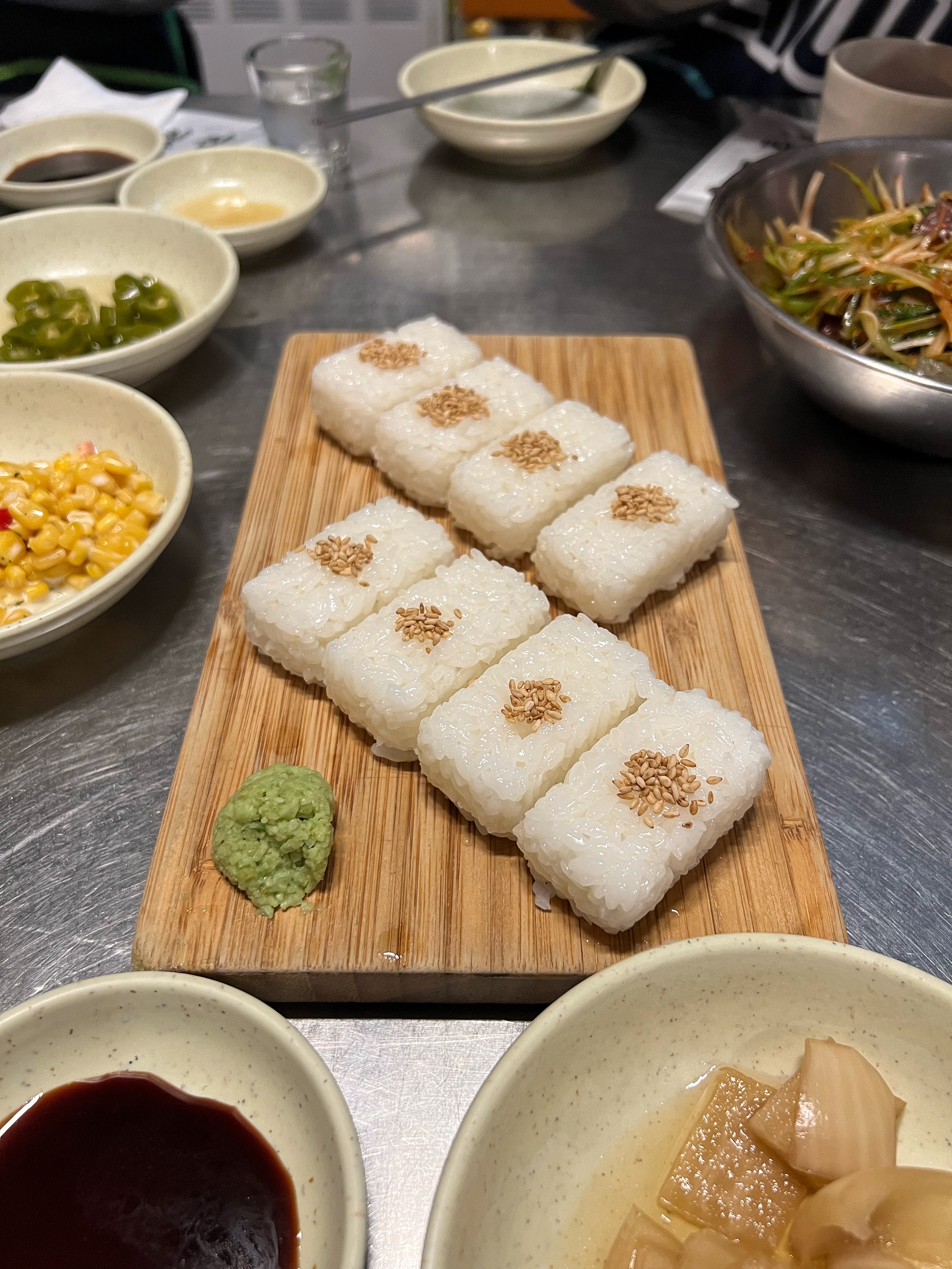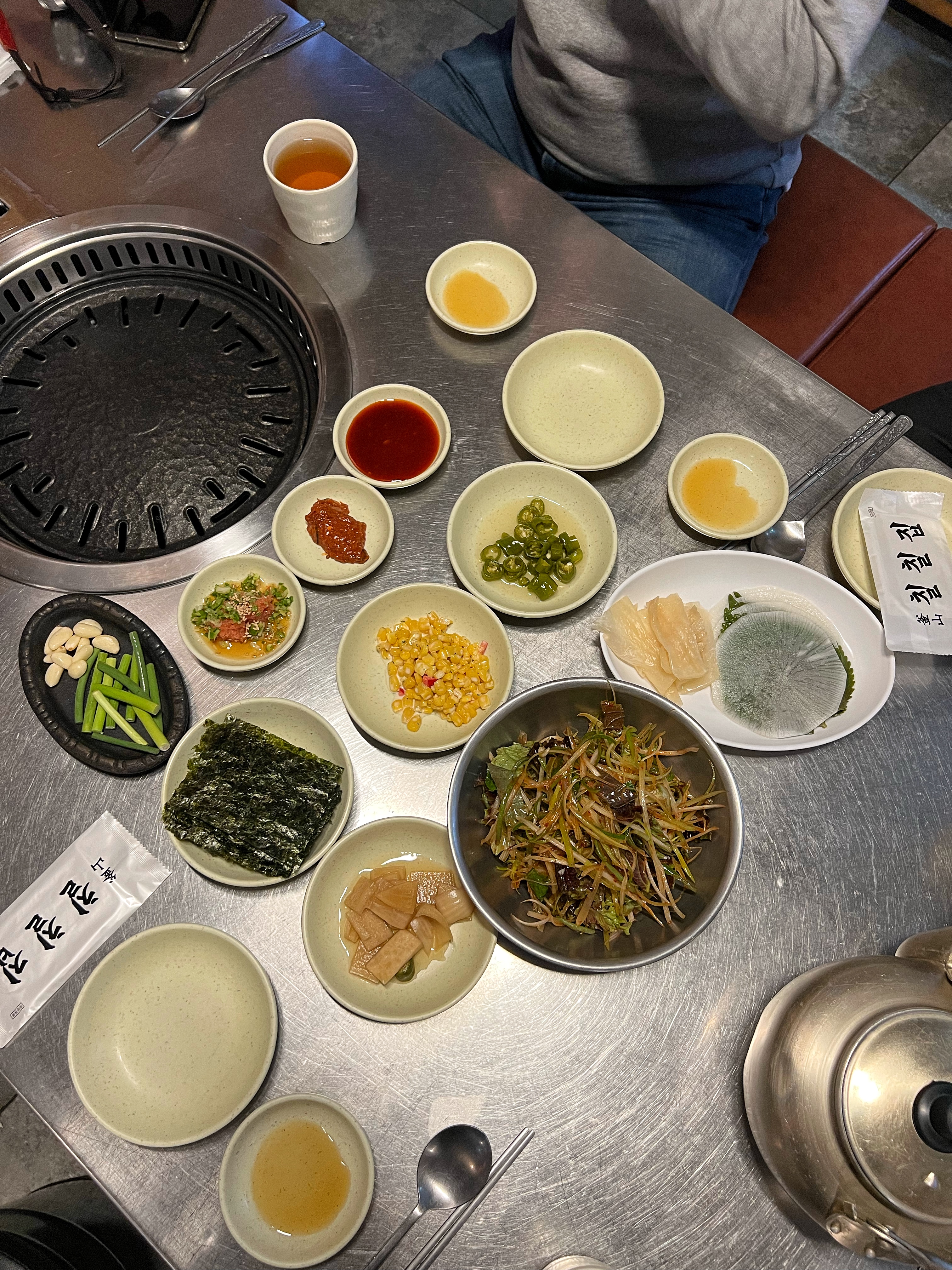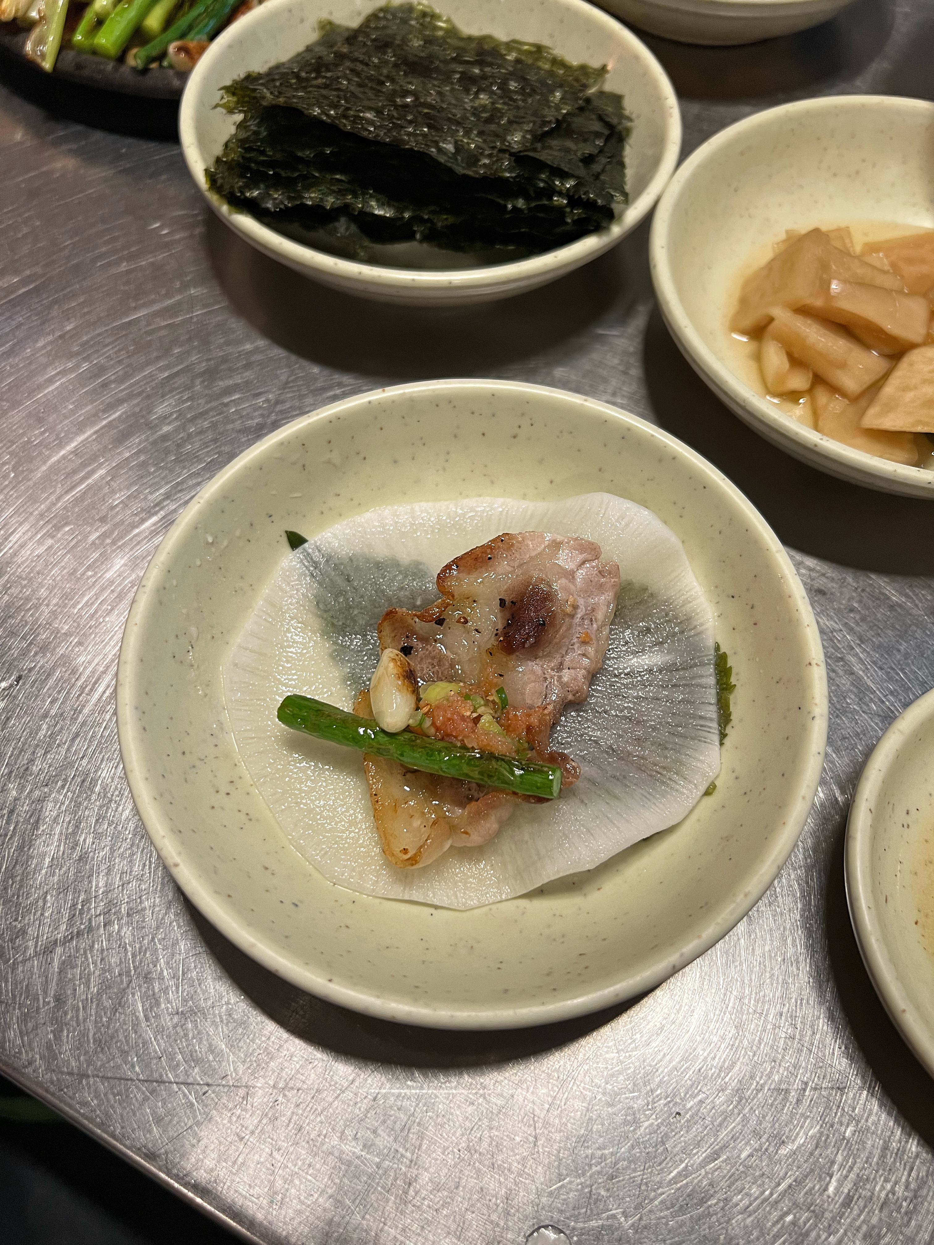 쌈무와 깻잎이 한세트였다. 그 위에 고기와 저염명란, 구운 마늘쫑을 올려서 먹어도 맛이 좋다.