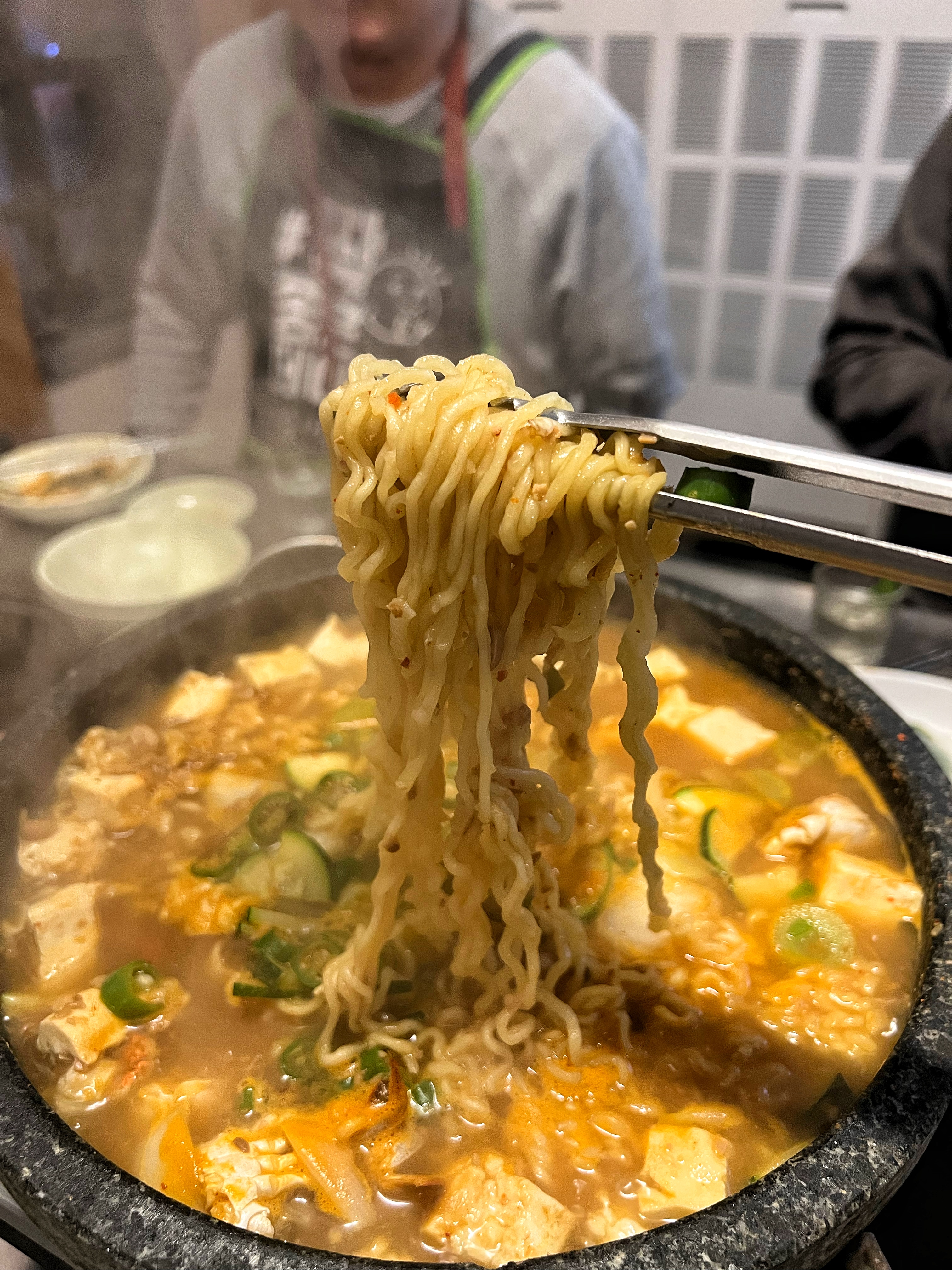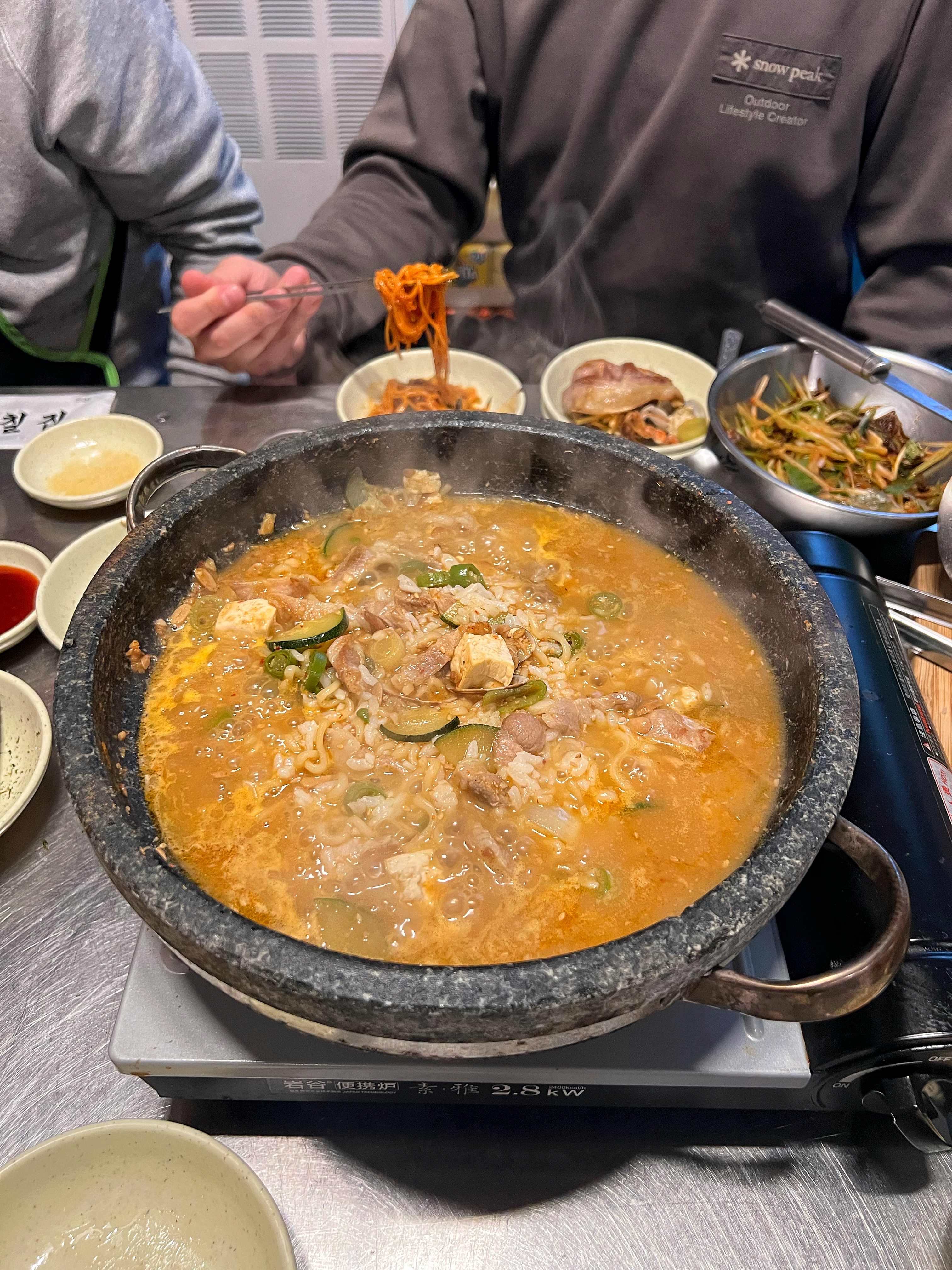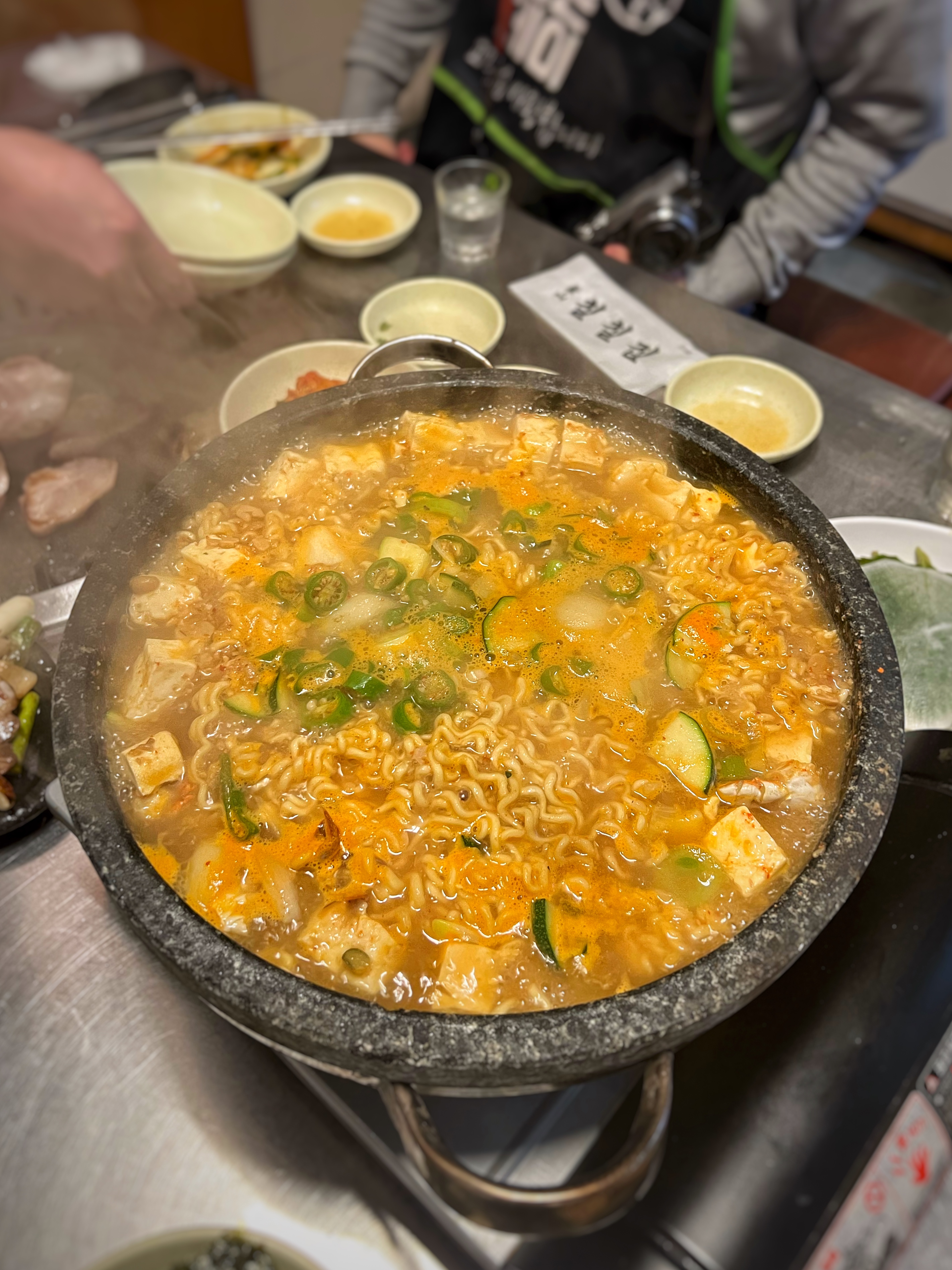식사는 돌판된장찌개에 라면사리를 추가해서 주문했다.