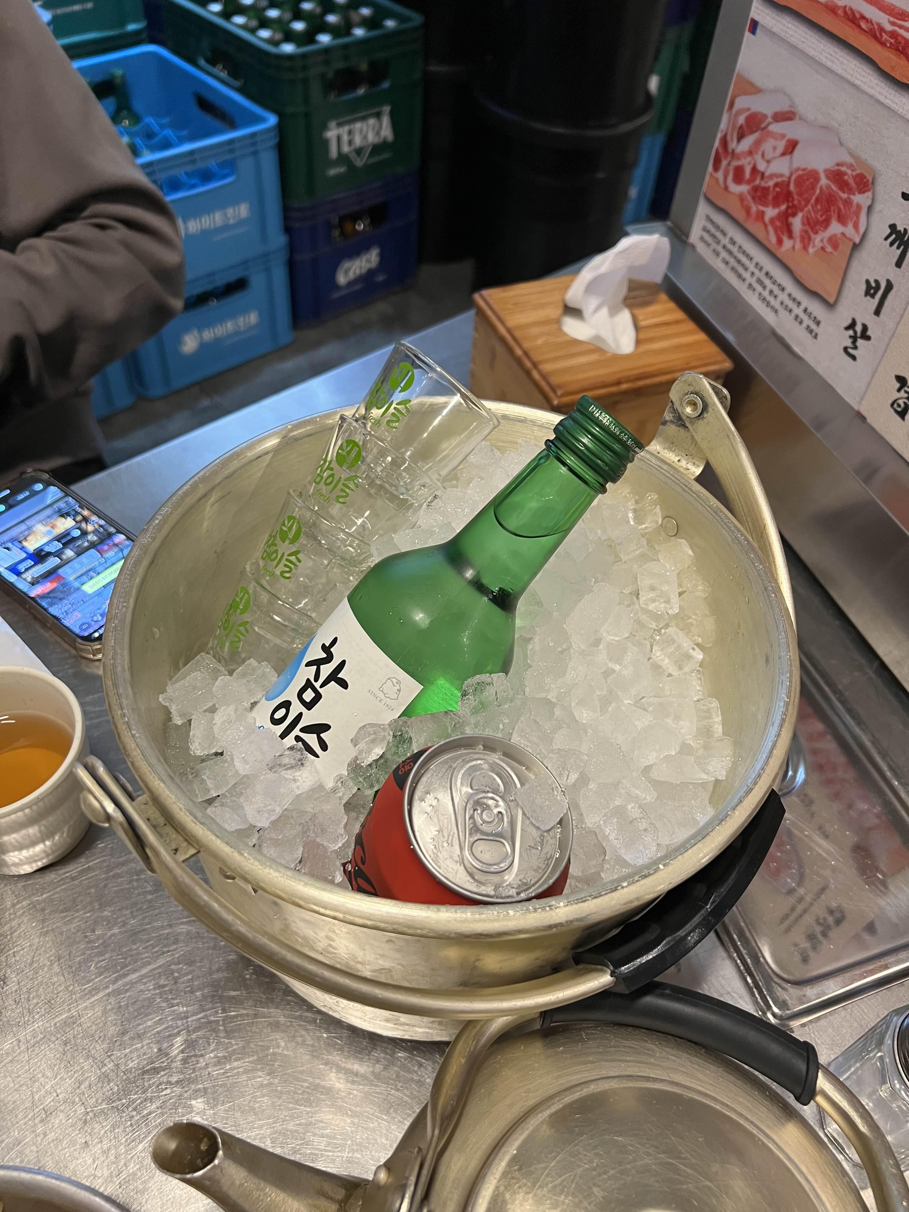 양철바스켓에 얼음을 채우고 주문한 술과 음료를 담아준다.