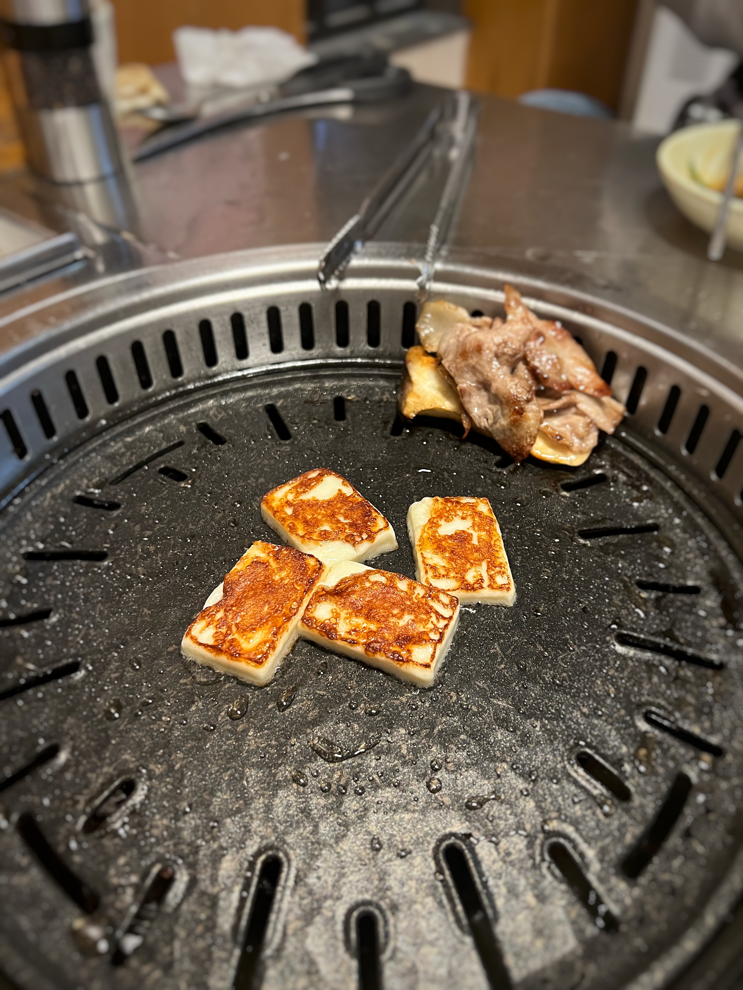 불판에 올리고 앞뒤로 구웠더니 고소한 치즈 냄새가 고기냄새를 뚫고 올라온다.