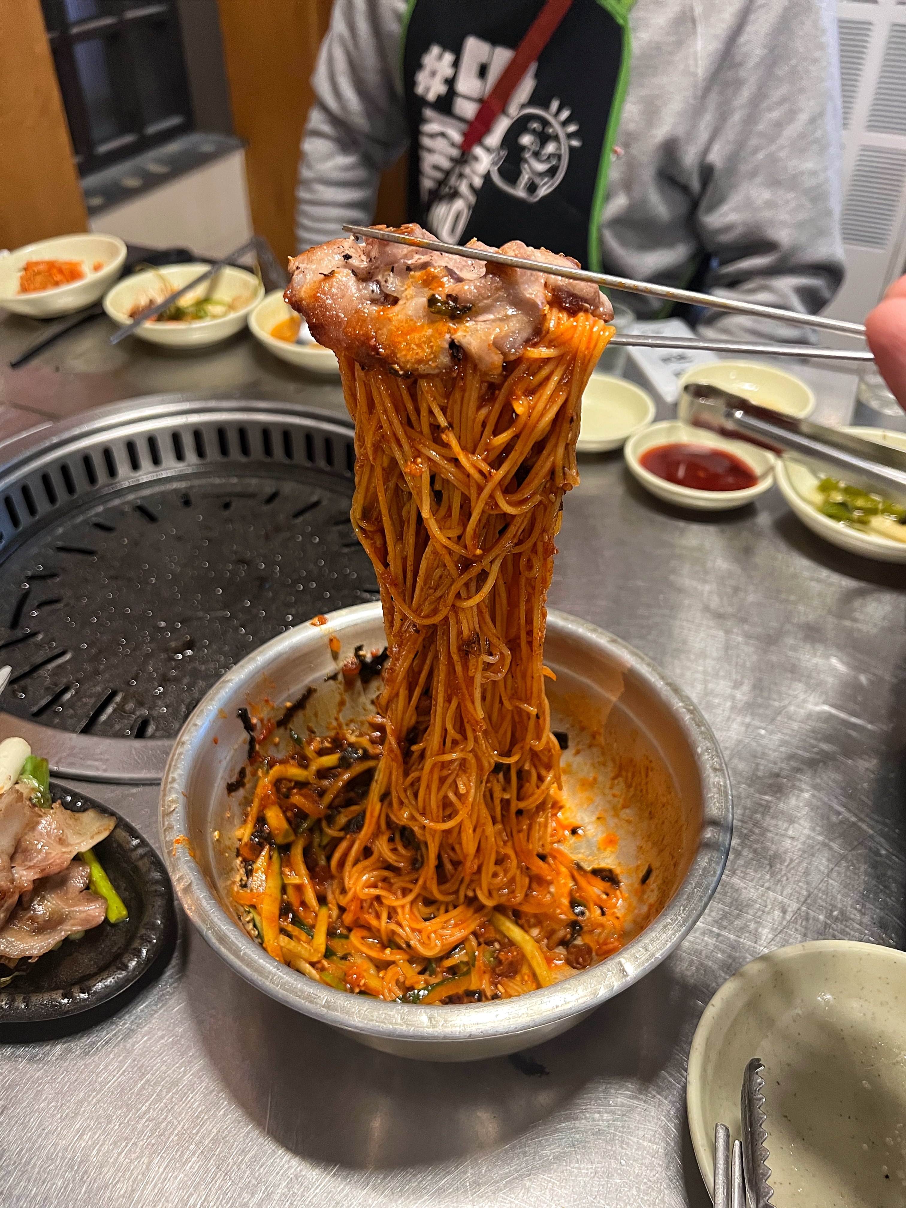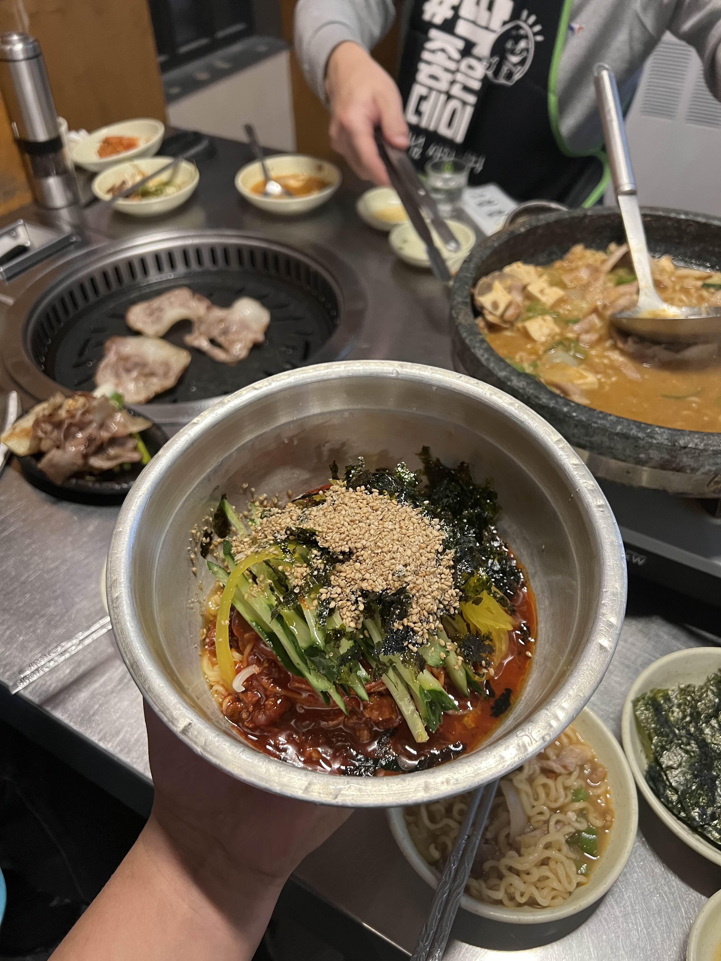 고기가 익어갈 때쯤 등장한 비빔국수.