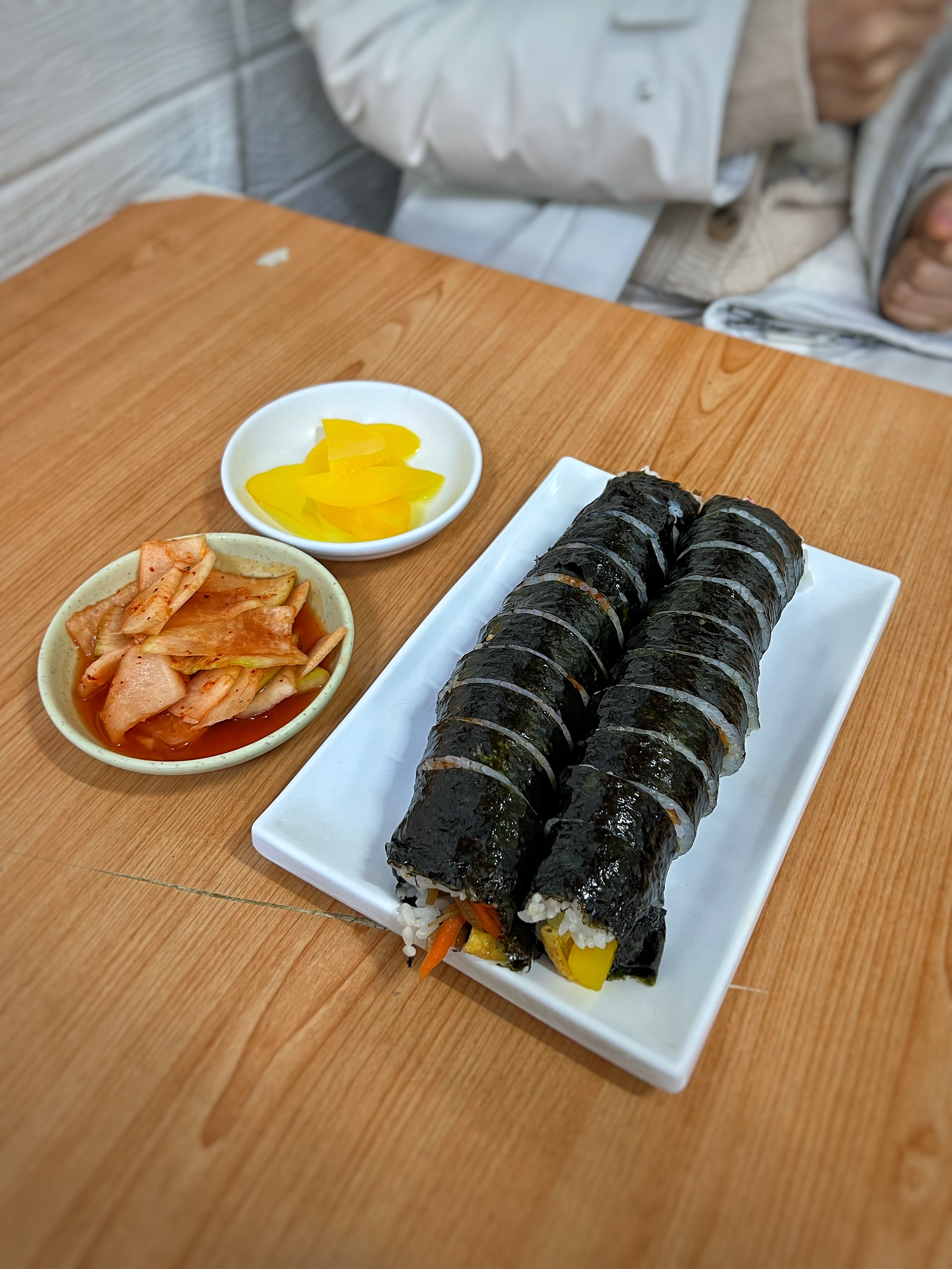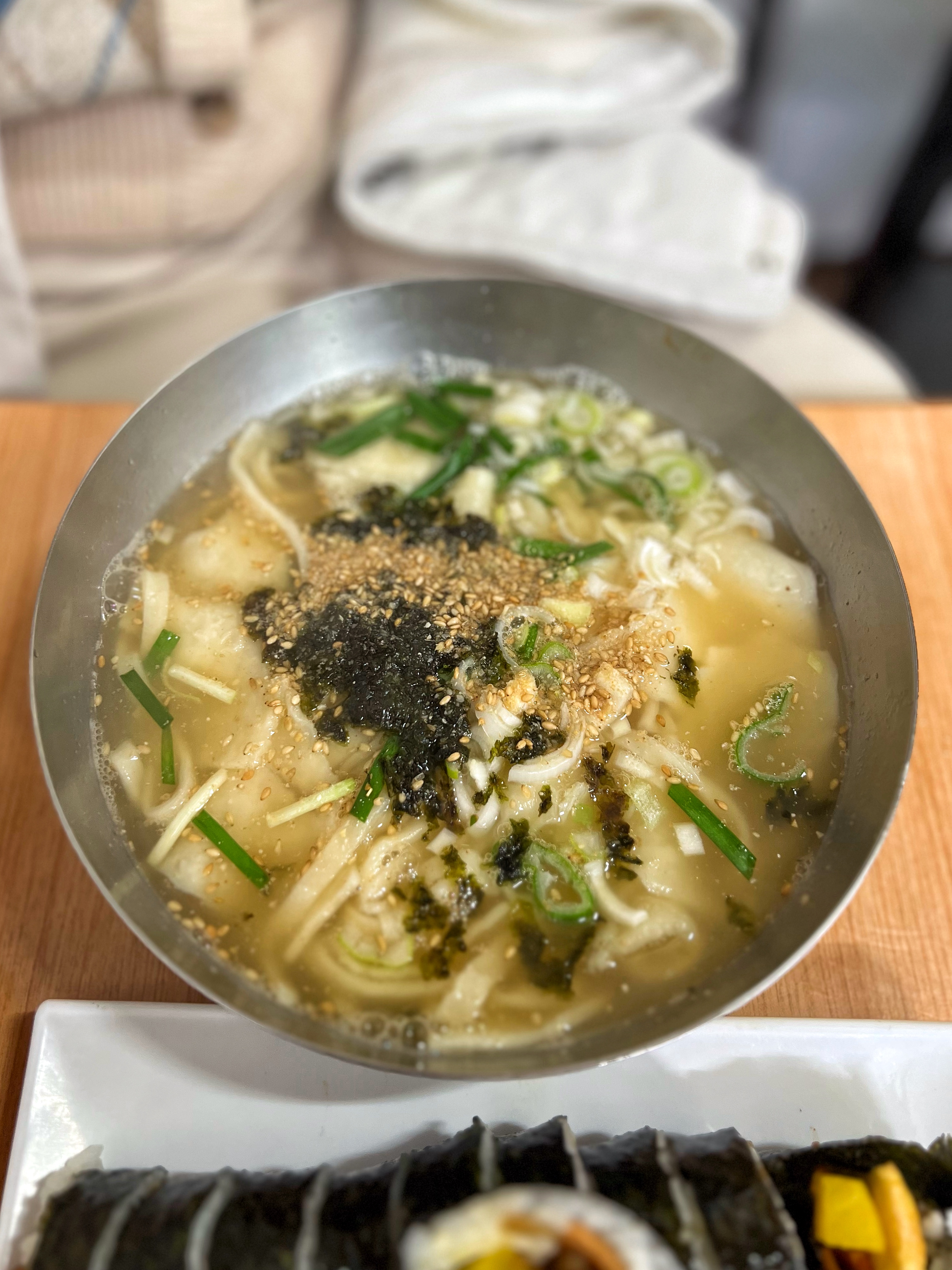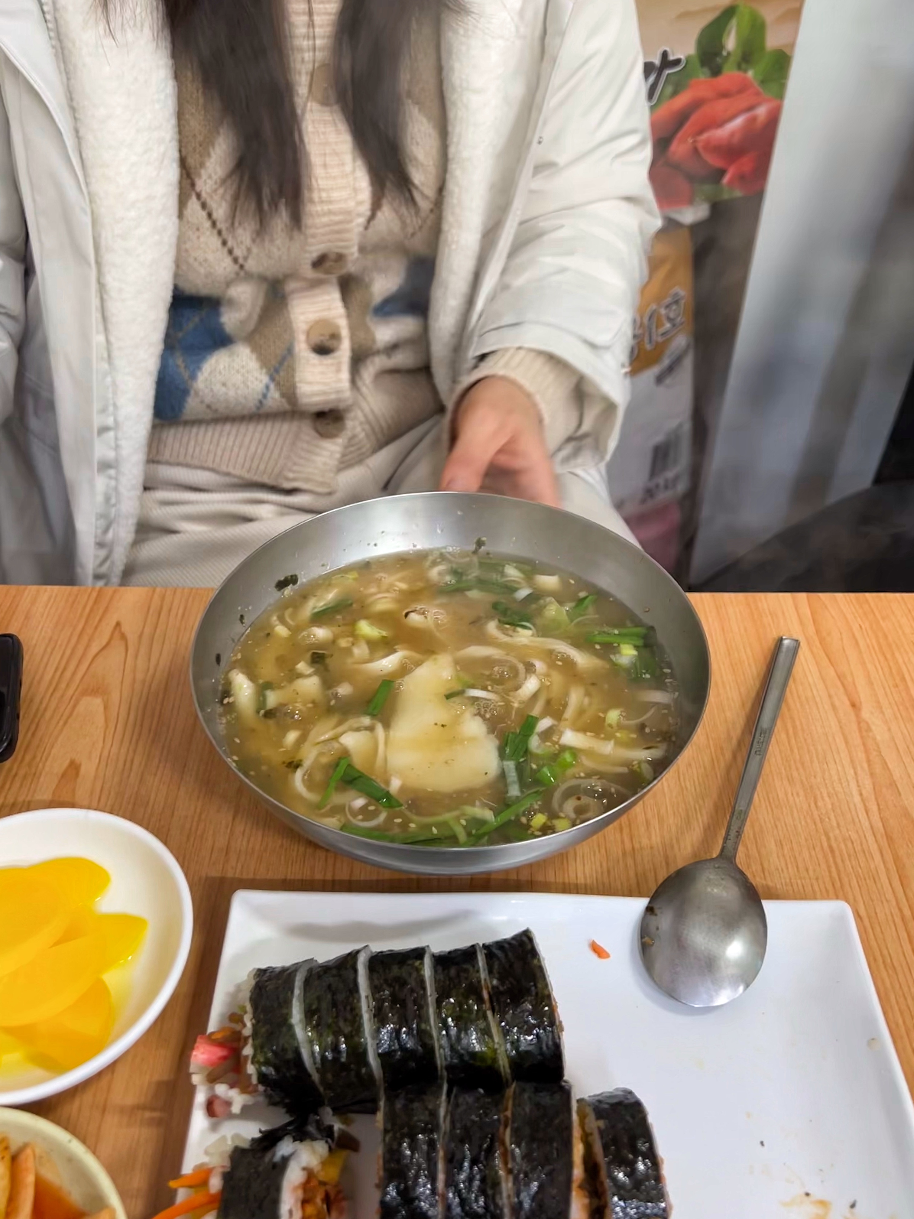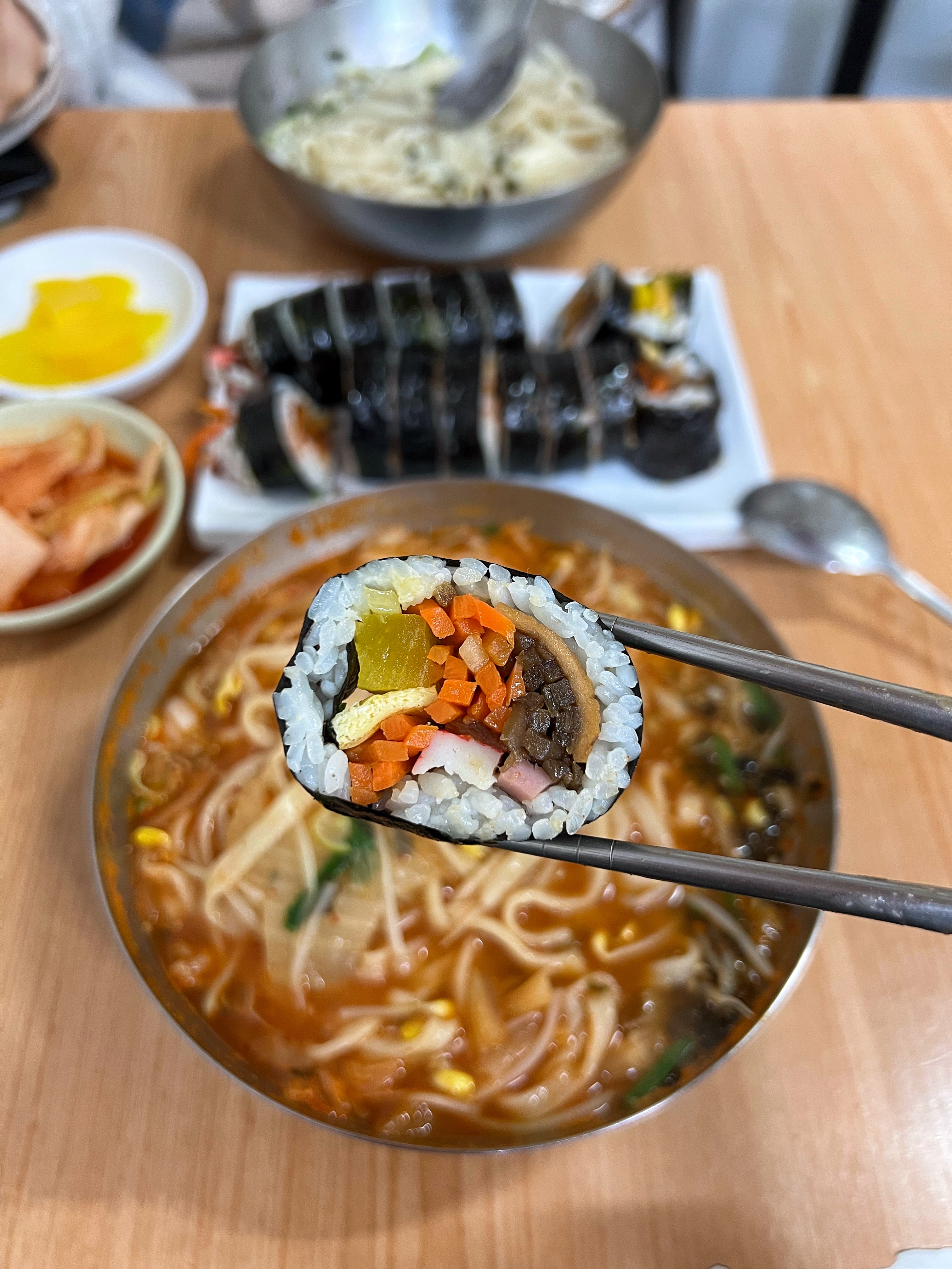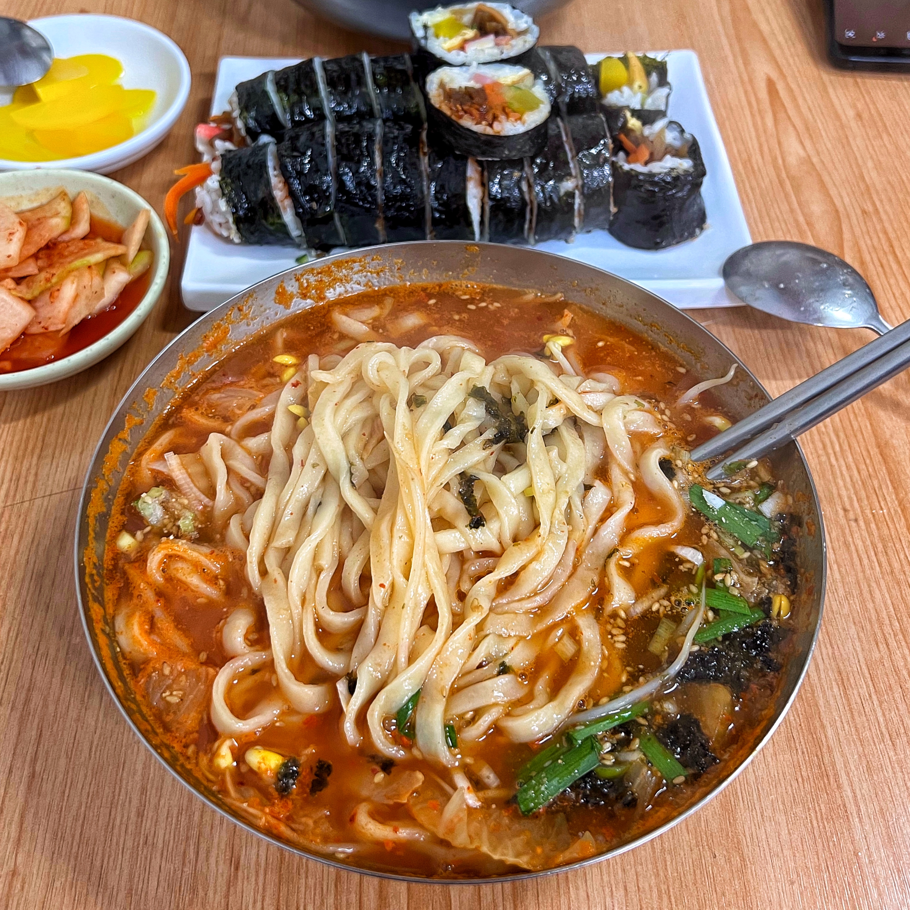 우리가 주문한 메뉴는 다 해서 1만원. 가장 가격이 저렴한 기본 김밥과 칼국수를 주문했으면 2인에 8,000원이다. 아무리 분식이라지만 요즘 세상에 이 가격으로 먹을 수 있는 곳이 얼마나 있을까. 최근에 서울은 칼국수 1만원 시대를 열었다는 기사도 봤다.