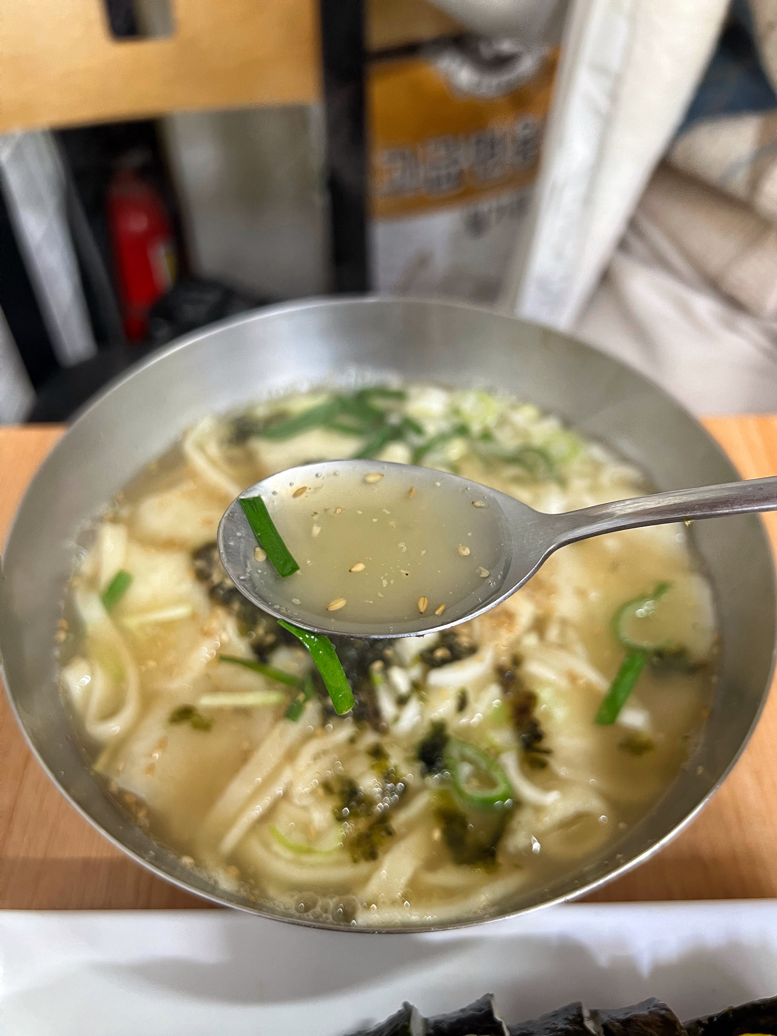 국물 속에 숨어 있는 칼국수면을 저어주니 양이 얼마나 되는지 드러난다. 칼국수 양이 상당히 많다.
