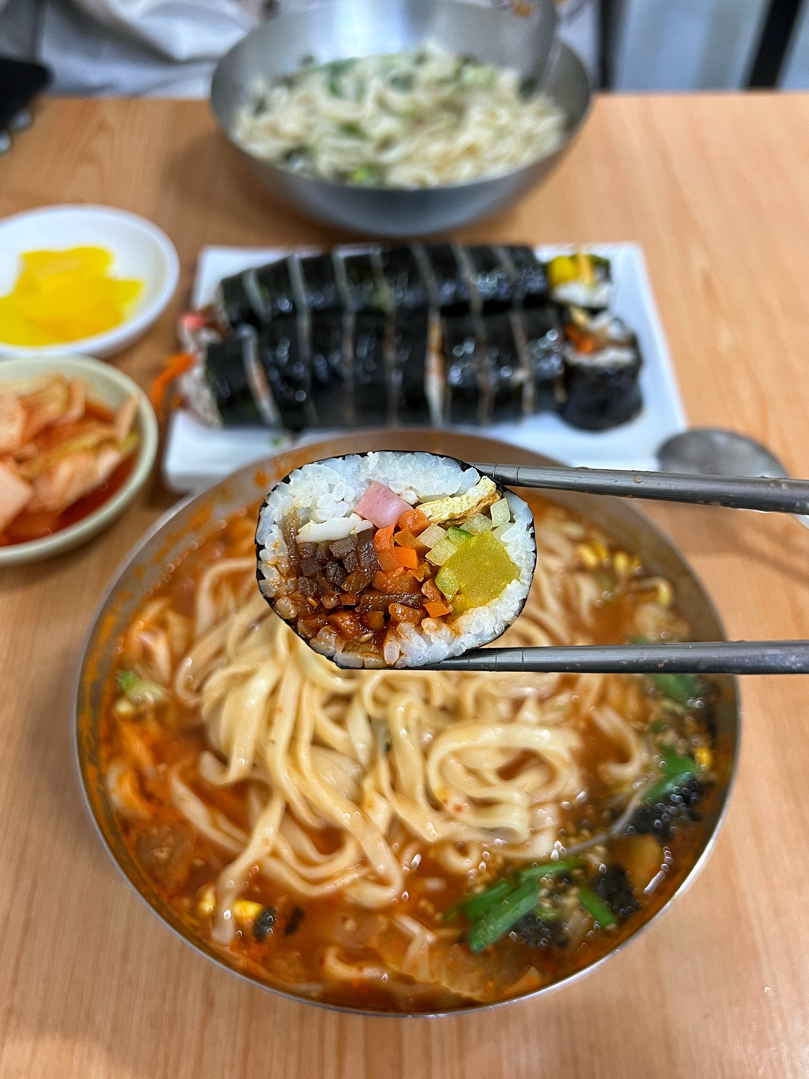 메뉴를 보고 일반김밥과 매운김밥 그리고 칼제비와 얼큰이칼국수를 주문했다. 주문한 김밥을 먼저 내어주던데 김밥이 통통하다.