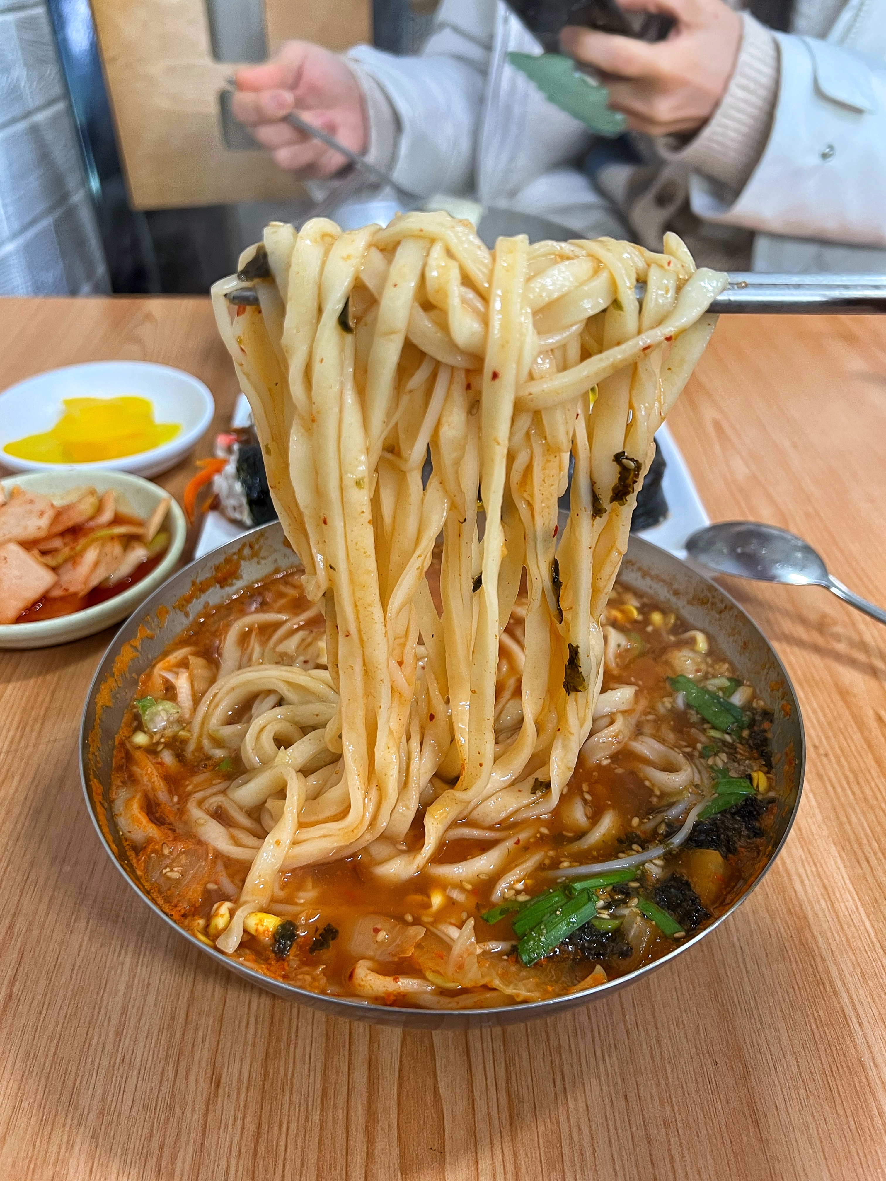 면발은 쫀득쫀득 부드럽고, 국물은 신김치의 새콤한 맛이 은근하면서도 얼큰하다. 테이블에 다진 청양고추가 있으니 더 맵게 먹고싶다면 넣어서 먹어도 되겠다. 얼큰한 국물인데 콩나물 덕분인지 시원하기도 하다. 전분이 우러나 좀 걸쭉하긴해도 이런 국물이라면 해장하기에도 좋을 것 같다.