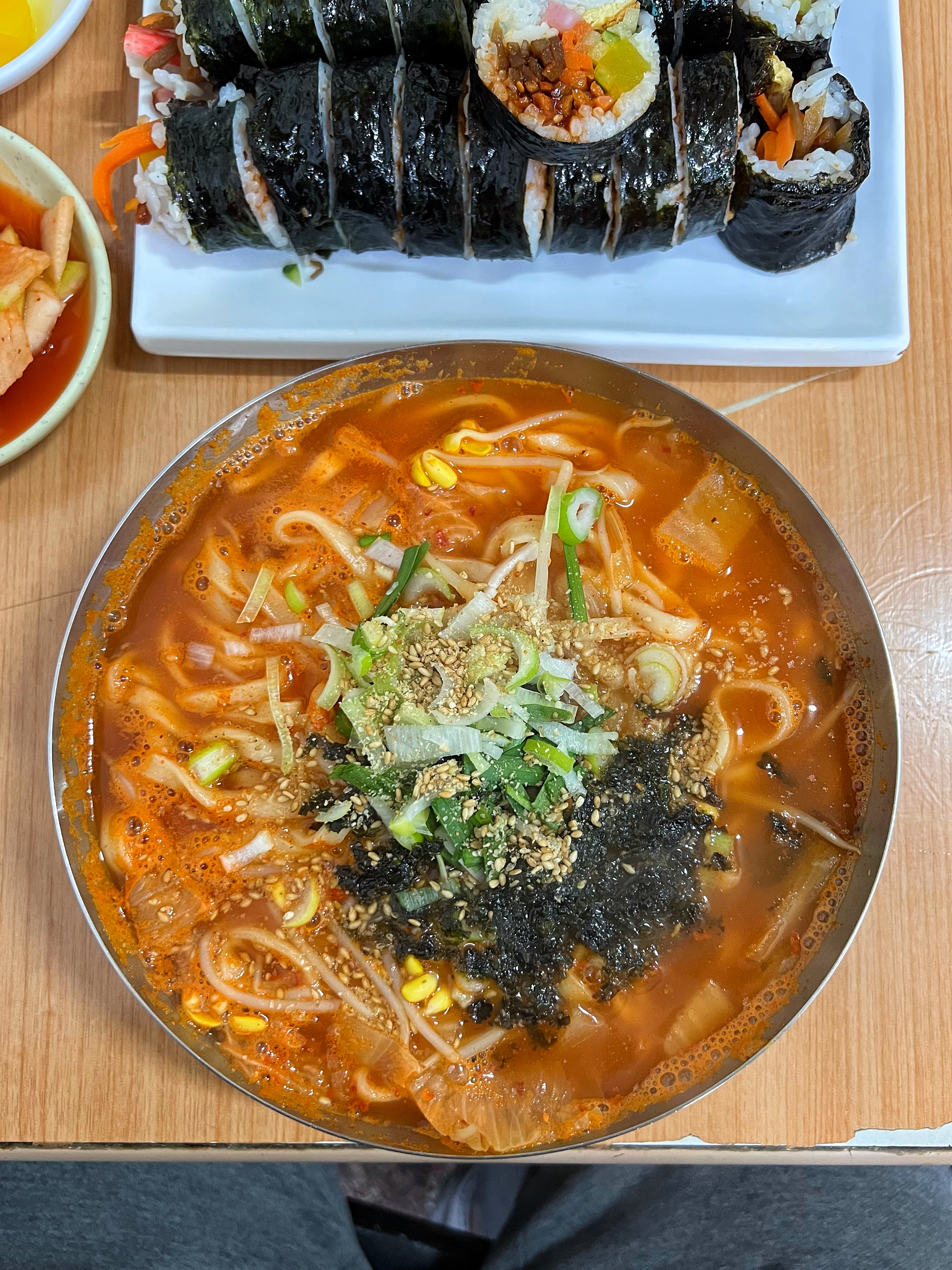 내가 주문한 얼큰이칼국수. 가운데 조미김과 대파, 깨소금외에 빨간 국물을 보면 콩나물과 김치도 보이는게 김치칼국수라고 불러도 좋을 것 같다.