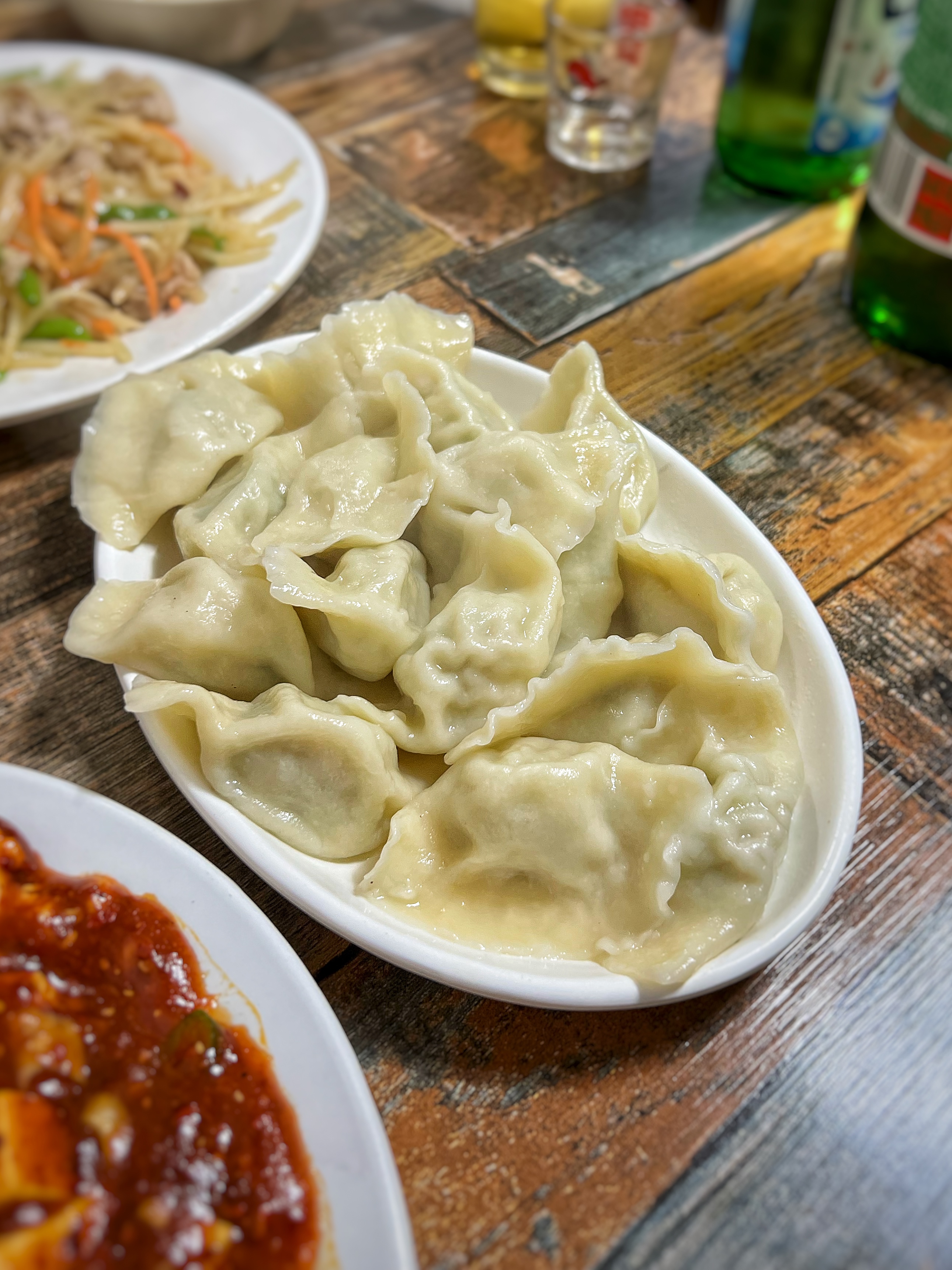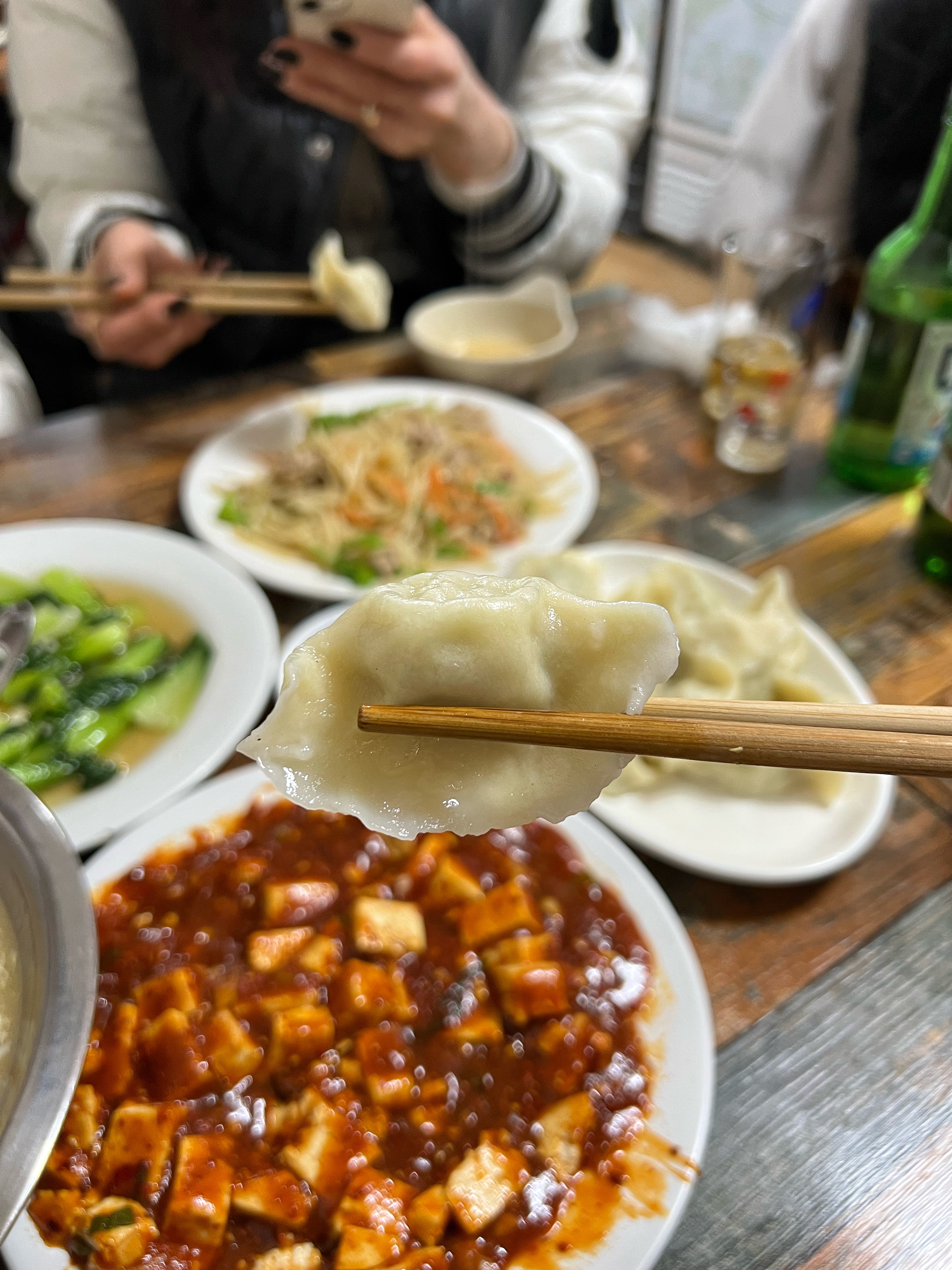 우리는 네 명이서 먹고싶은 메뉴 하나씩 주문했다. 마파두부, 토마토계란탕, 청경채볶음, 감자채볶음. 그리고 공통의견으로 백김치 돼지고기만두도 하나 주문했다. 군만두, 찐만두, 물만두 중에 어떤 만두가 나올지 궁금해하며…