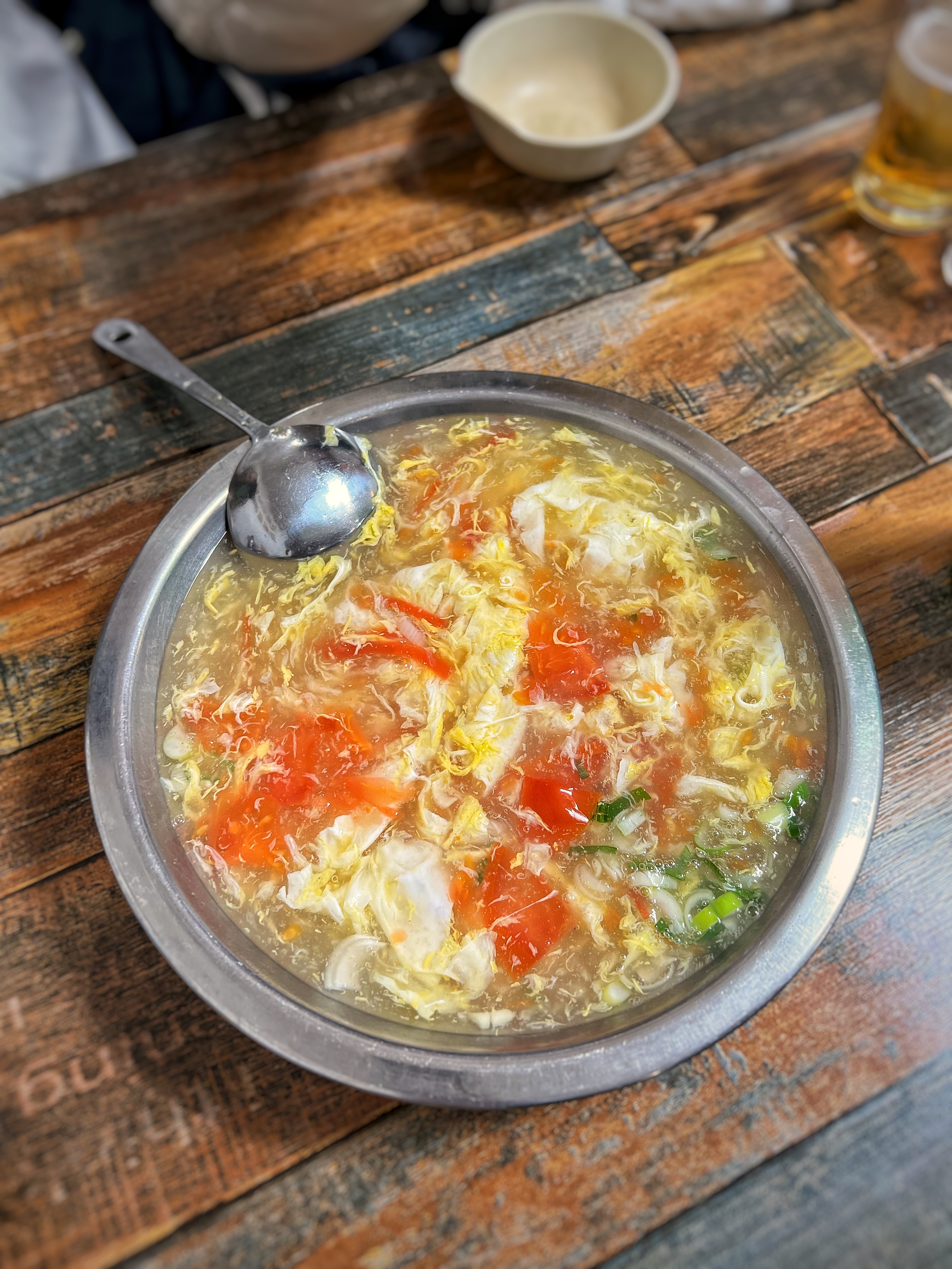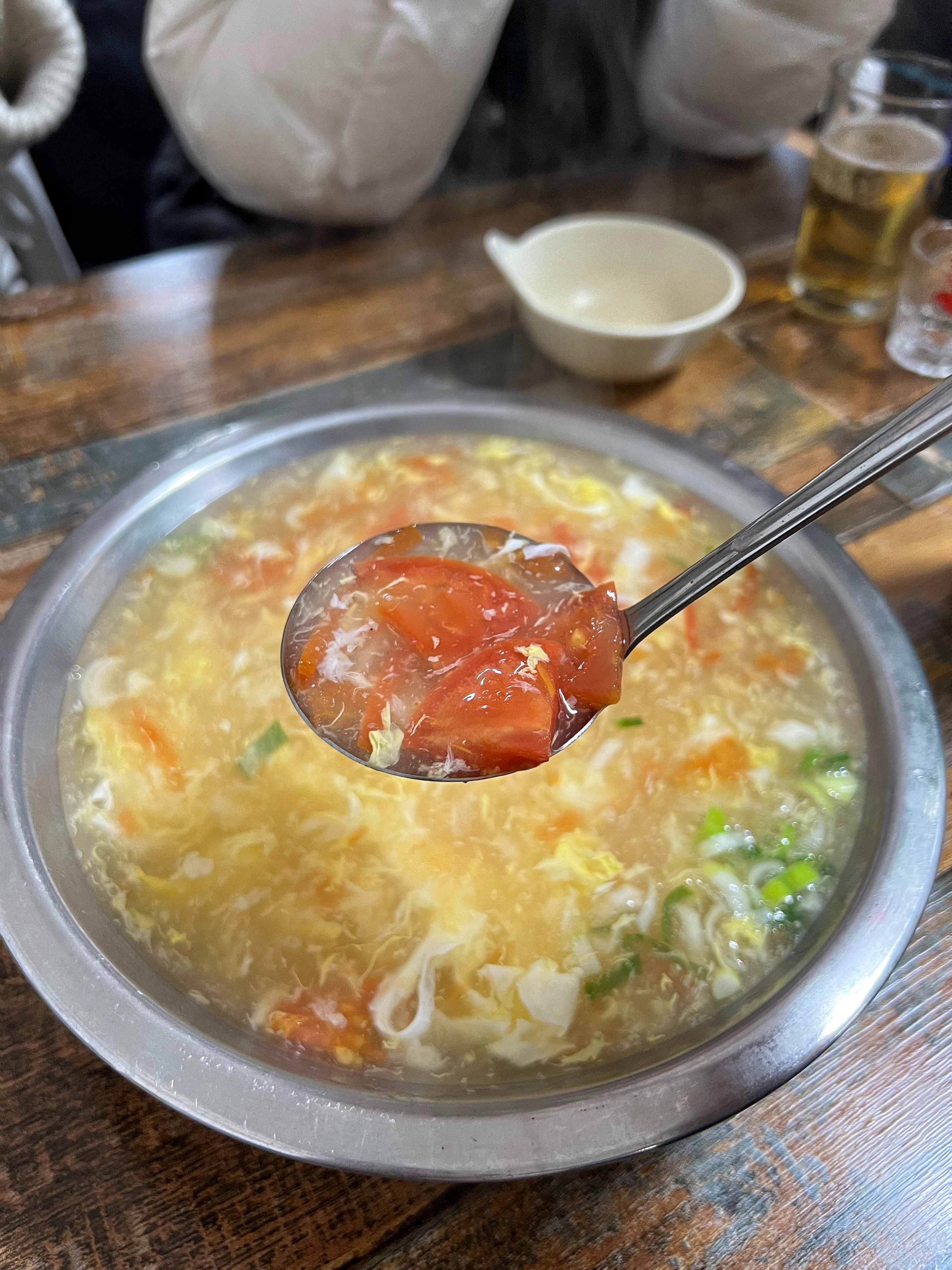 내가 주문한 토마토계란탕이 먼저 나왔다. 토마토와 식초의 새콤한 산미와 함께 계란 특유의 비릿한 냄새가 있어 호불호가 있을 수 있겠다. 토마토계란볶음과 탕을 고민하다가 탕으로 주문했는데, 다음에는 볶음으로 주문할 것 같다.