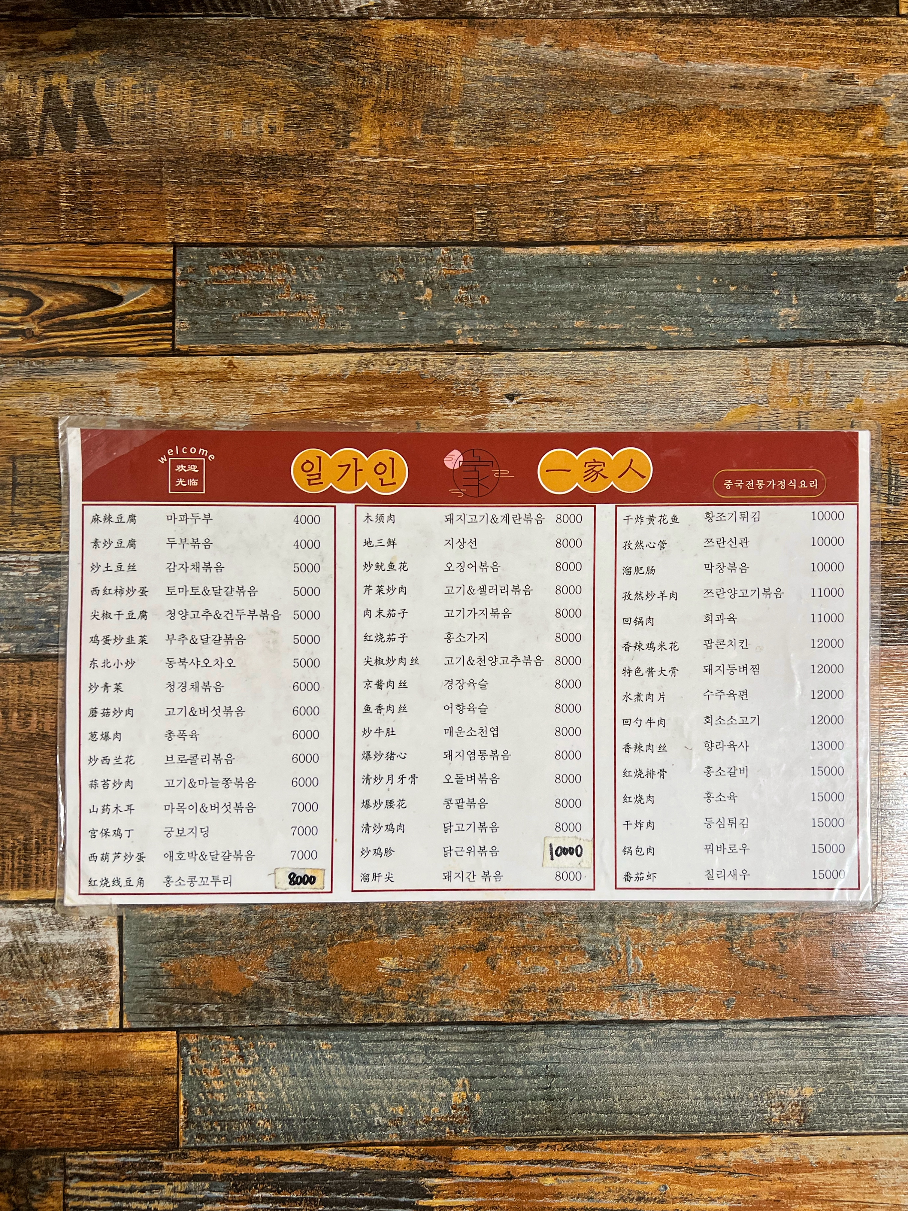 일가인 우리집 메뉴판