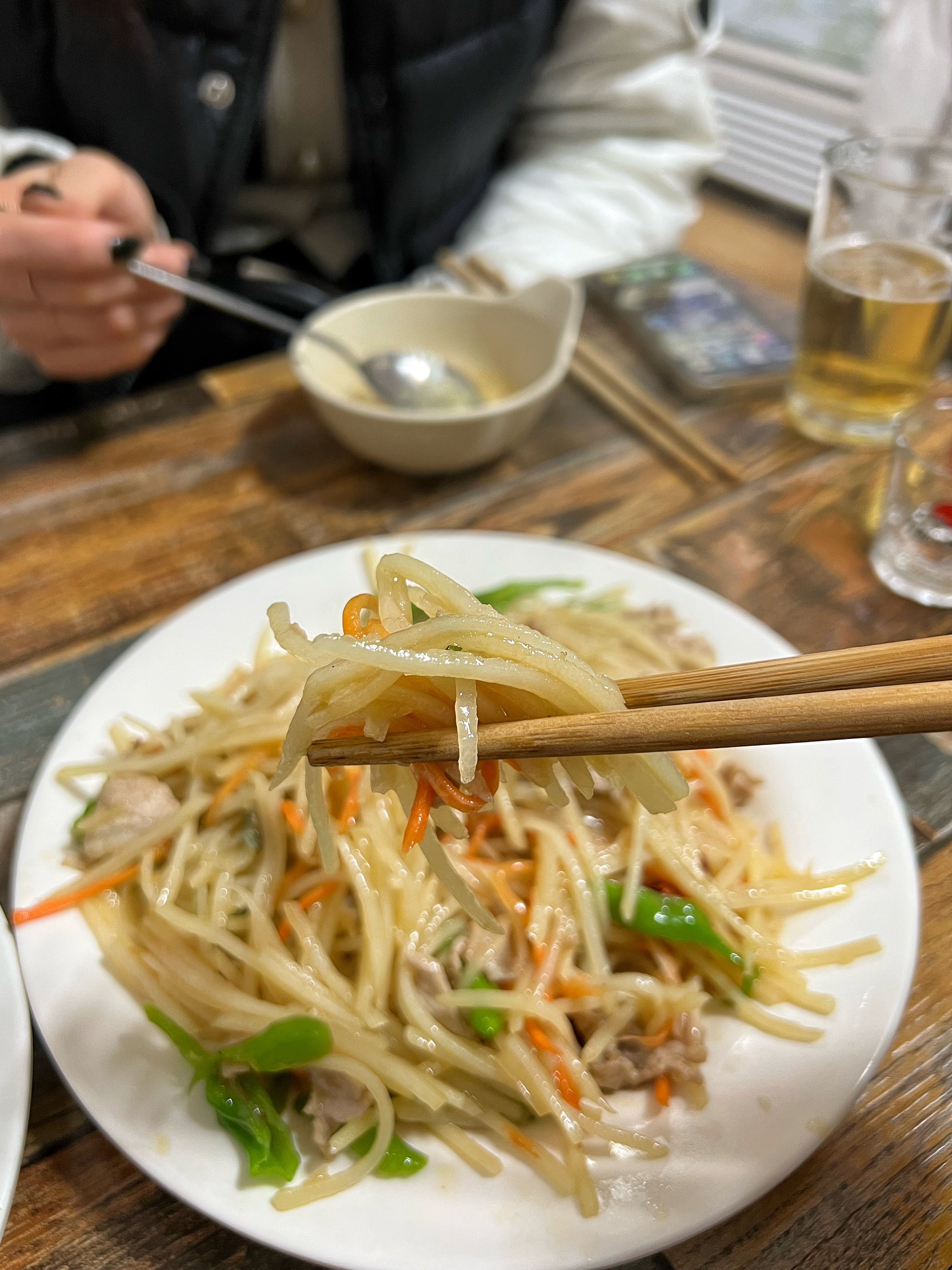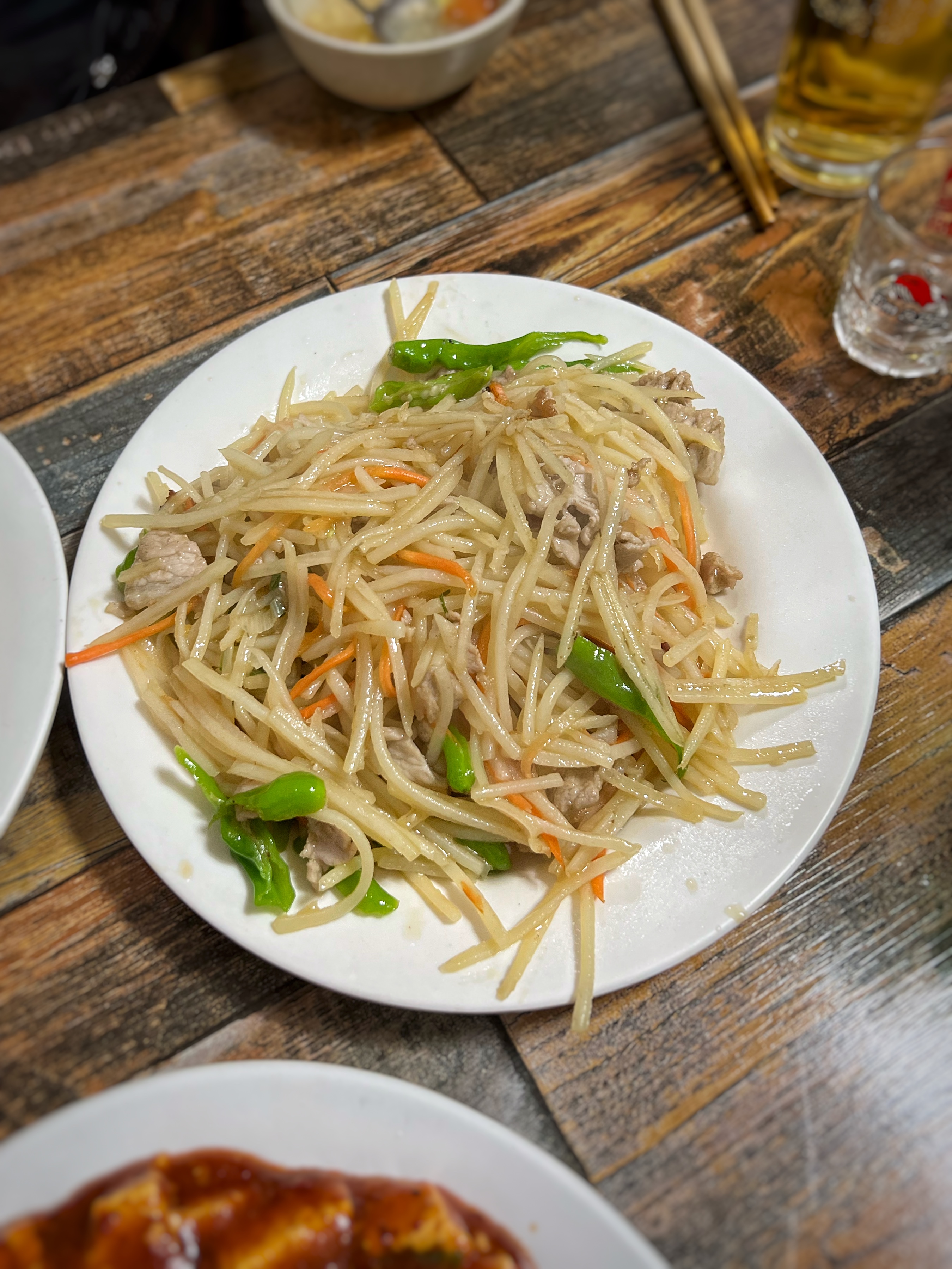 얇게 썬 감자와 돼지고기, 고추, 당근을 함께 볶았다.