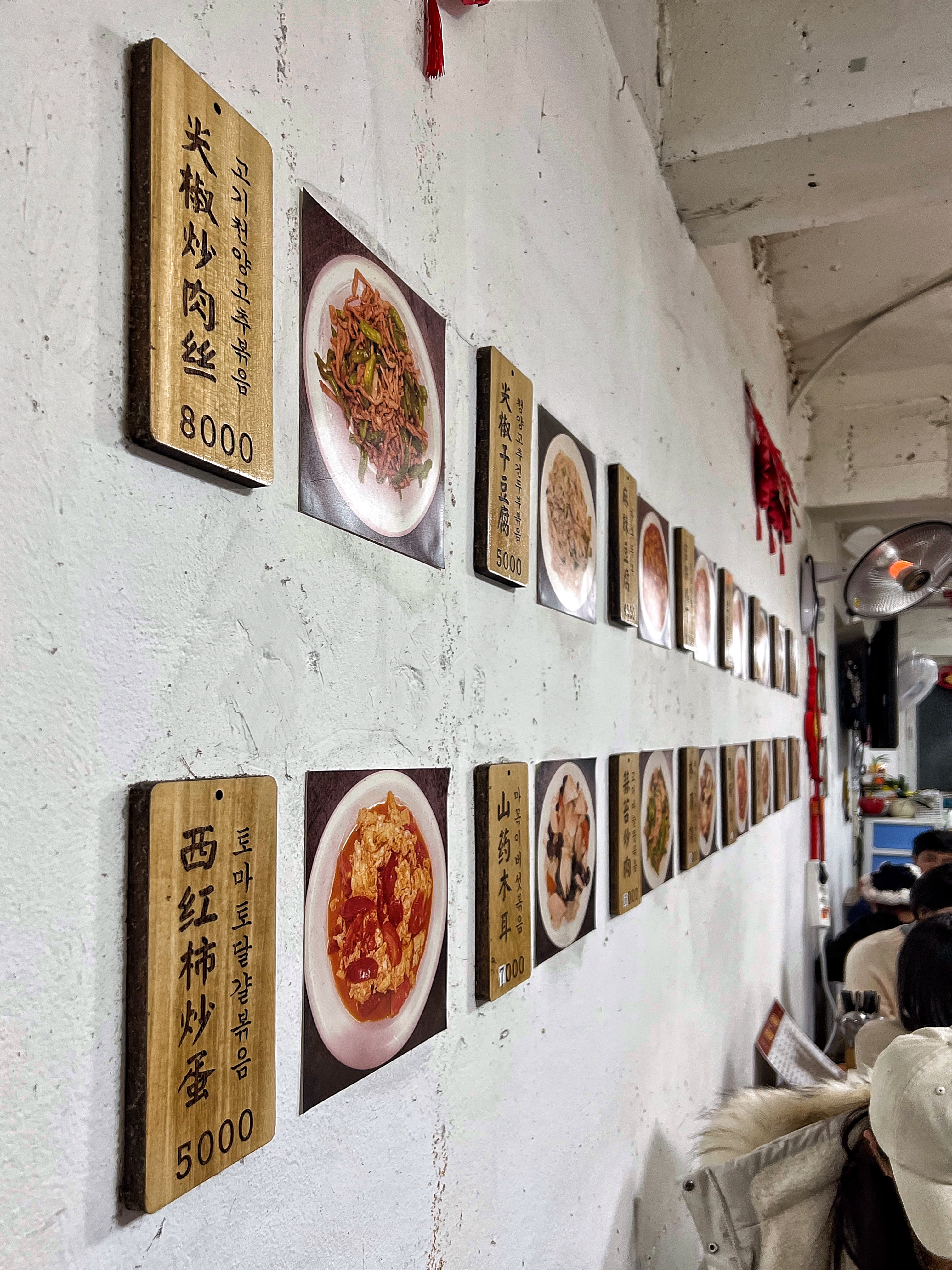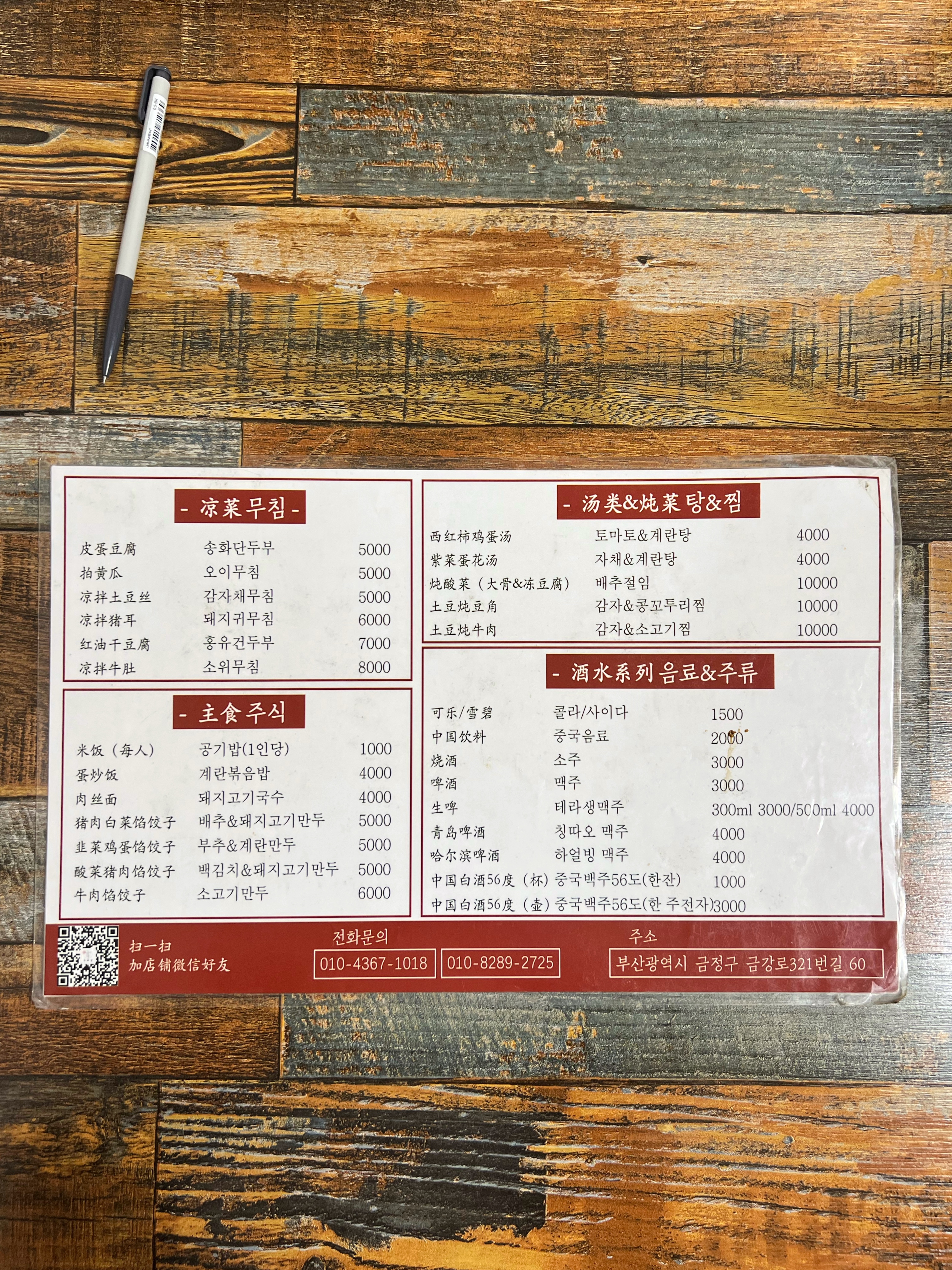 테이블에 올려져 있는 메뉴판. 앞뒤로 65개의 메뉴가 적혀있었다. 메뉴를 살펴보니 가격 참 착하다. 4,000원에서 15,000원으로 가격이 형성되어 있는데 누구나 부담없이 배불리 먹을 수 있을 것 같다. 서두에 중국인 유학생들을 위한 집이라는 건 그런 뜻에서 한 말이다.