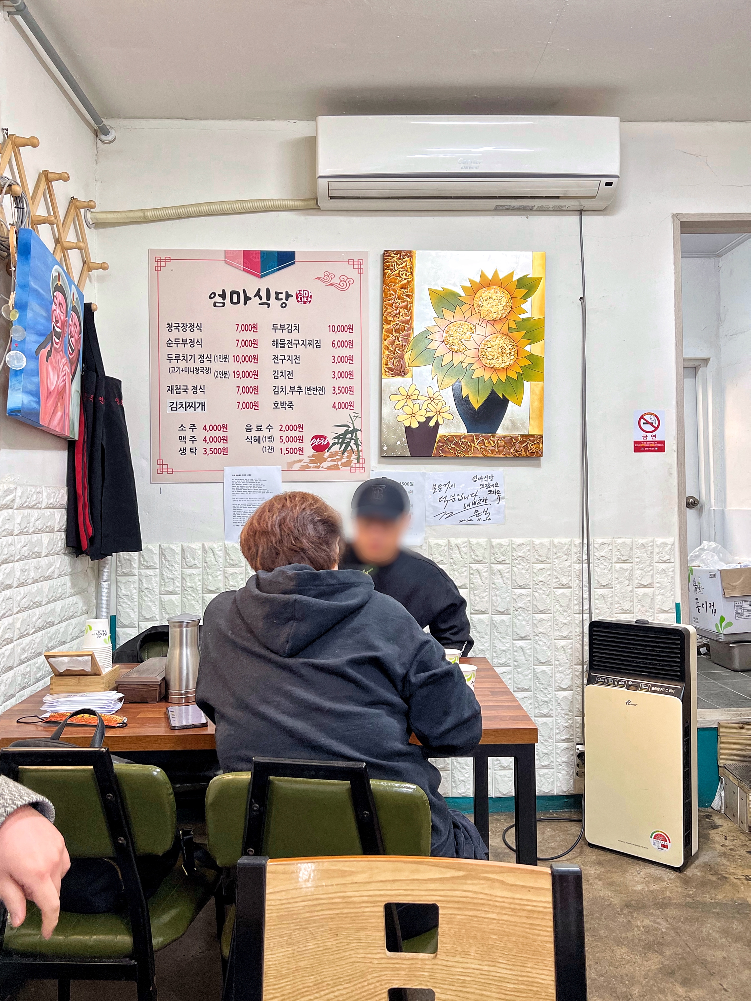 포스팅의 주인공인 엄마식당으로 다시 돌아와서, 가게에 들어서니 청국장 냄새로 가득하다. 대표메뉴는 냄새로 미루어보아 청국장이겠지만, 두루치기정식을 주문하면 청국장이 함께 나온다. 만약 방문한 사람이 세명이라면 두루치기정식 2인과 순두부 1인을 주문해 골고루 맛봐도 좋겠다.